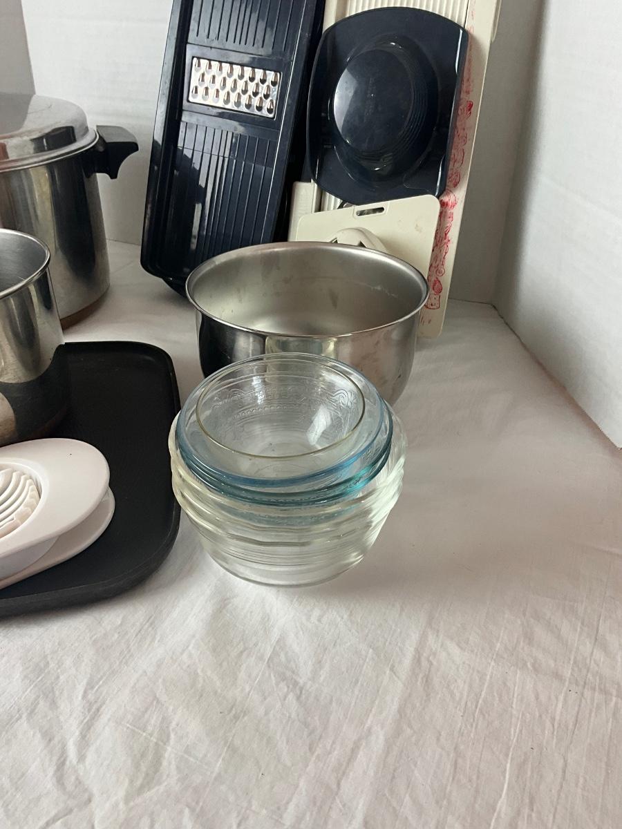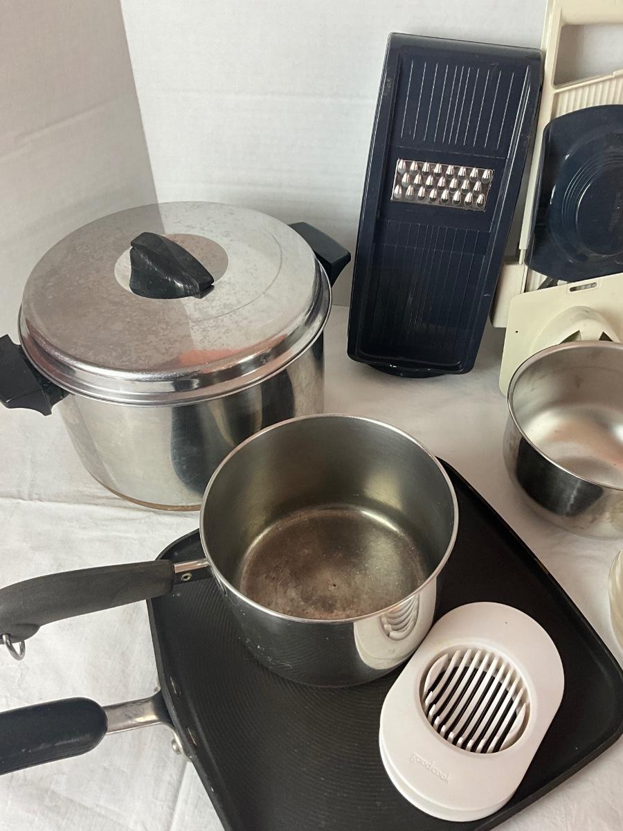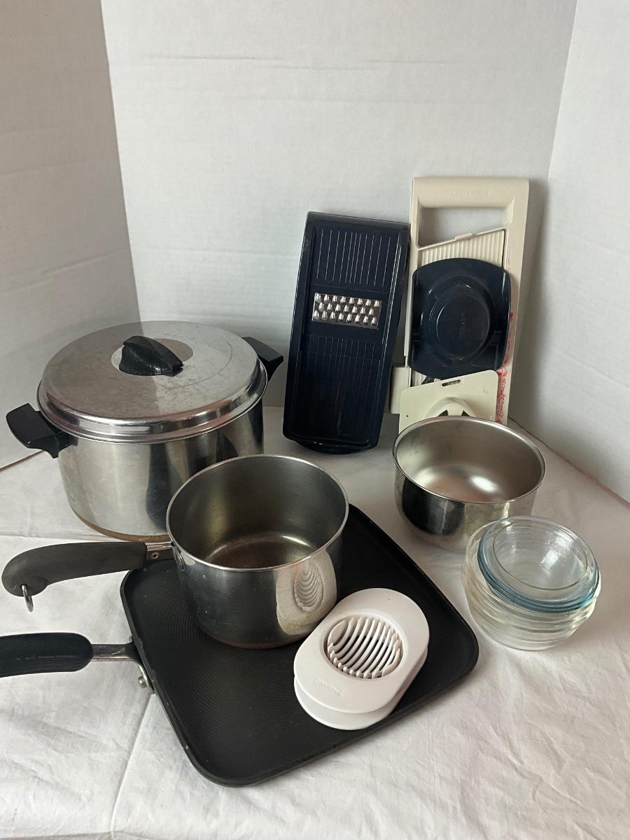 Revere 6qt w/lid pot, 2qt square pan, Leifheit mandolin, food grater, Circulon 10" griddle, prep bowls, etc...?