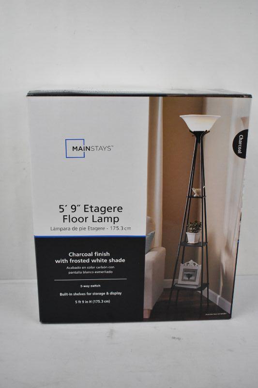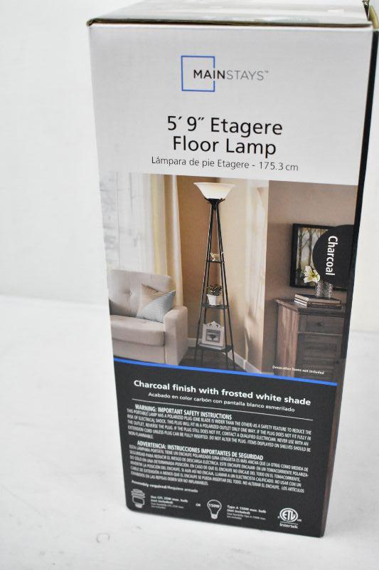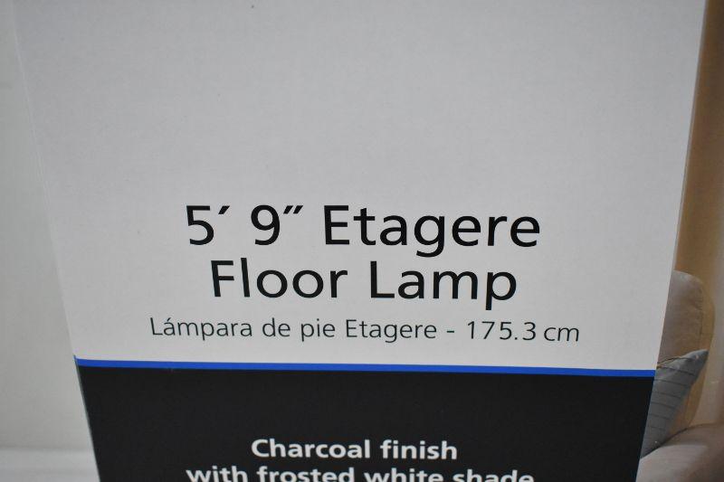 5'9" Floor Lamp, Charcoal Finish w/ Frosted White Shade, Built-in Shelves - New