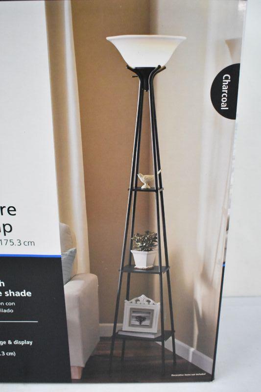 5' 9" Floor Lamp, Charcoal Finish with Frosted White Shade, 3-Way Switch, Built-in Shelves - New