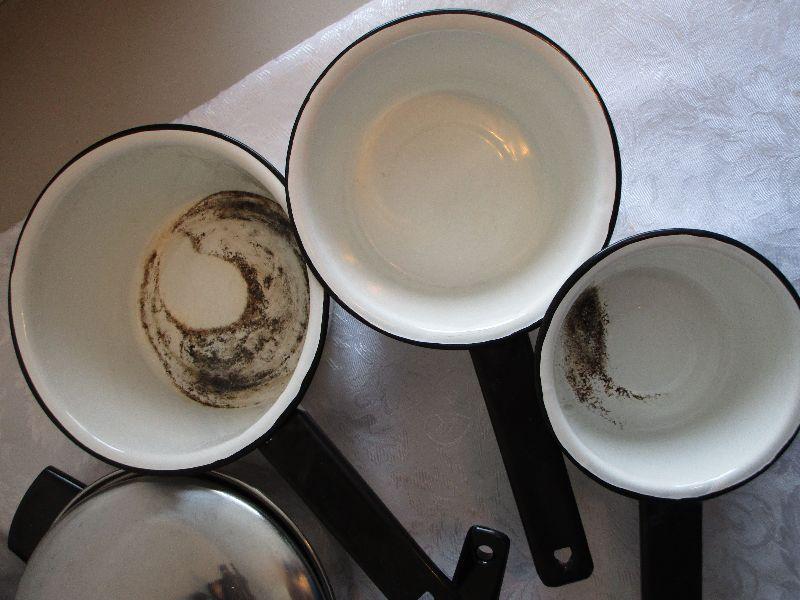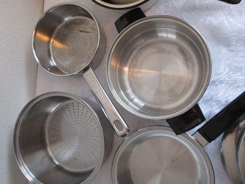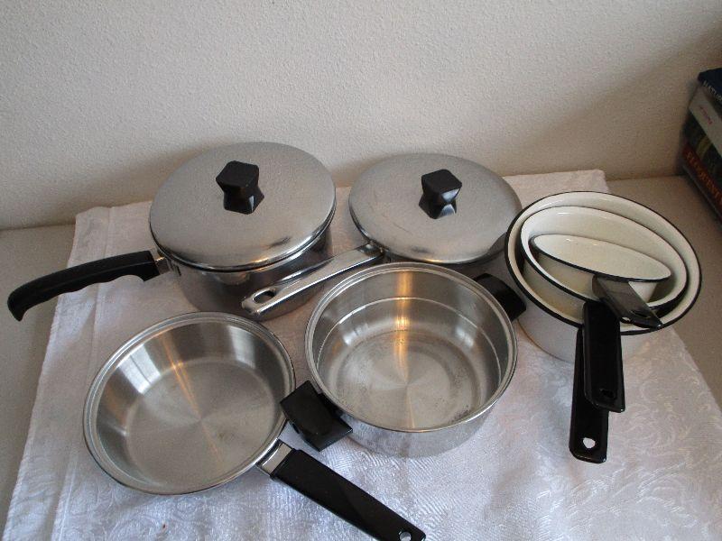 Three white enamel pans, 1-5", 6", 7"; Three Stainless Steel Pans, 1-5", 2-7", One Steamer pan 7", Two 7" lids