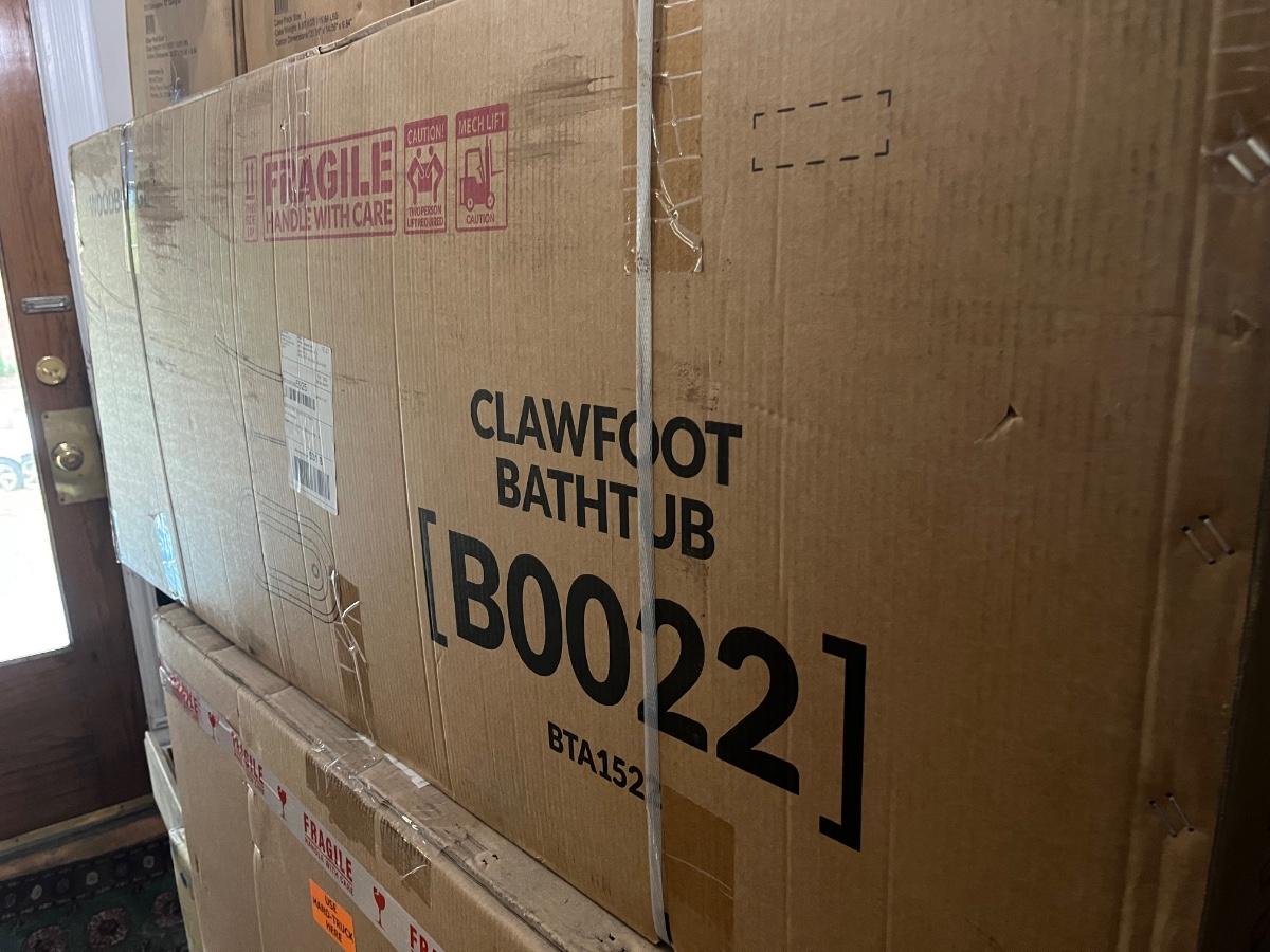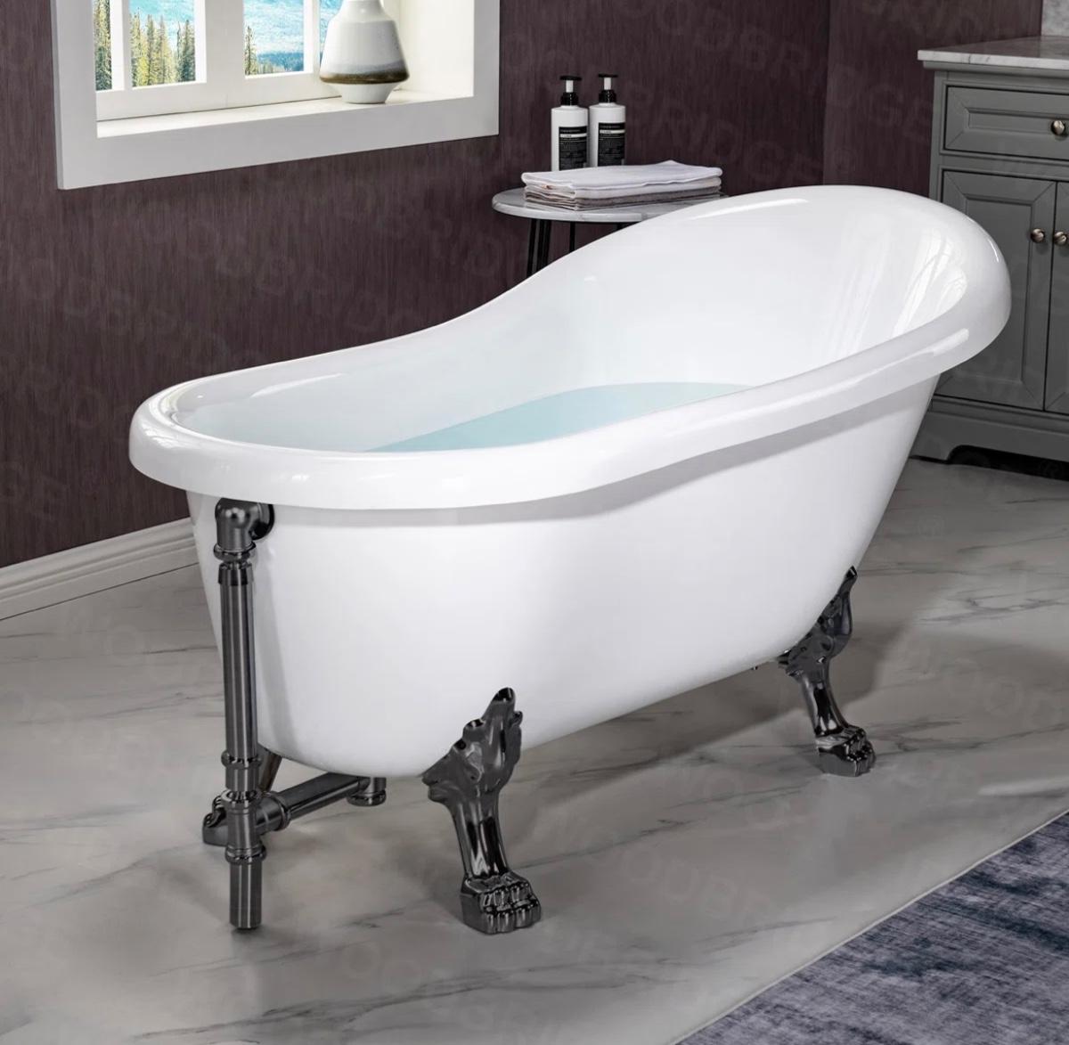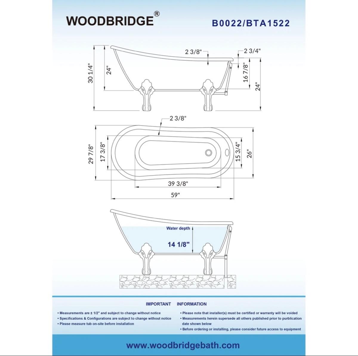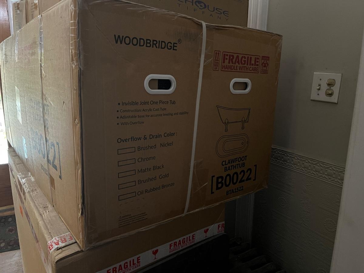 Brand new in box WoodBridge 59” x 31” Clawfoot soaking acrylic bathtub. Oil rubbed bronze in color.