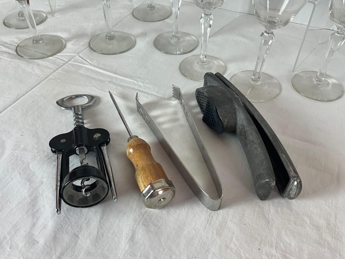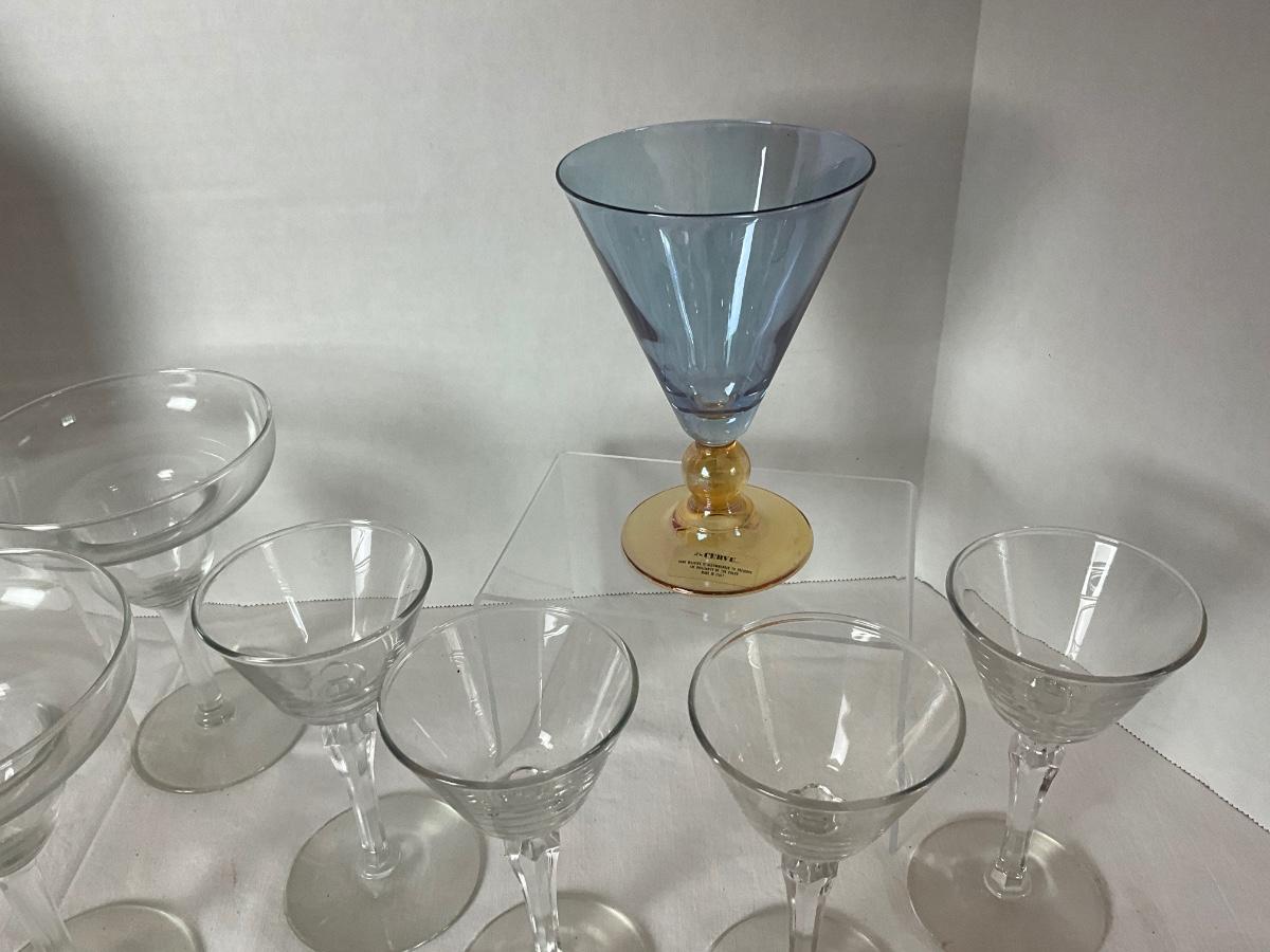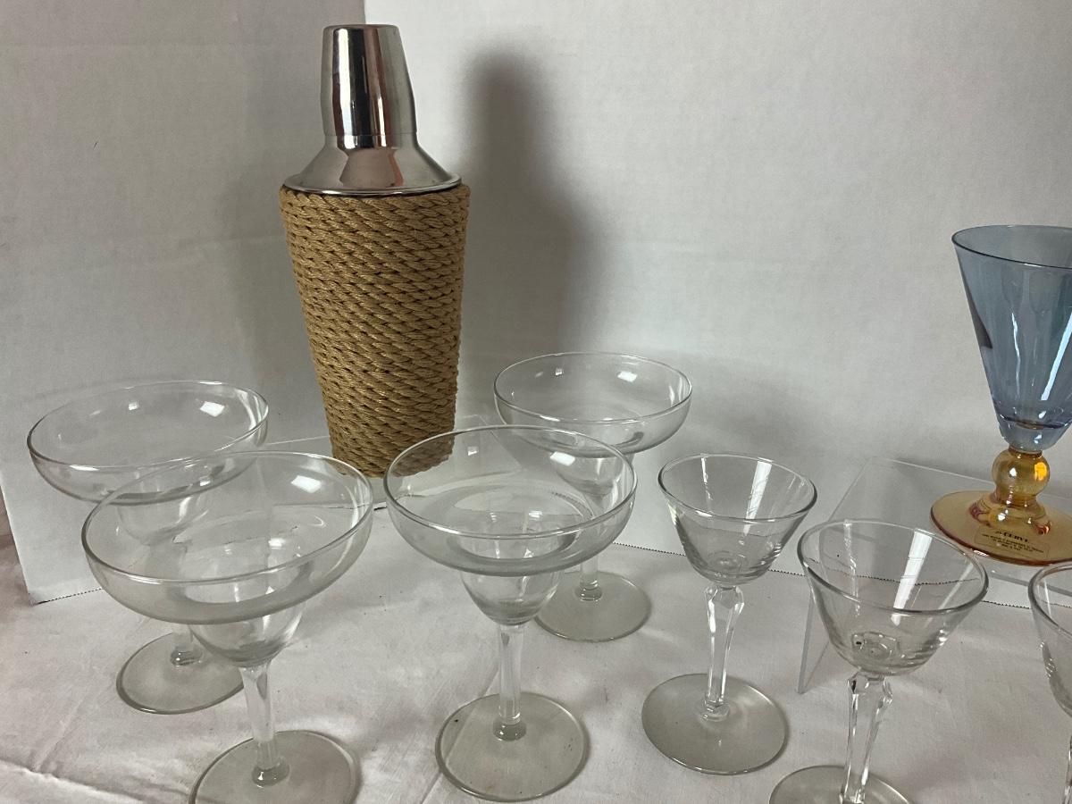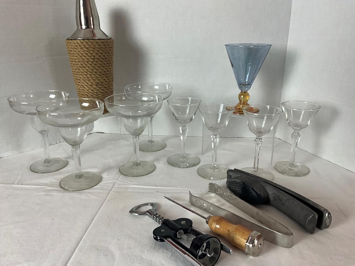 Cocktail Party LOT to include: 1 Serve Italian cocktail glass, 4 clear martini glasses, 4 daiquiri/margarita glasses, ice pick, lemon juicer, drink shaker, wine opener & ice tongs.