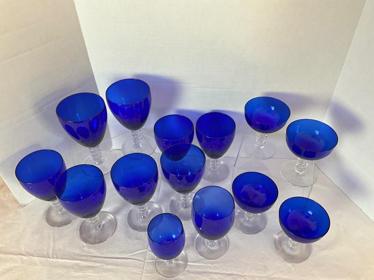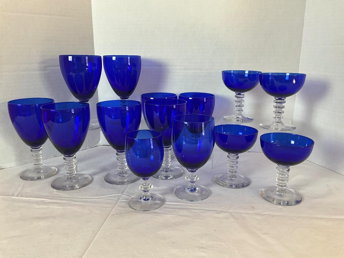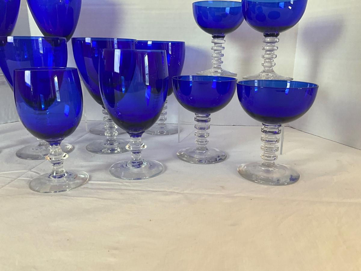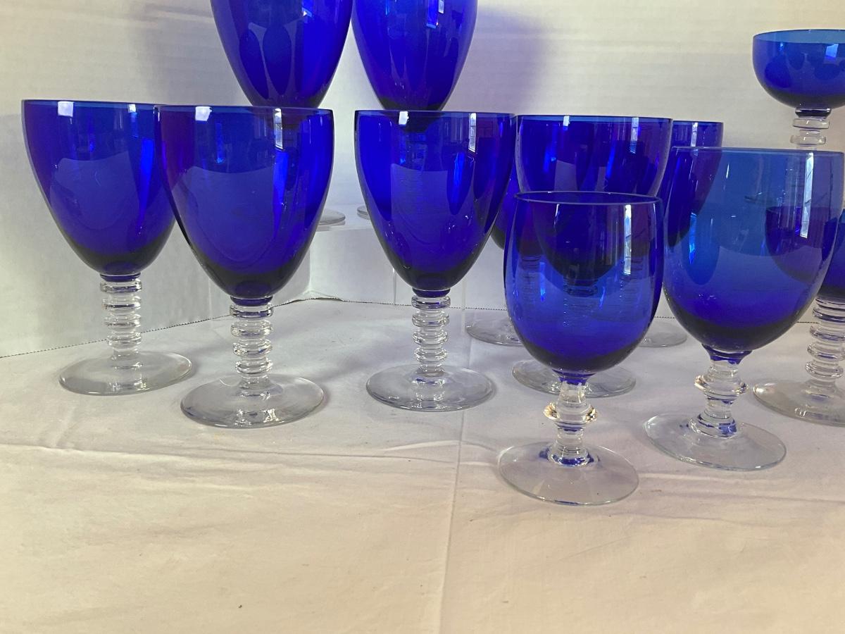 Cobalt Stemware Glasses to include: 8 goblet-6" & 7" x 3.5" diameter, 4 cocktail 4"H x 3.5" diameter, 1 water 5.25"H x 3" diameter, 1 juice 5"H x 2.5" diameter. ATB Morgantown or Cobalt Compay