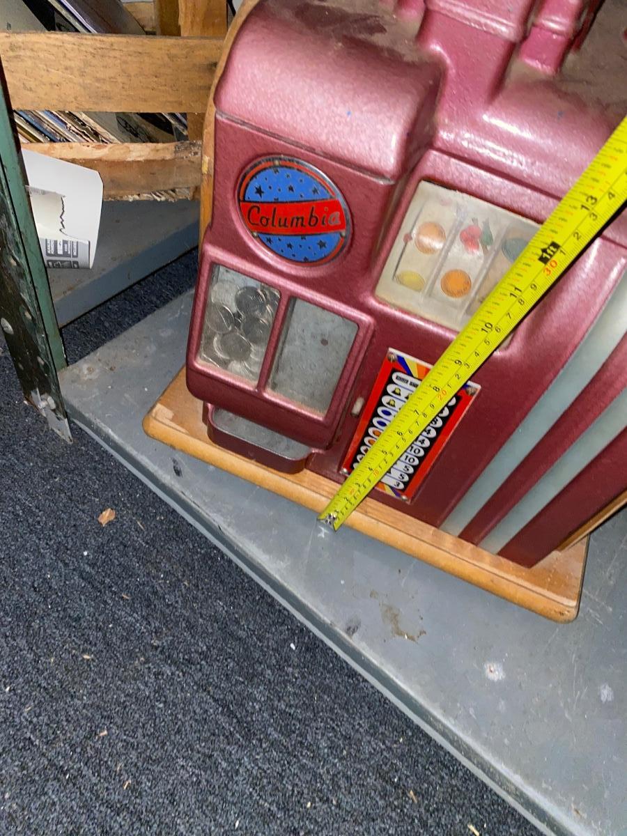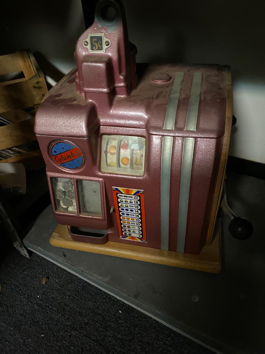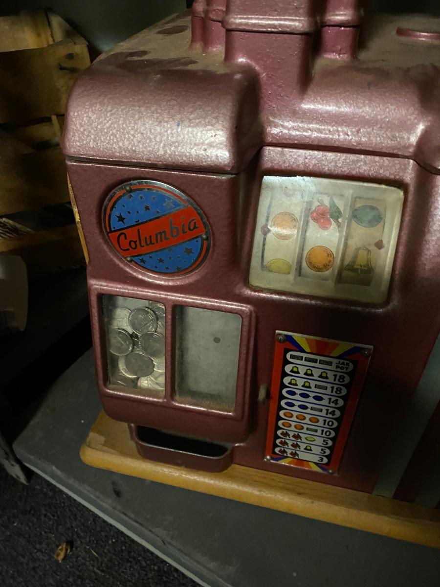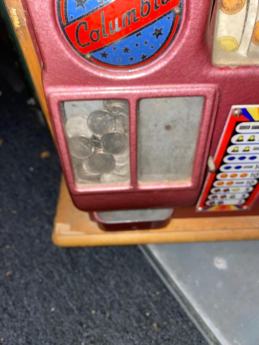 5-Cent Columbia Slot Machine. THis actually comes with some money! Is NOt in working condition so will need to be repaired, or you can just keep it as a conversation piece. Pretty sure you'll be the only one on the block (in town?) with one! Approx 19x14
