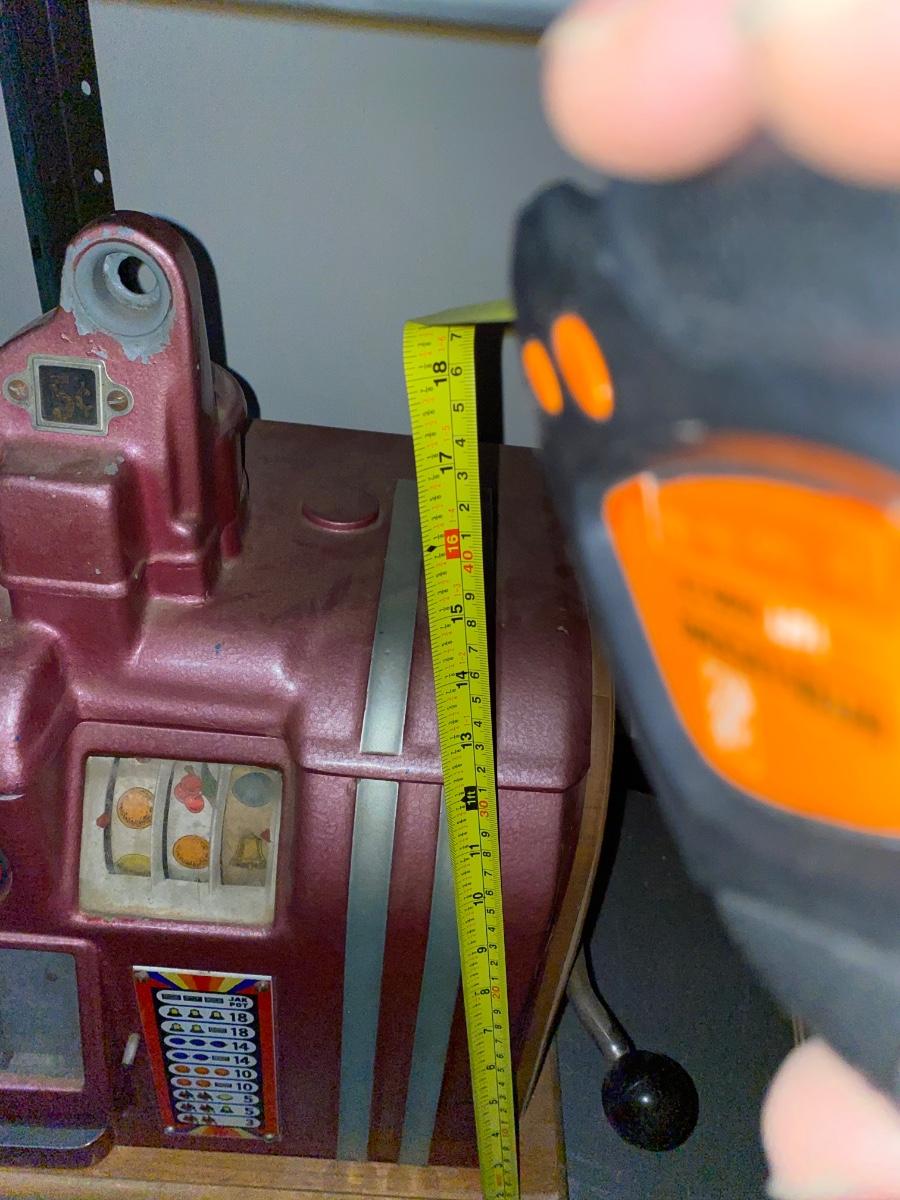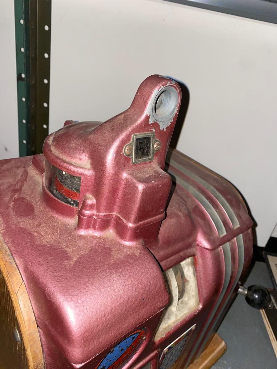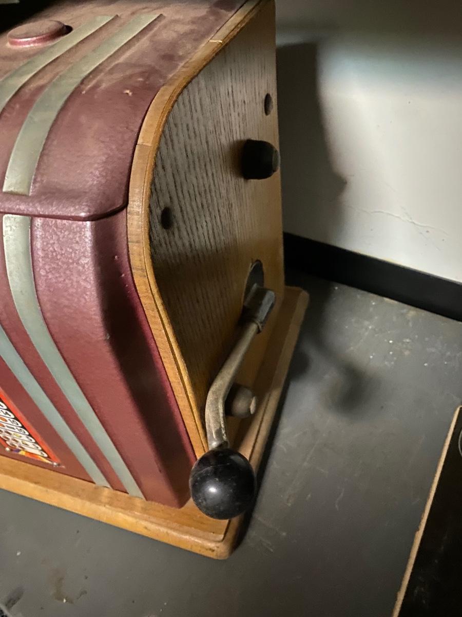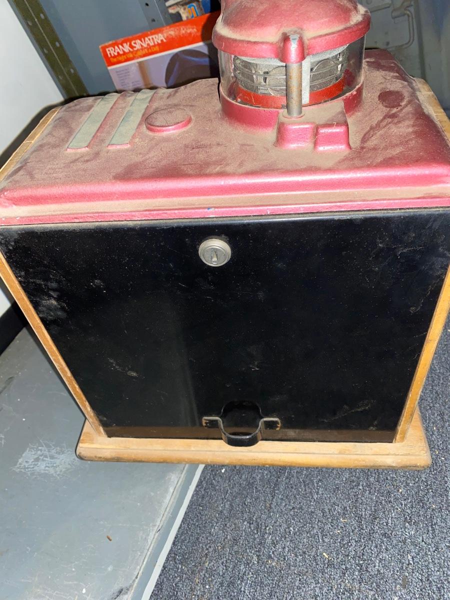 5-Cent Columbia Slot Machine. THis actually comes with some money! Is NOt in working condition so will need to be repaired, or you can just keep it as a conversation piece. Pretty sure you'll be the only one on the block (in town?) with one! Approx 19x14