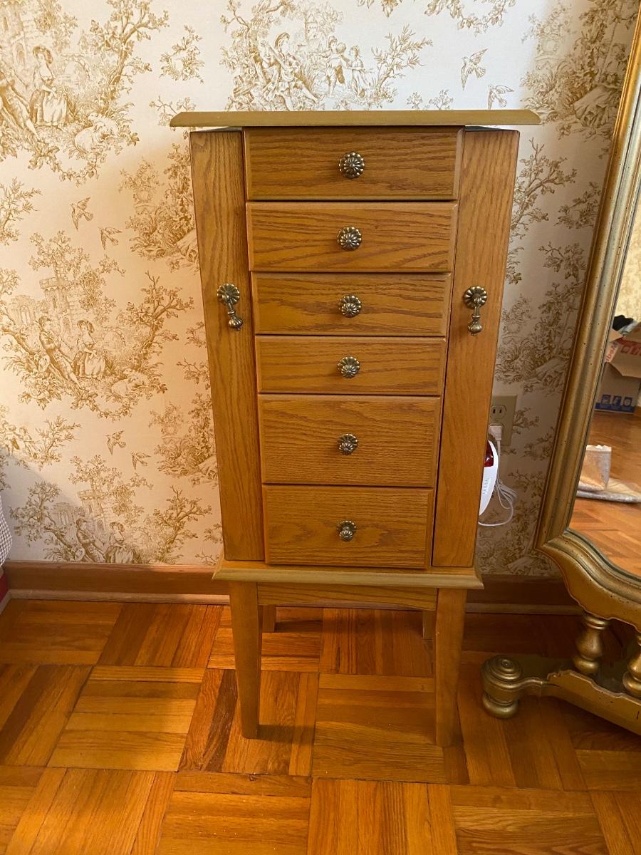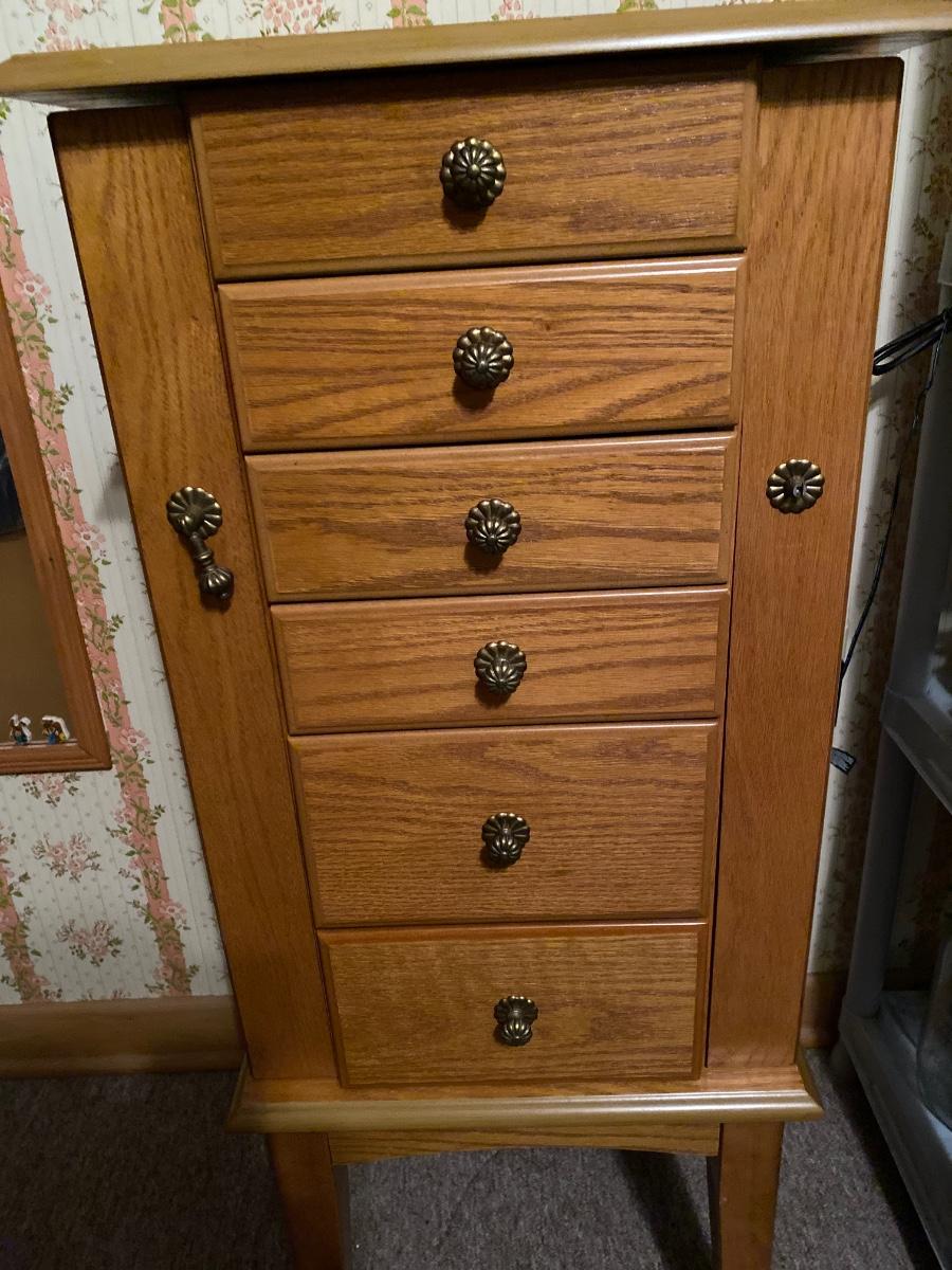5-drawer & 2 door jewelry armoire, velvet lined. Approx 16-1/2w x 12-1/2d x 40-1/2h. One pull is off but we have the pull and it can be glued on. Otherwise in very good condition.