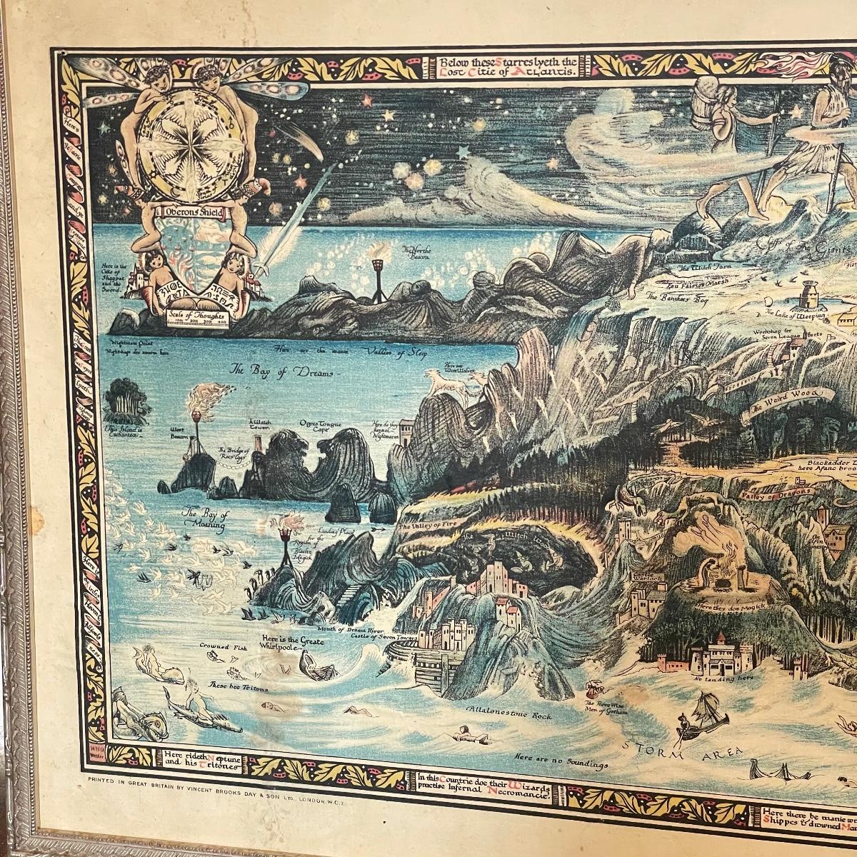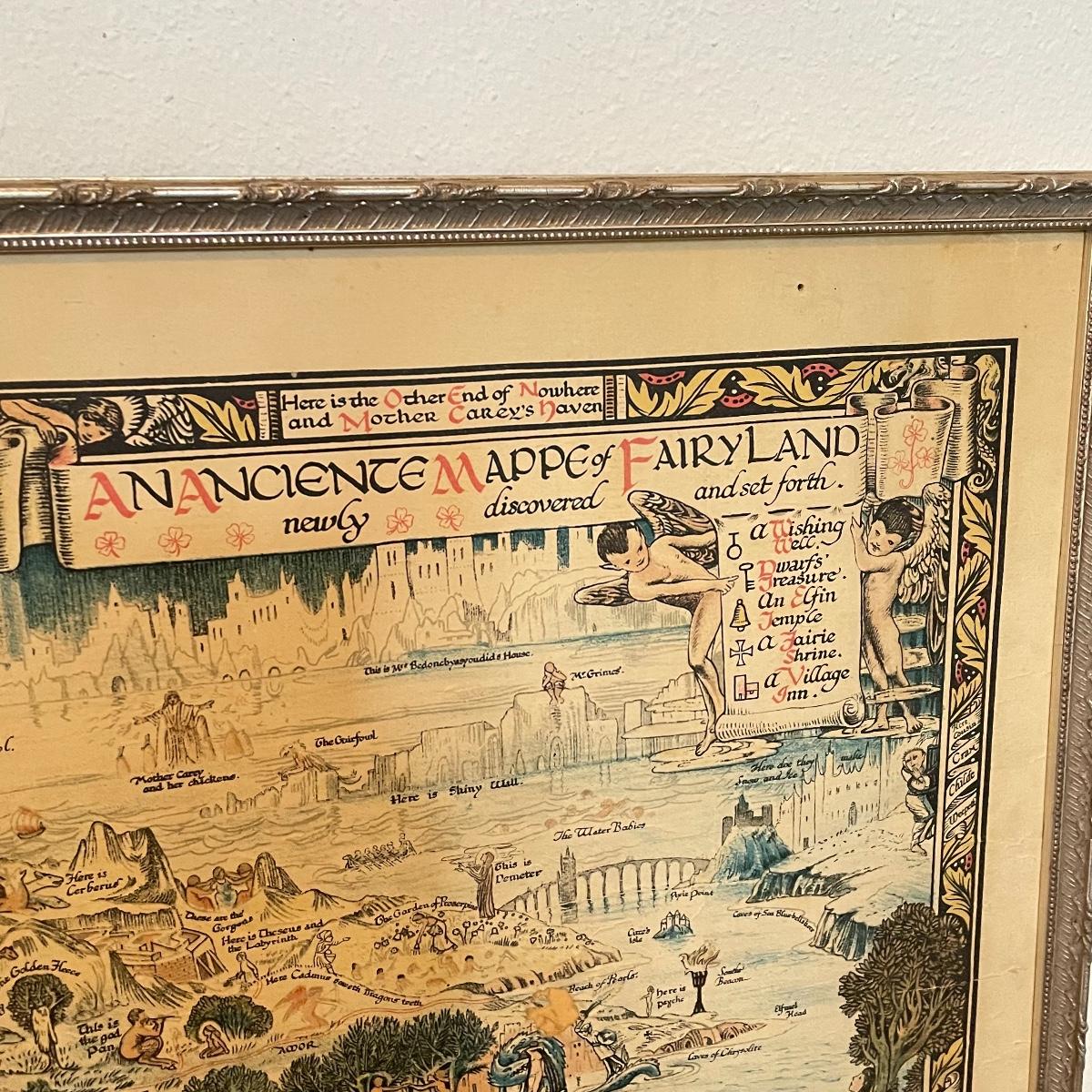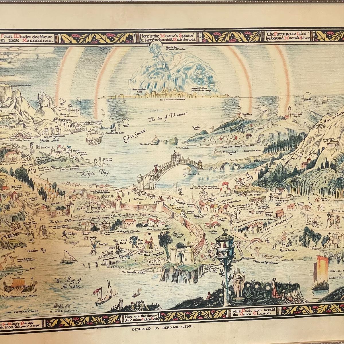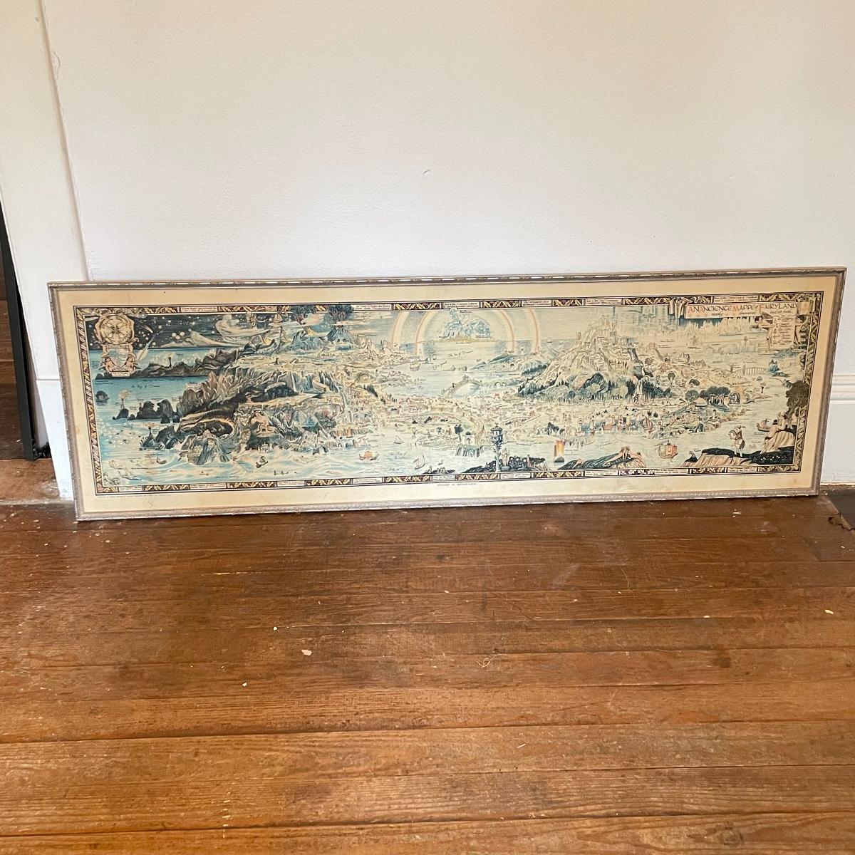 Vintage print designed by Bernard Sleigh titled “An Anciente Mappe of Fairyland”. Art sits without glass and is a bit dusty. This detailed piece is in a silver painted wood frame measuring 60” x 19”. Shipping available. Please call UPS with dimensions at 828-252-6930 for a shipping quote prior to bidding.