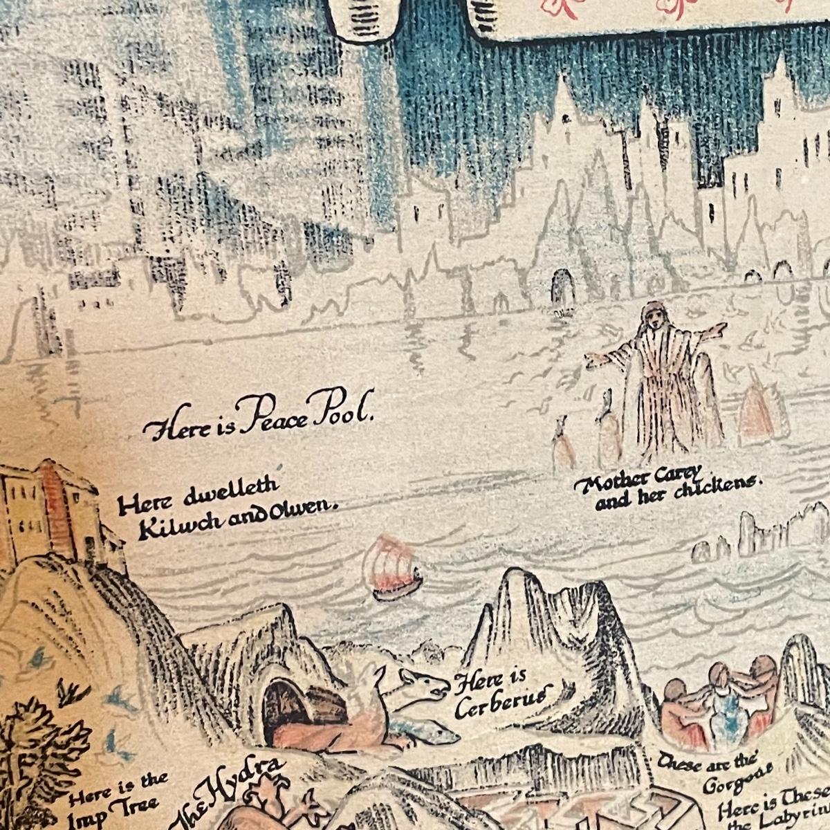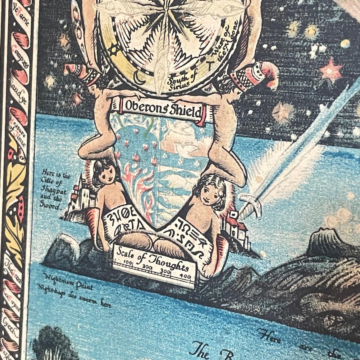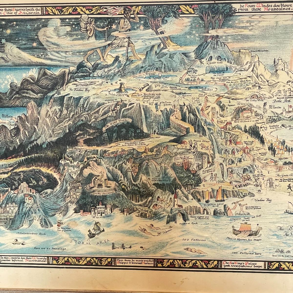 Vintage print designed by Bernard Sleigh titled “An Anciente Mappe of Fairyland”. Art sits without glass and is a bit dusty. This detailed piece is in a silver painted wood frame measuring 60” x 19”. Shipping available. Please call UPS with dimensions at 828-252-6930 for a shipping quote prior to bidding.