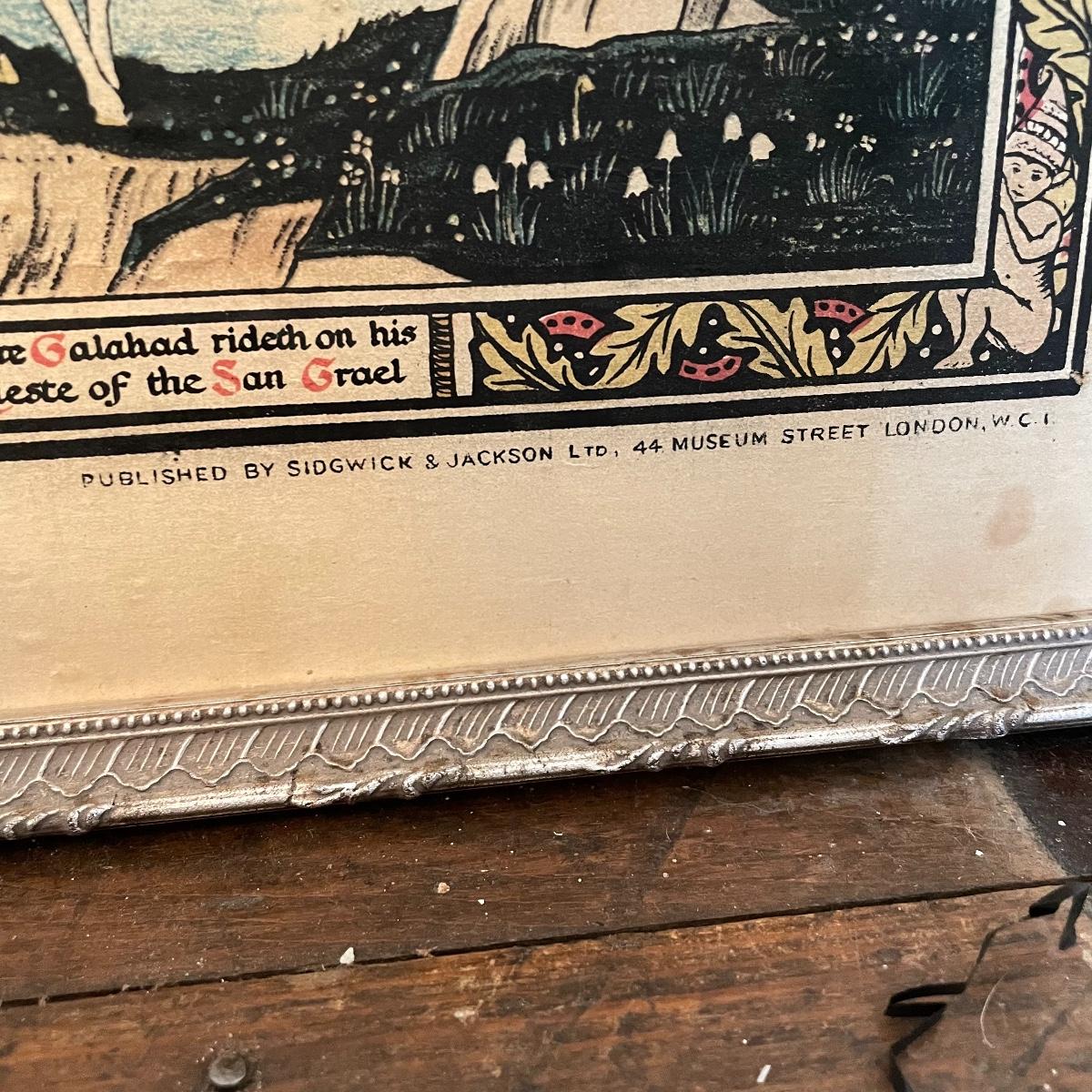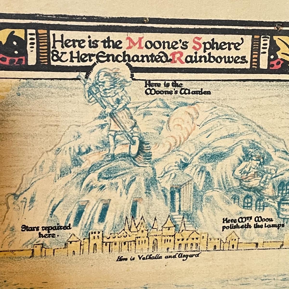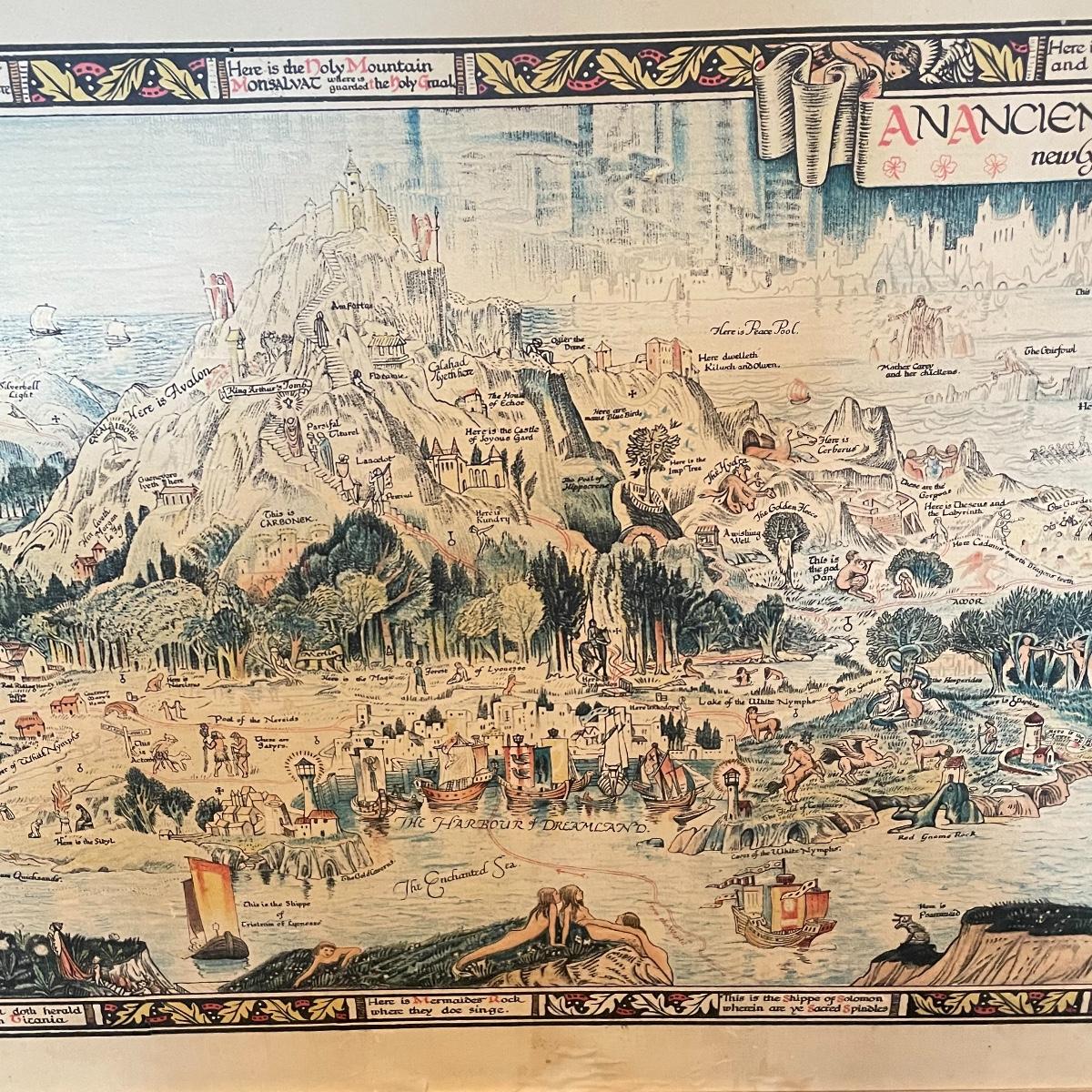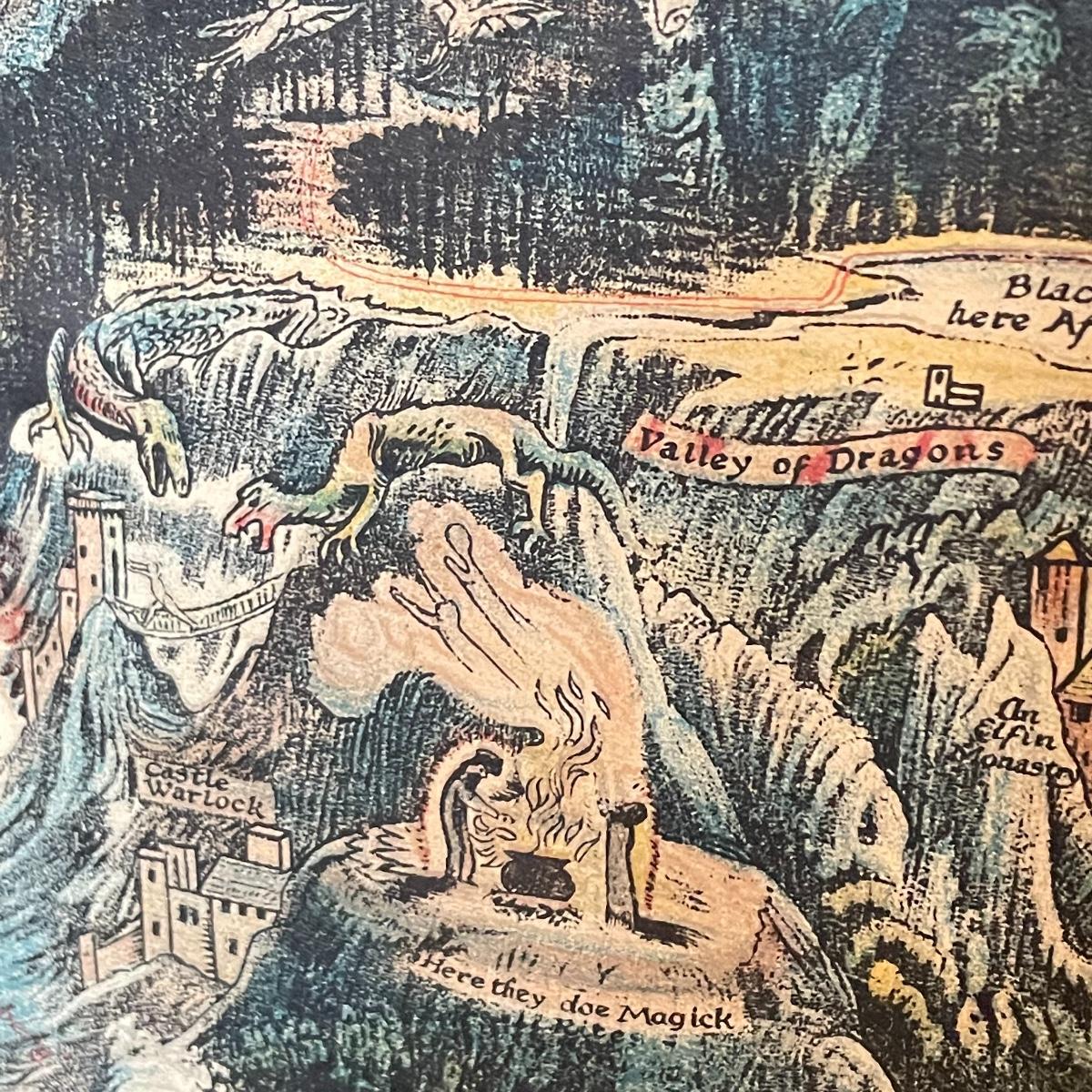 Vintage print designed by Bernard Sleigh titled “An Anciente Mappe of Fairyland”. Art sits without glass and is a bit dusty. This detailed piece is in a silver painted wood frame measuring 60” x 19”. Shipping available. Please call UPS with dimensions at 828-252-6930 for a shipping quote prior to bidding.