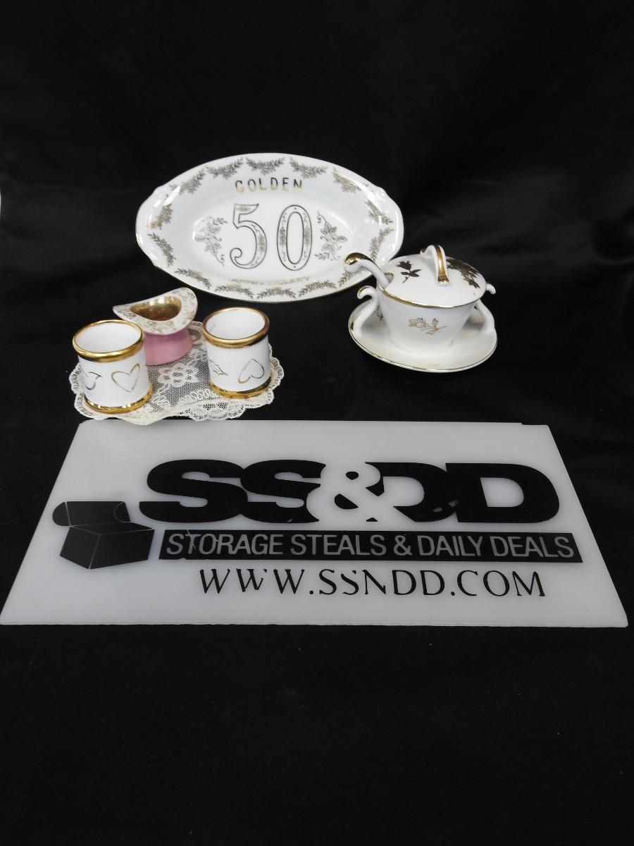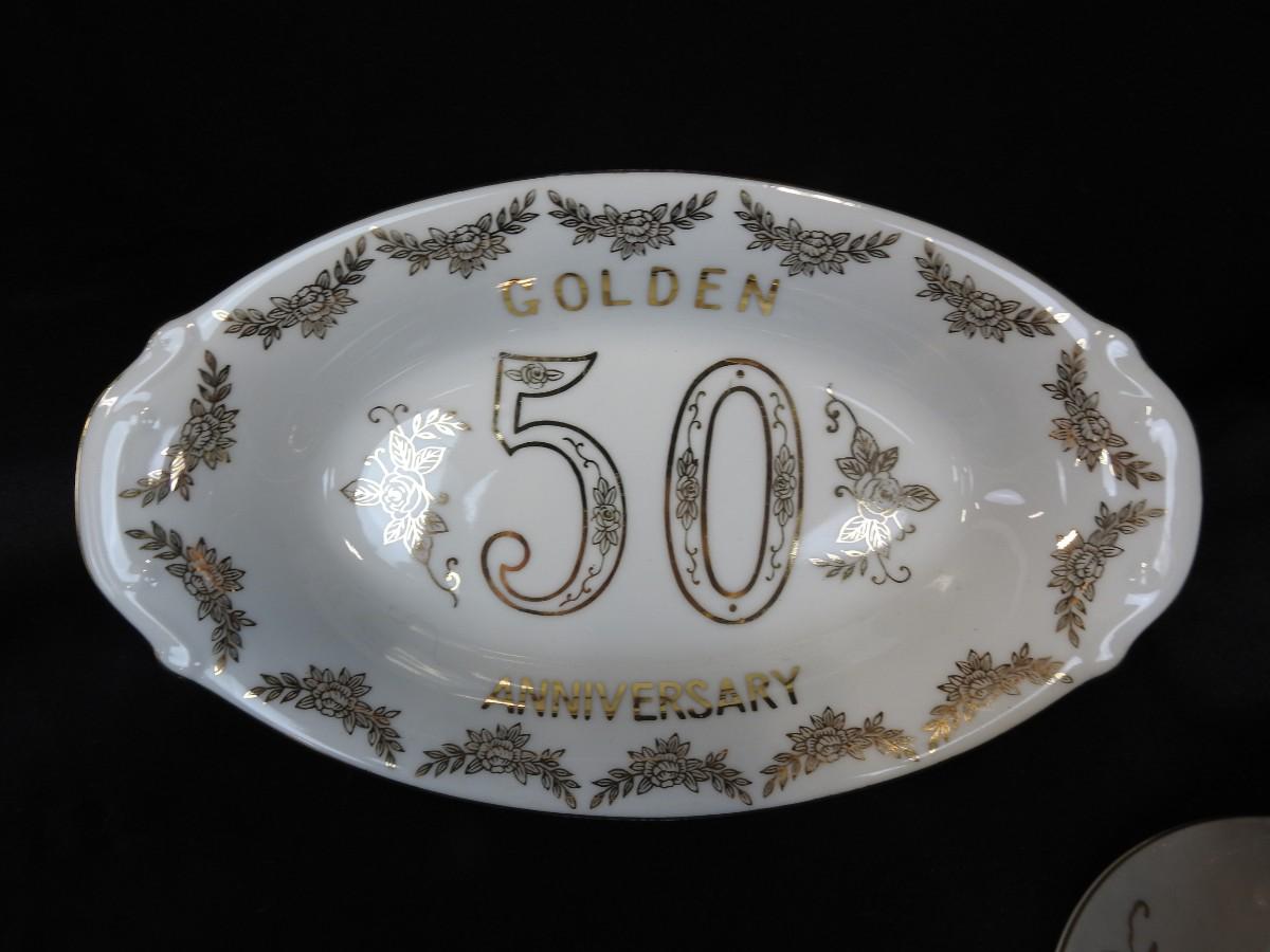 5pc Anniversary Lot: 50th Anniversary Dish, Napkin Rings,  Sugar Dish w/Spoon