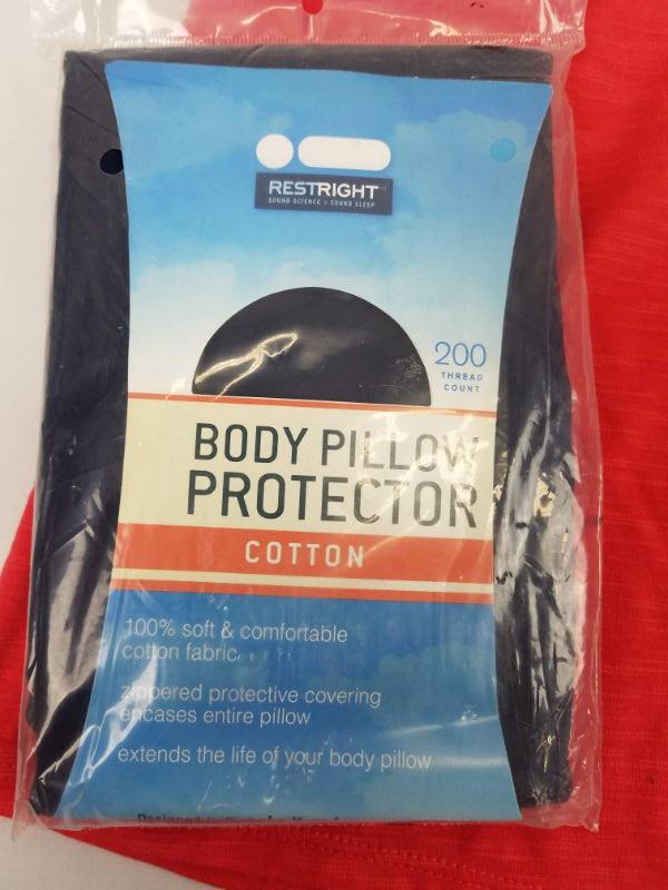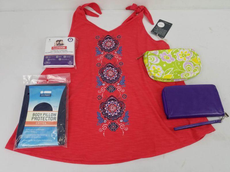 5 piece Misc: Red Tank Top Size Large, King Pillow Cover, Body Pillow Protector, Makeup Bag, and Purple Wallet