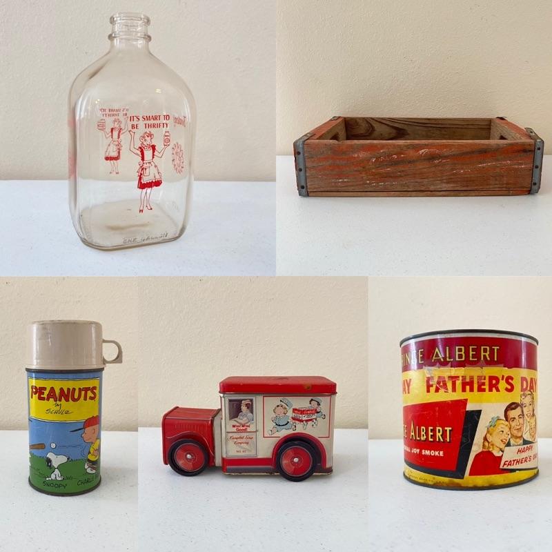 Prince Albert 14oz Smoke Can / Coke Wooden Crate / Campbell’s Soup Tin / Peanuts Thermos / Borden Glass One Gallon Milk Jug