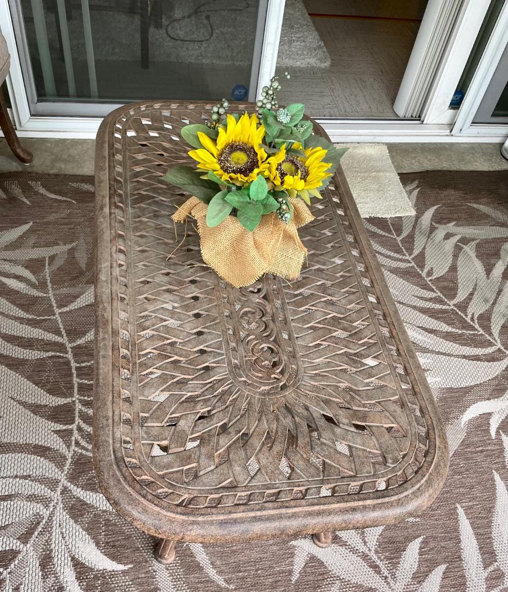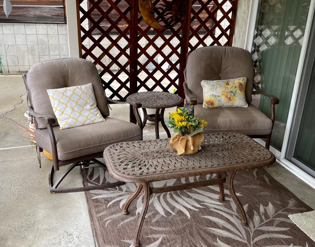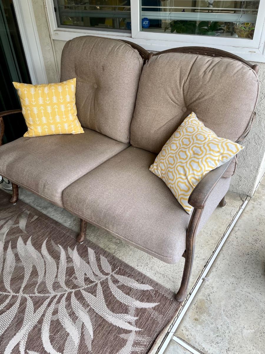 Set includes Loveseat, 2 chairs, coffee table, and small round end table. Chairs and loveseat have matching cushions and accent pillows.