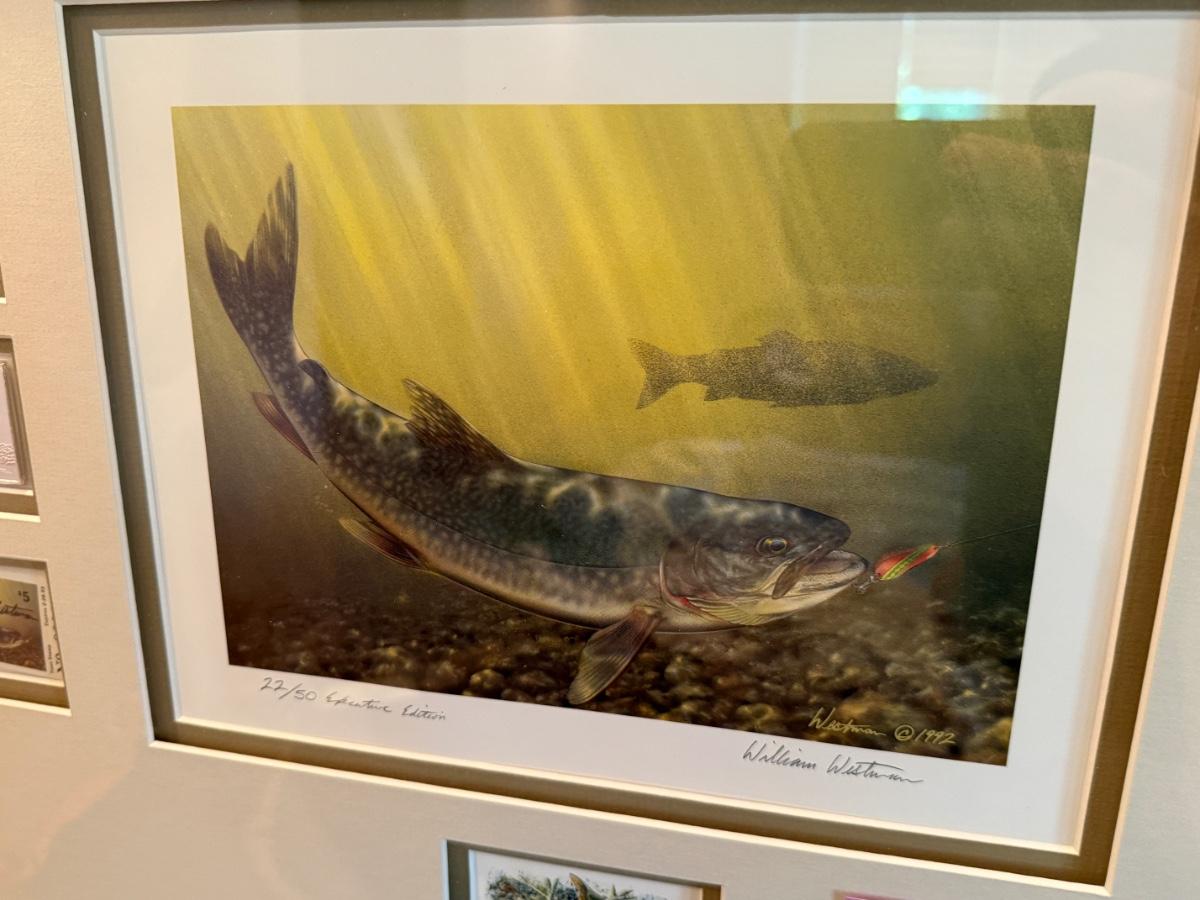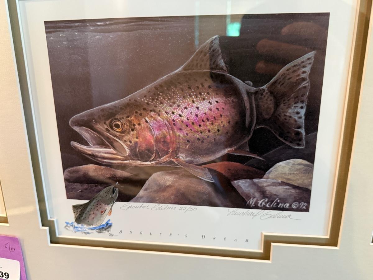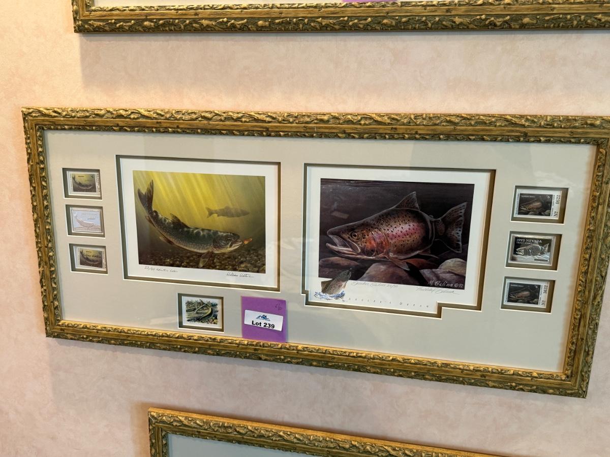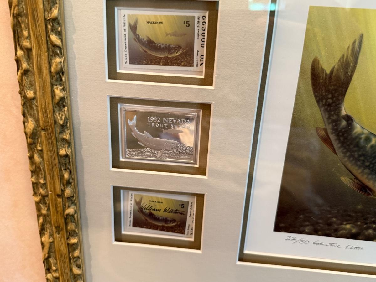 long framed NV Trout Dbl. print w/stamps & 2 silver