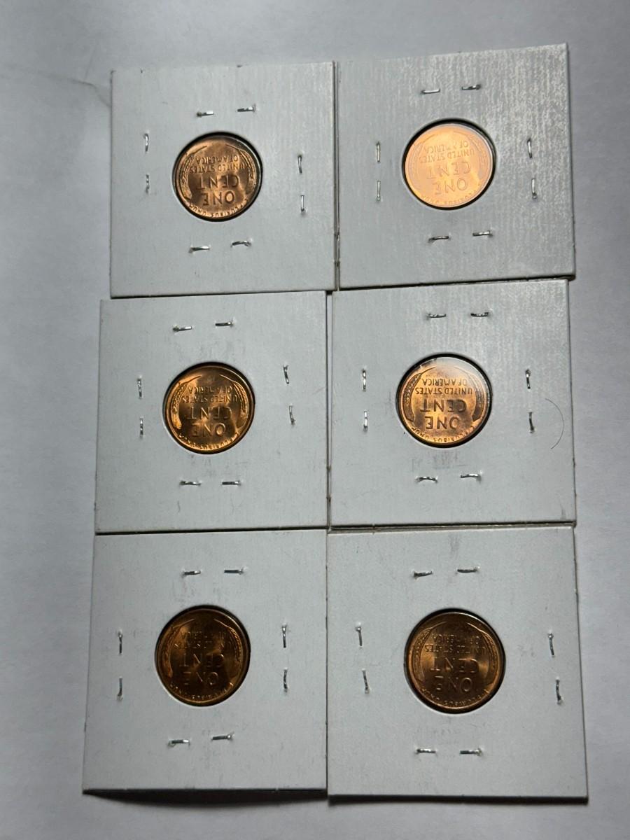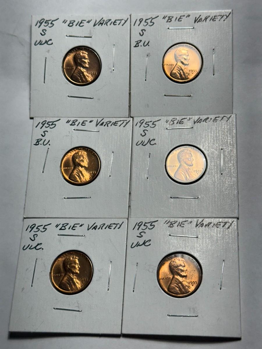 (6) 1955-S CHOICE BU "BIE" VARIETY LINCOLN CENTS LOT AS PICTURED. $5 DOMESTIC SHIPPING.