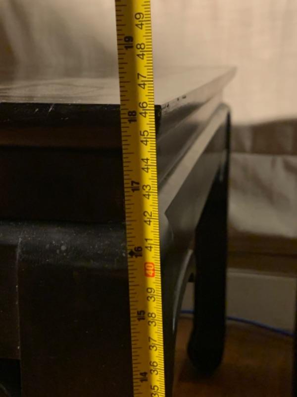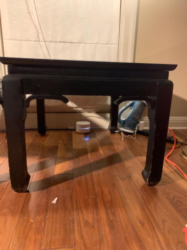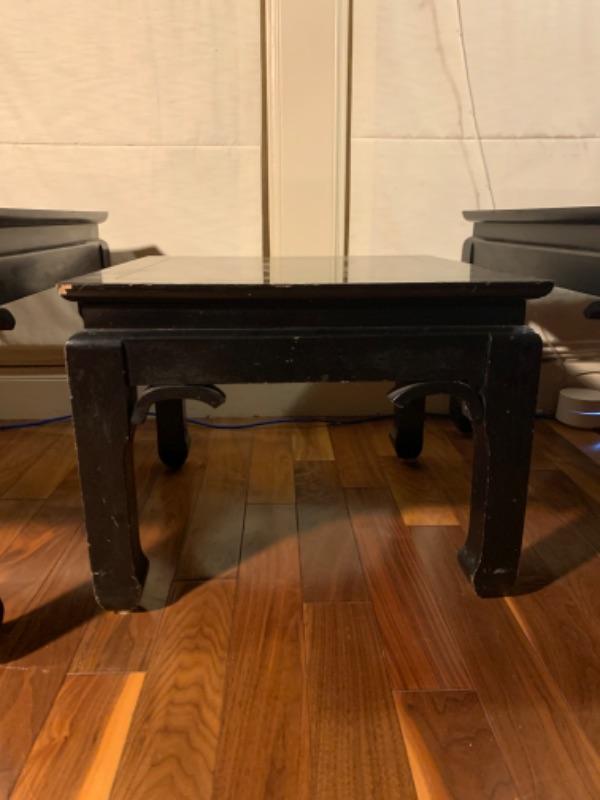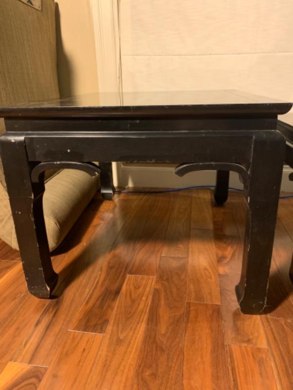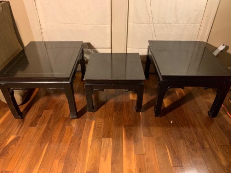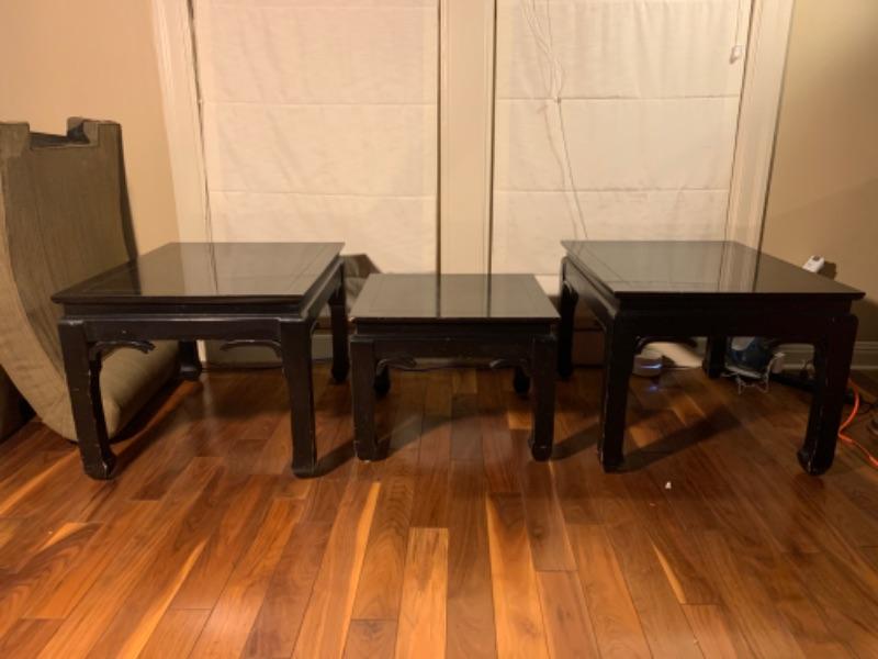 3 Black Asian Wooden Tables: 2 large, 1 small. As-Is, Check photos for measurements. Was $85
