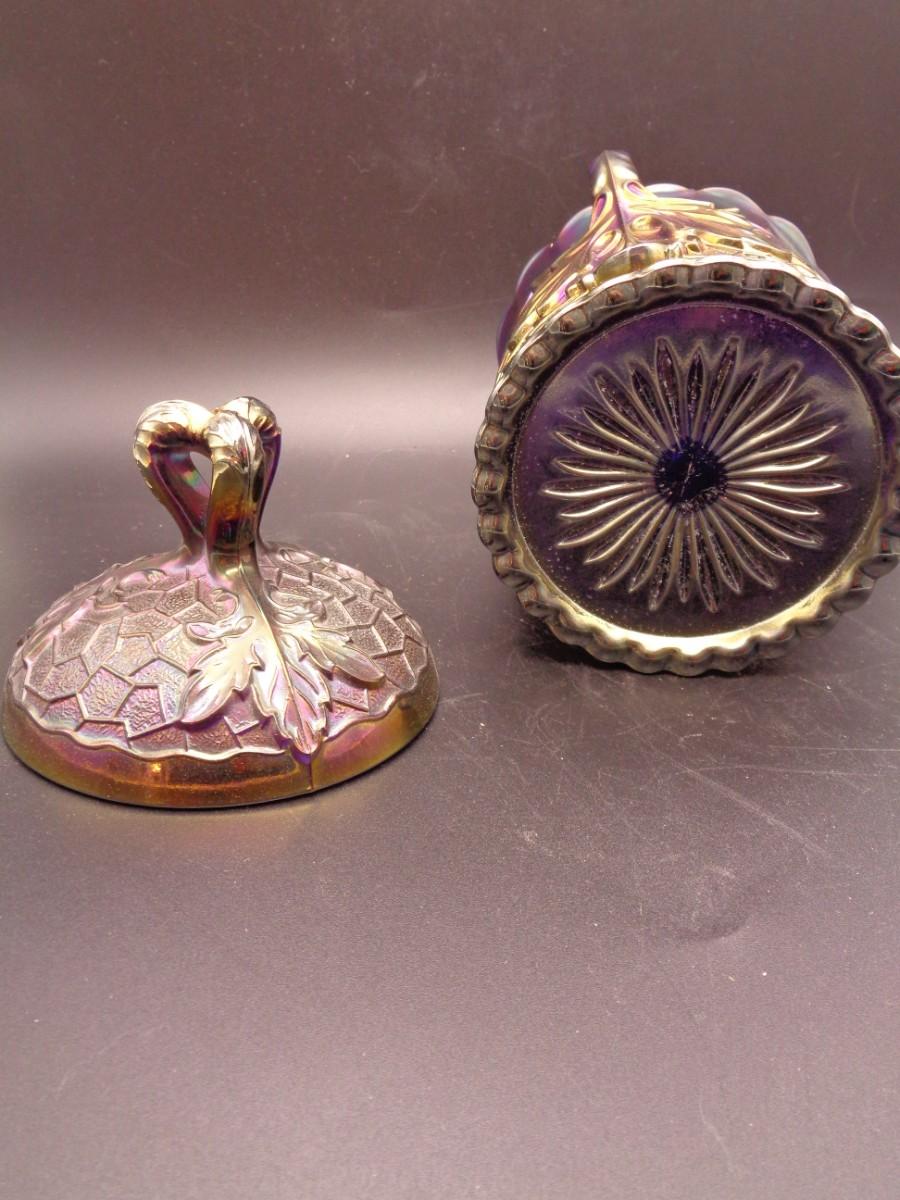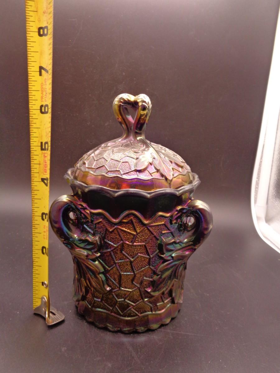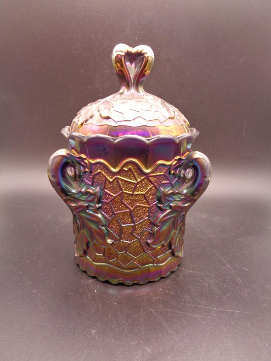 6 3/4" Antique Dugan "Maple Leaf" Sugar w/Lid Stippled BI Carnival Glass #68