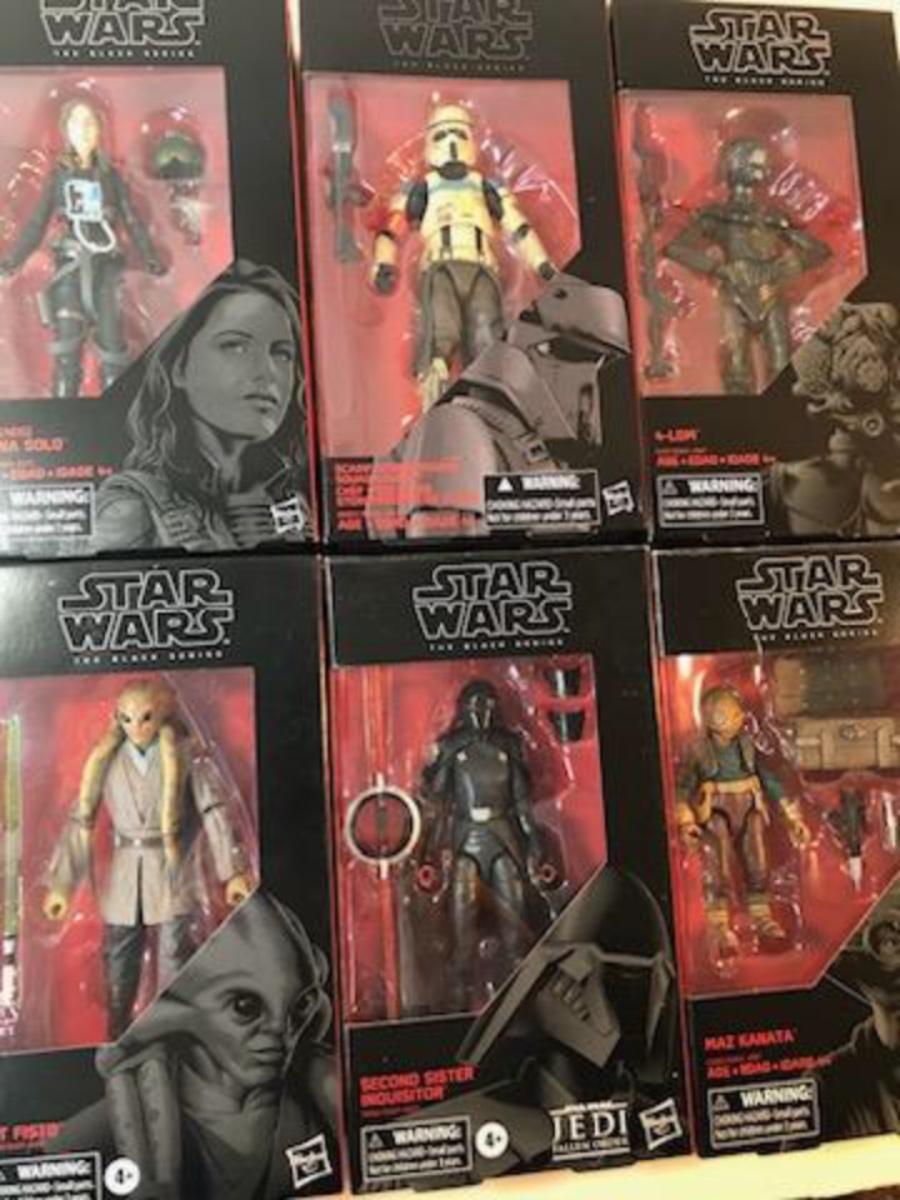 6 6” Star Wars action figures, 4-Iom, Jains Solo, Scarif Stormtrooper, Second Sister Inquisiter, Kit Fisto,  Max Kanata