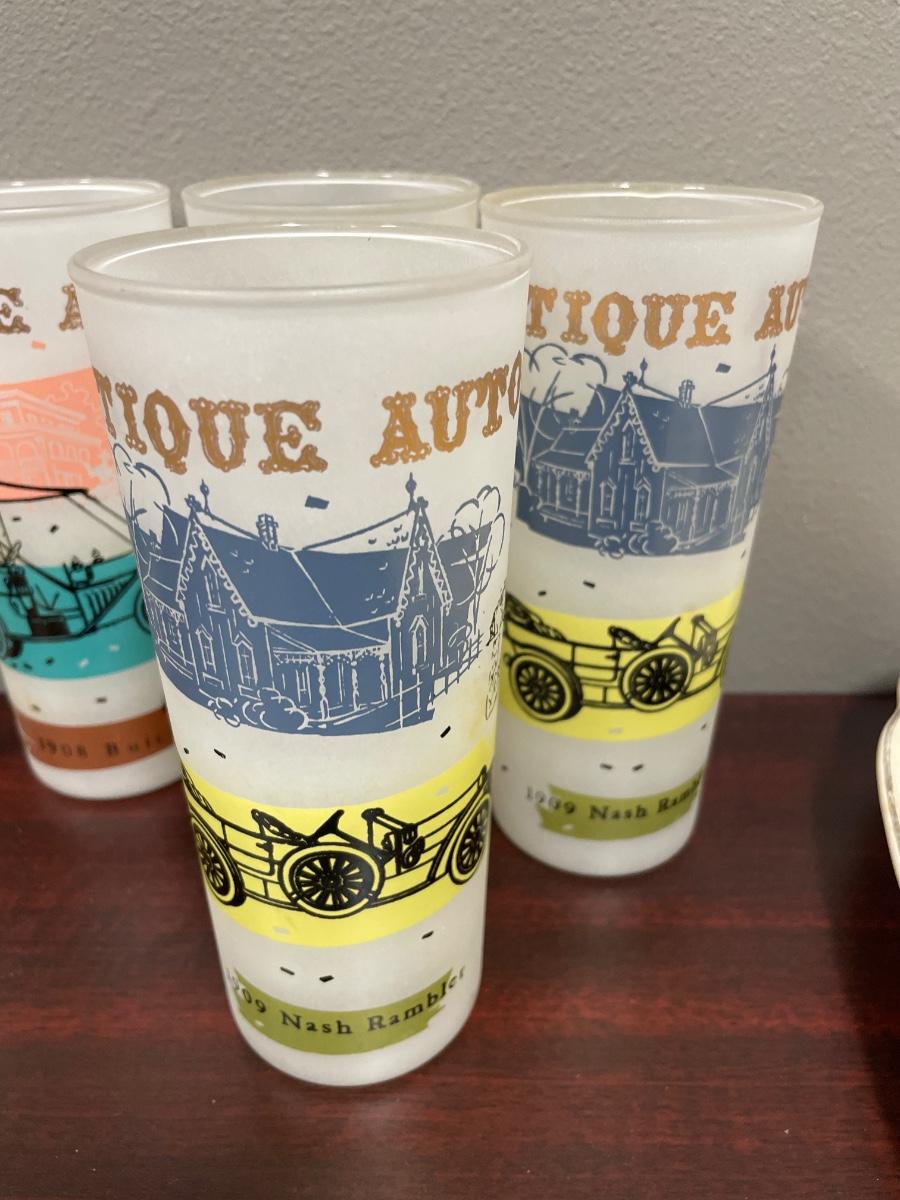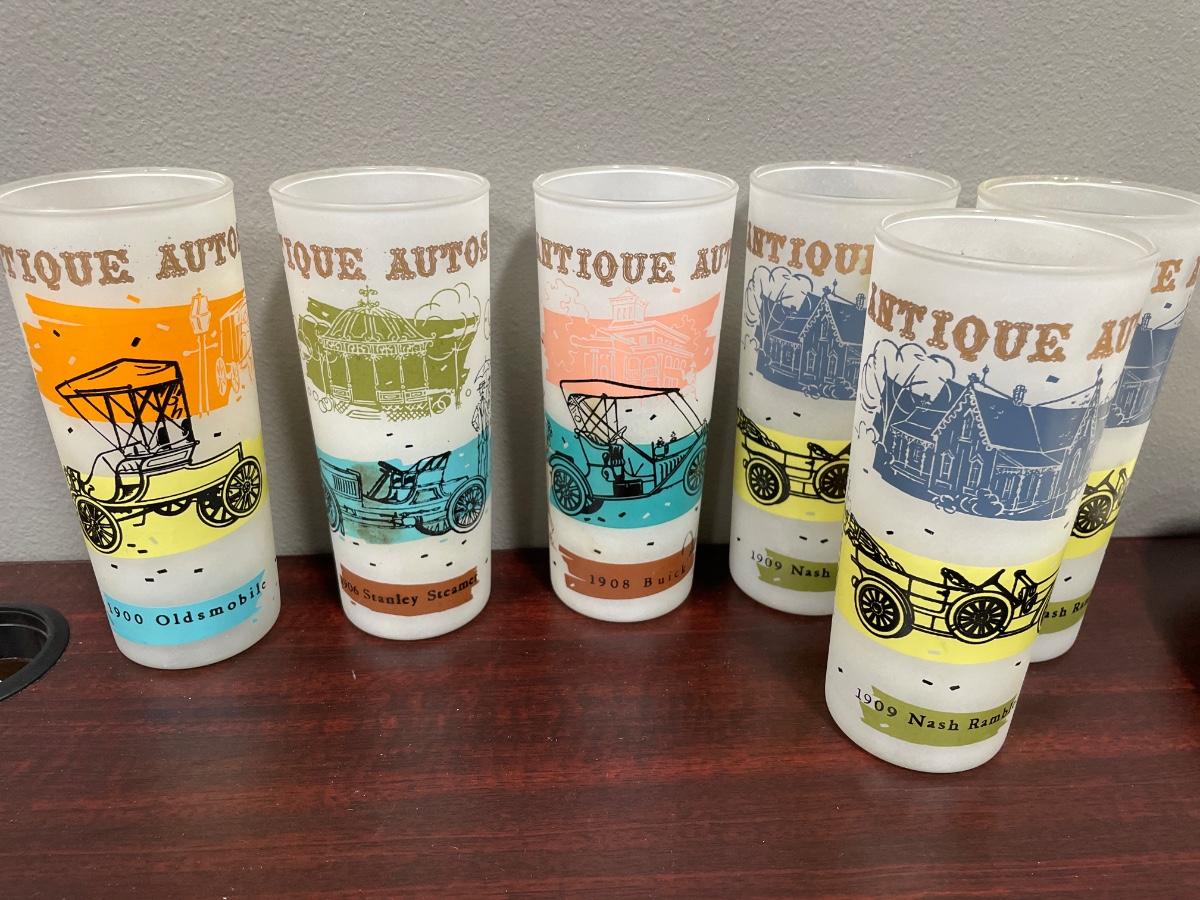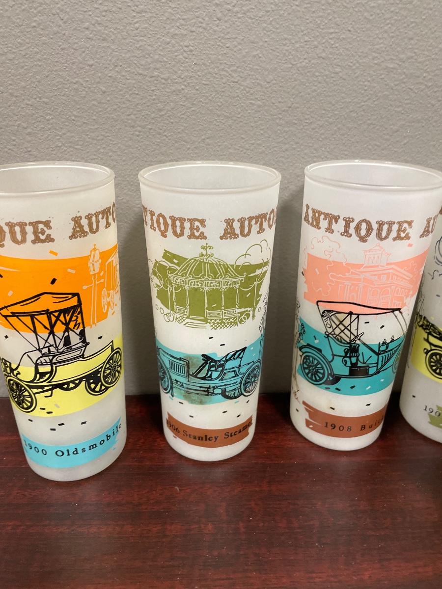 6 Antique Auto frosted drinking glasses