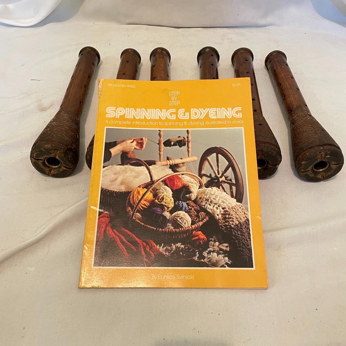 Six antique, primitive yarn loom spool spinning bobbins. All appear in great shape, especially after a deep clean. A copy of Step By Step Spinning and Dying (c) 1974 included. Shipping available.