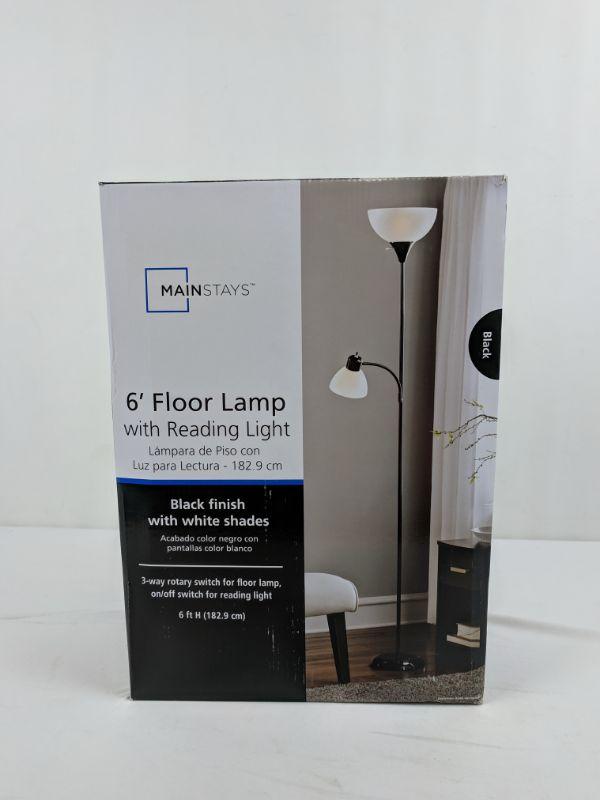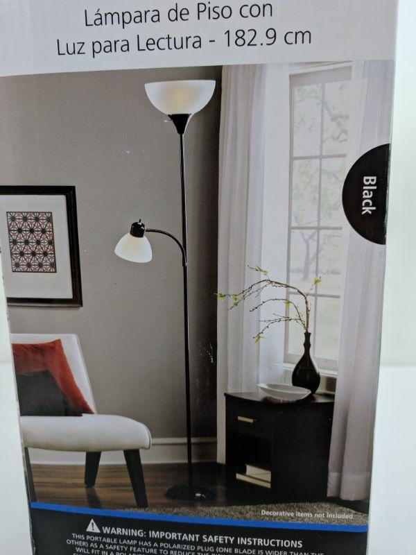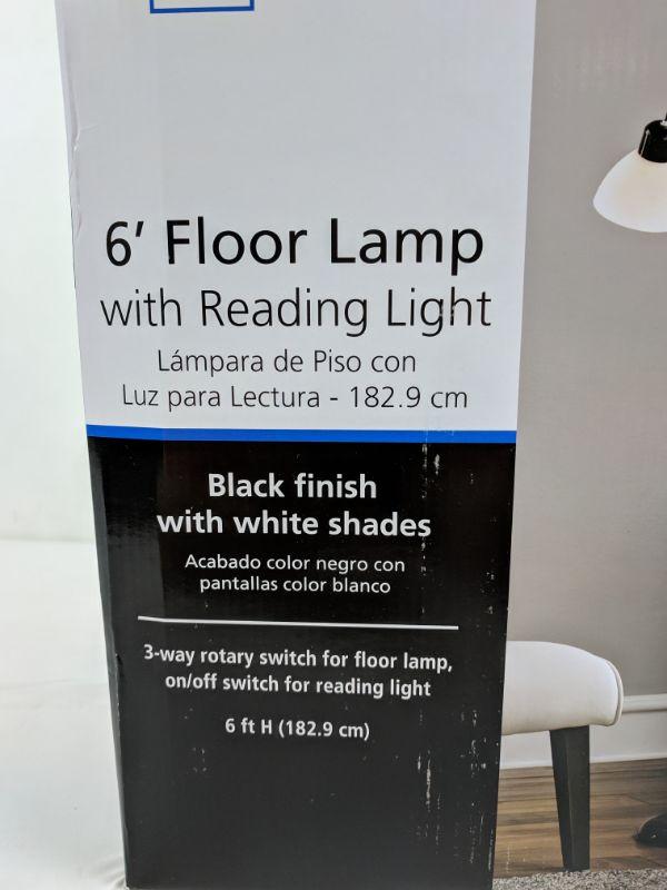 6' Black Floor Lamp w/Reading Lamp, Black Finish w/White Shades - New
