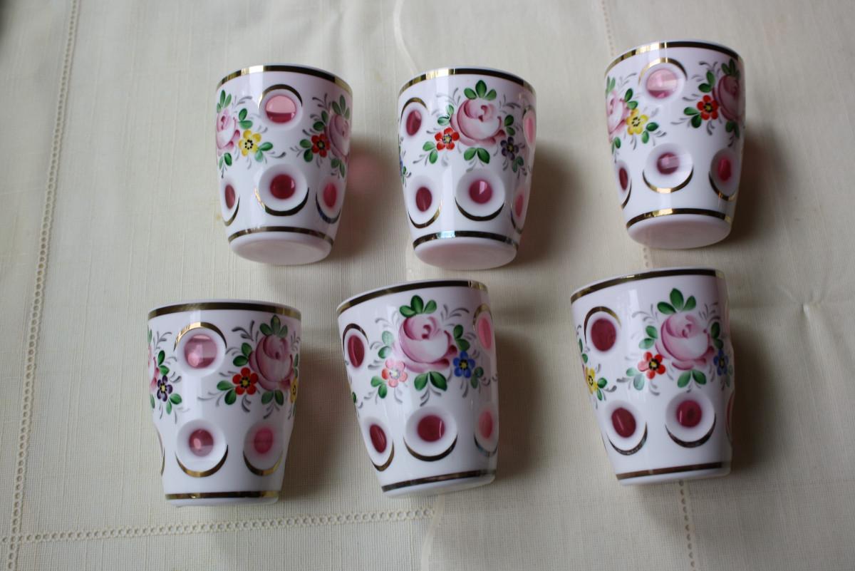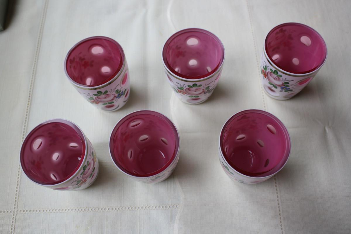 6 Bohemian Overlay Cut to Clear Cranberry Juice Tumblers - KP/CN