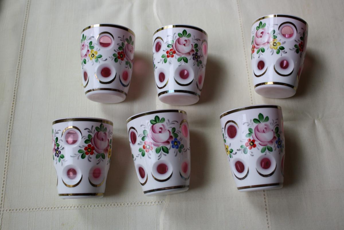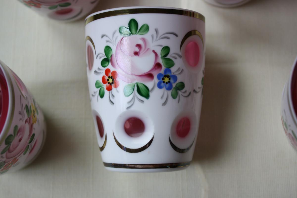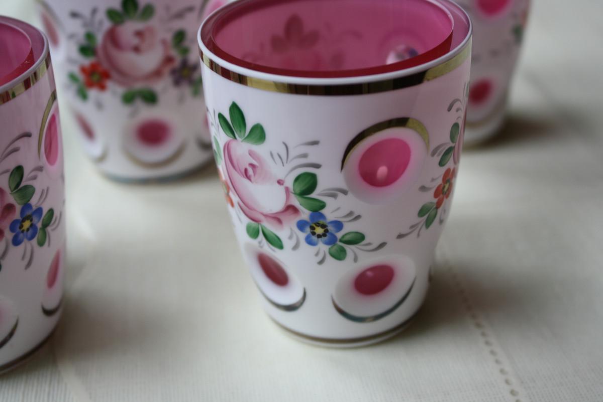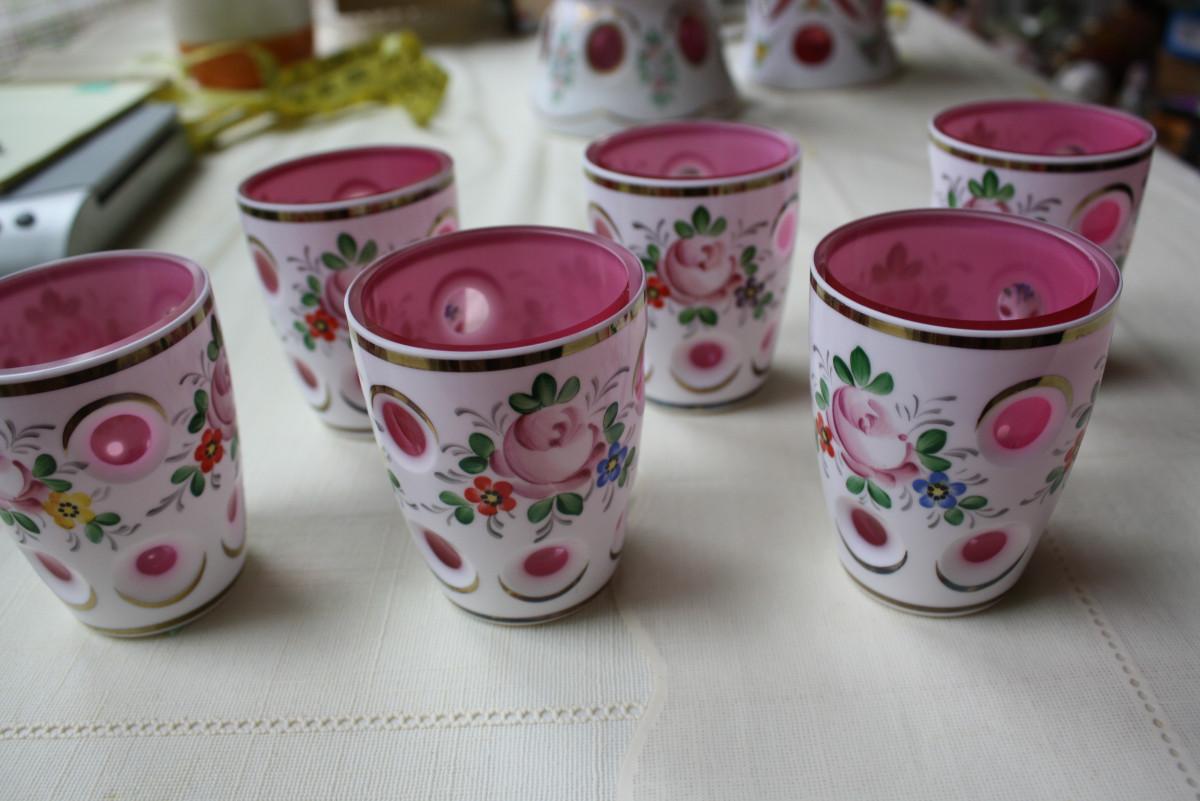 HTF set Bohemian Overlay Cranberry 3 & 3/8" juice glasses.