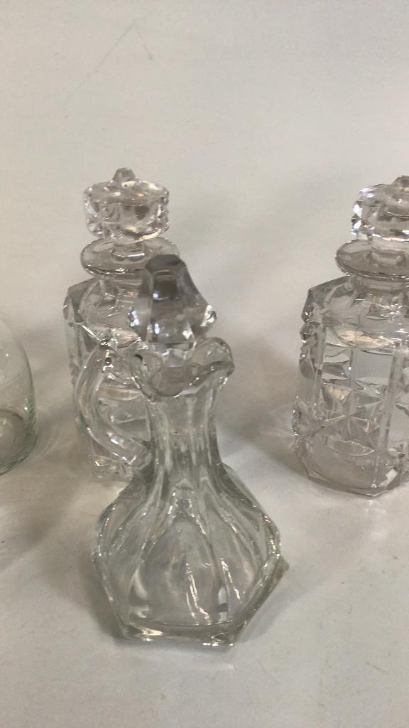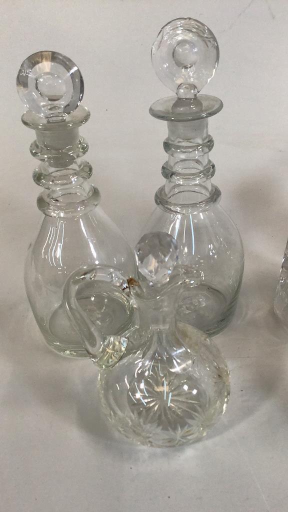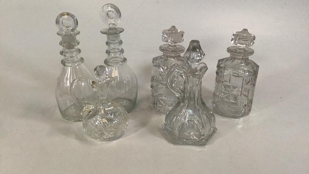 Pair 9 inch blown glass bottles with pinch stoppers, 2 crusts, pair pressed glass decanters * minor chips