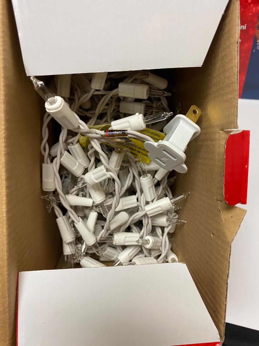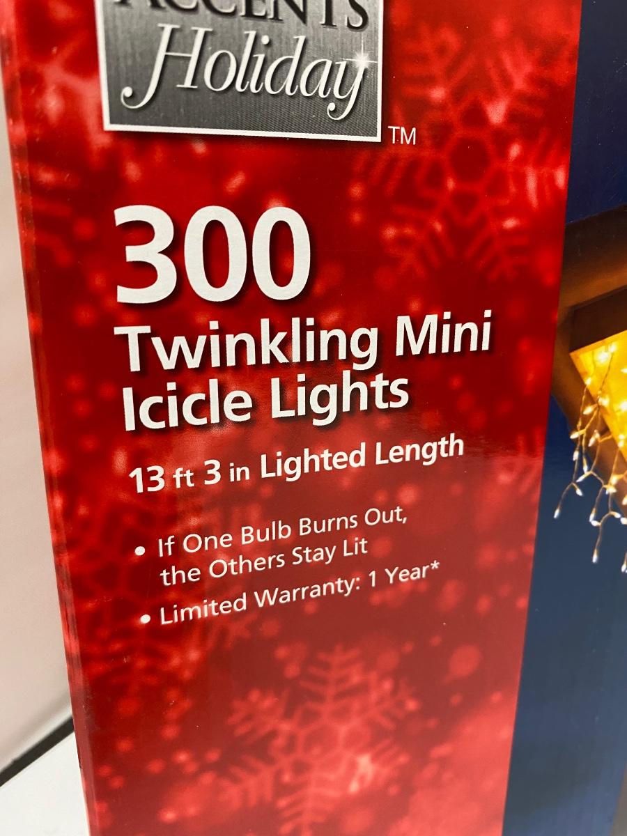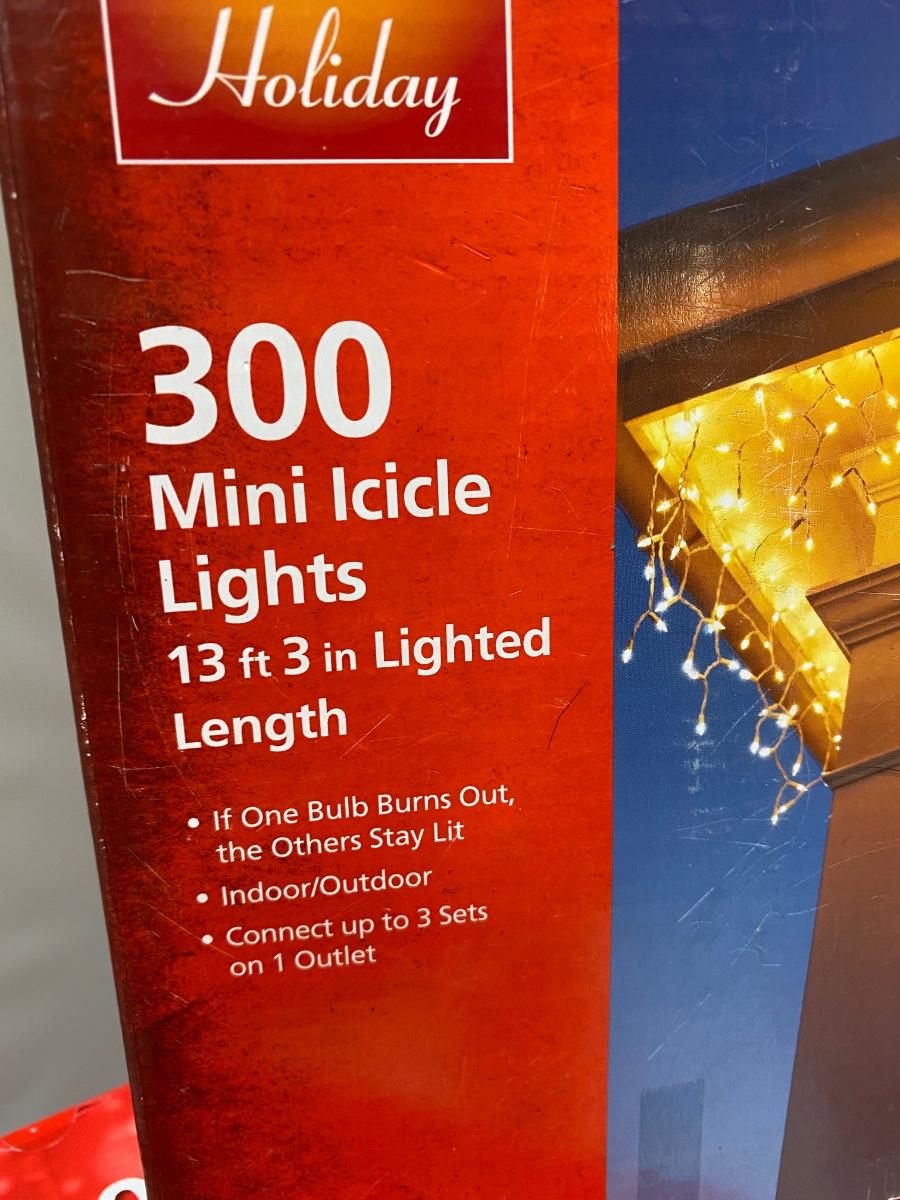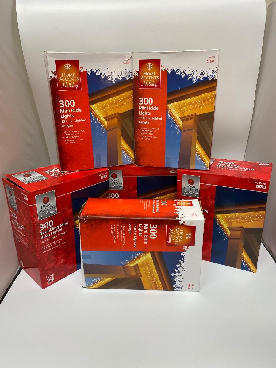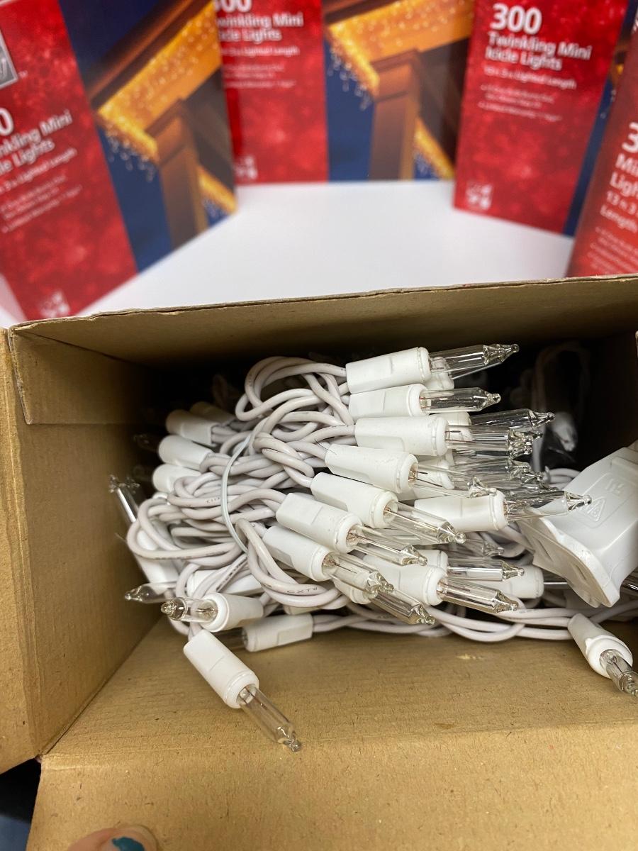 6 boxes of mini white icicle lights. 300 light strands. The boxes are labeled different, three say twinkling, three don't. They look exactly the same and the boxes are almost identical, maybe just different years. Lights all work. A couple boxes are unused.