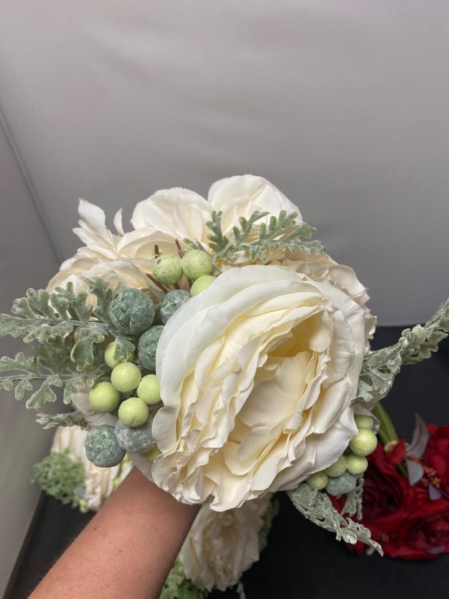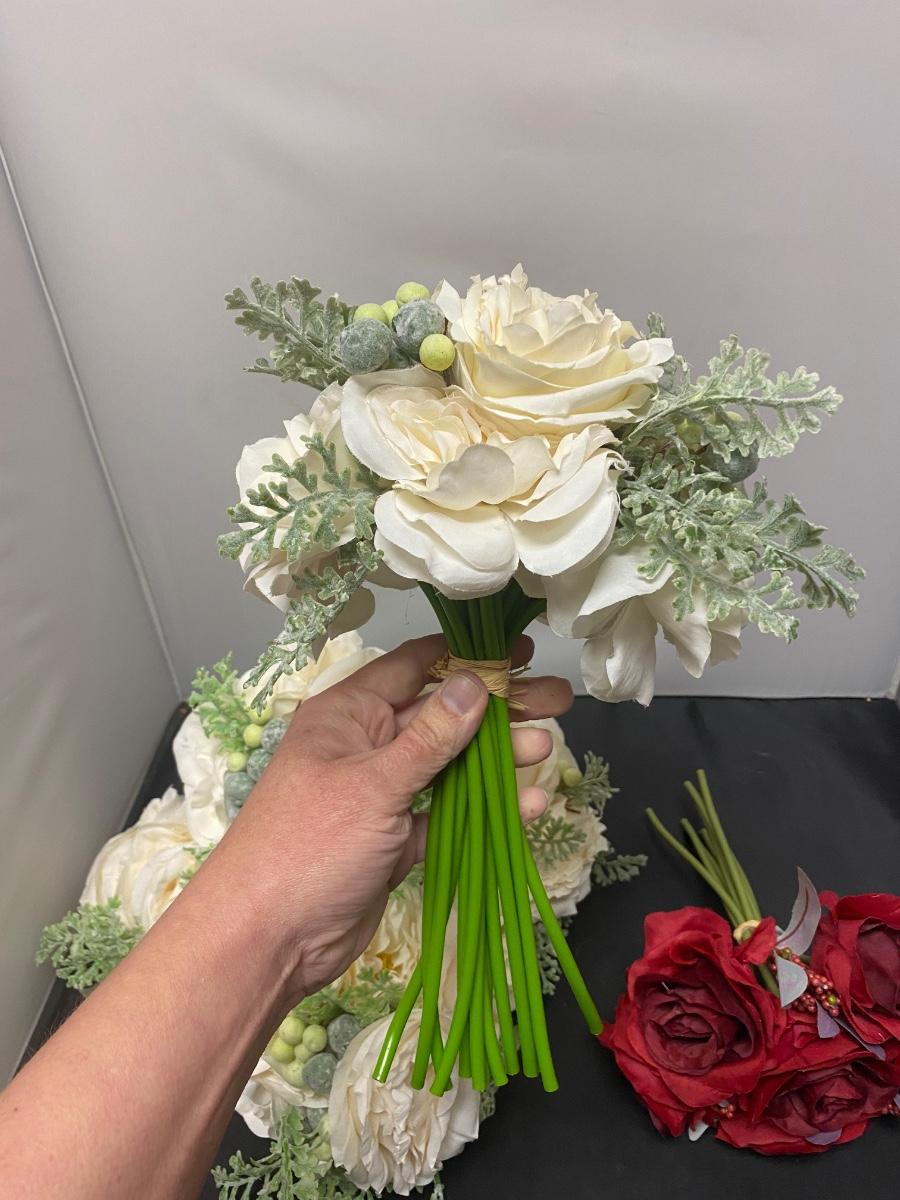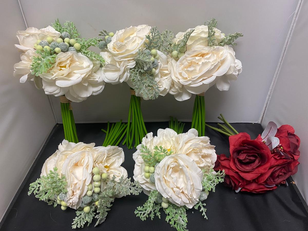 6 bunches of artificial roses. 5 white, 1 red. Great for decor or crafting. About 12" total length.