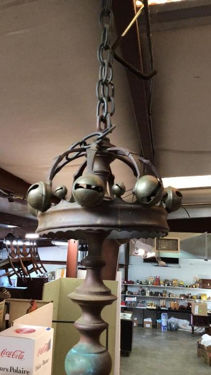 Some discoloration, loose arms, cap decorated with bells, 36 inch height, additional attachments.