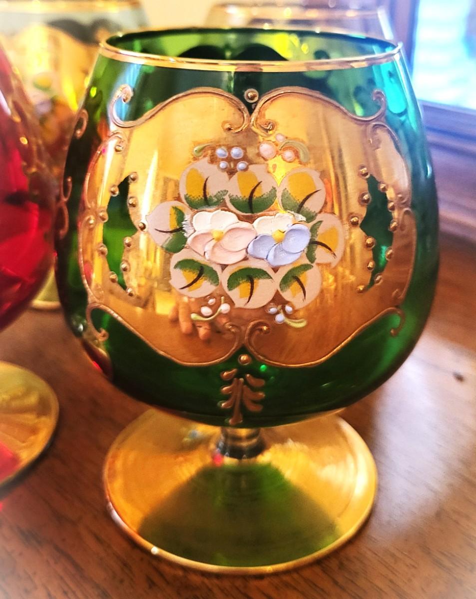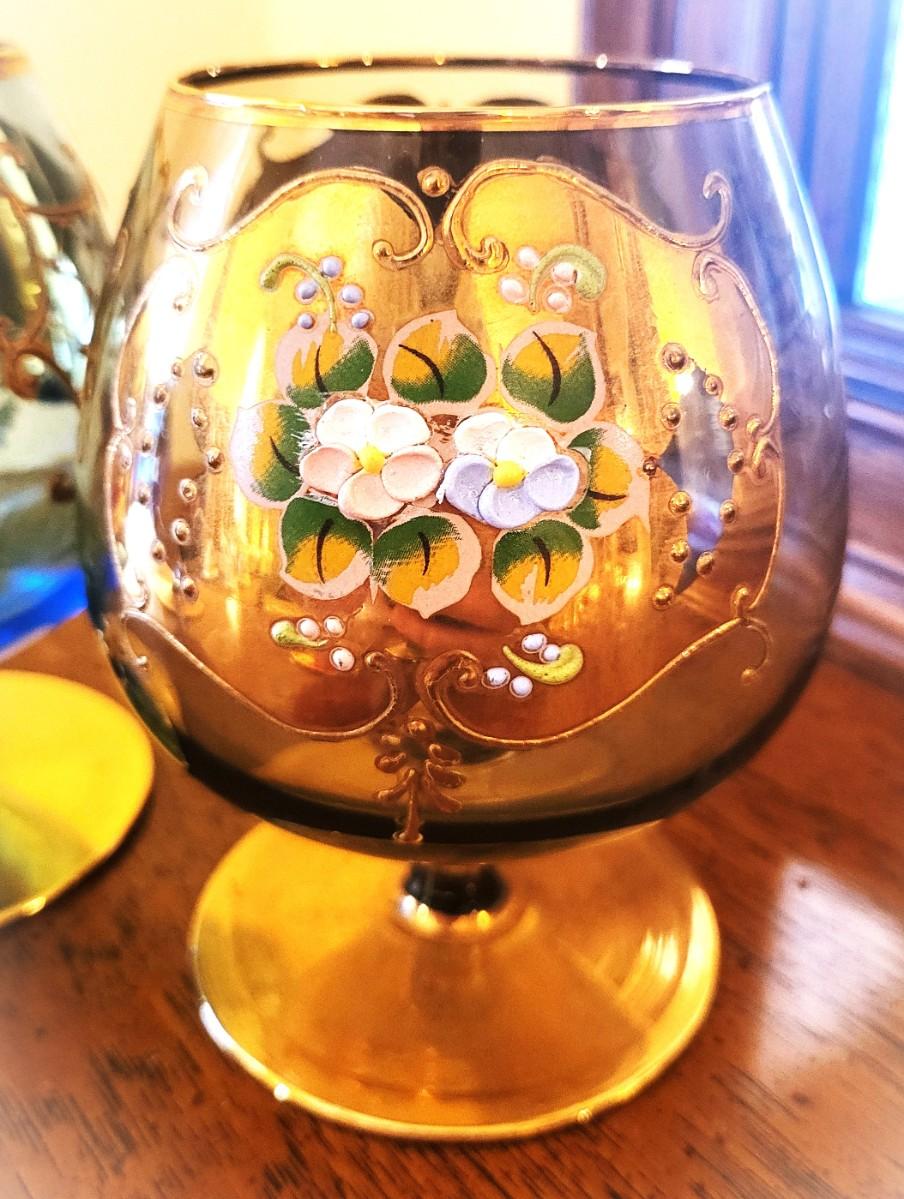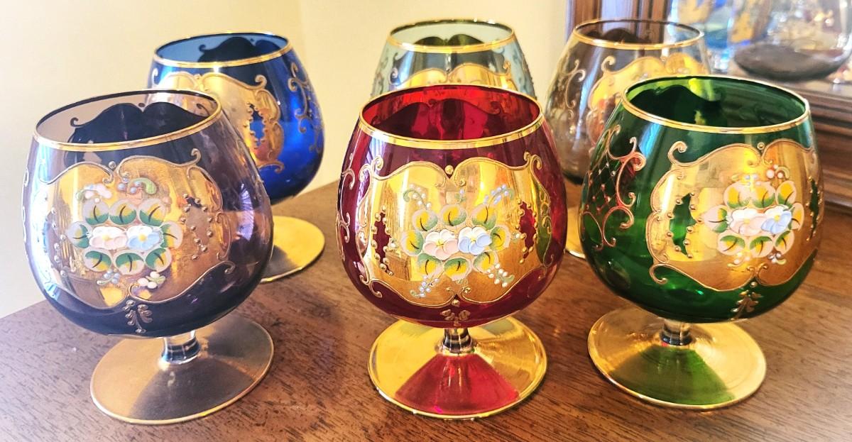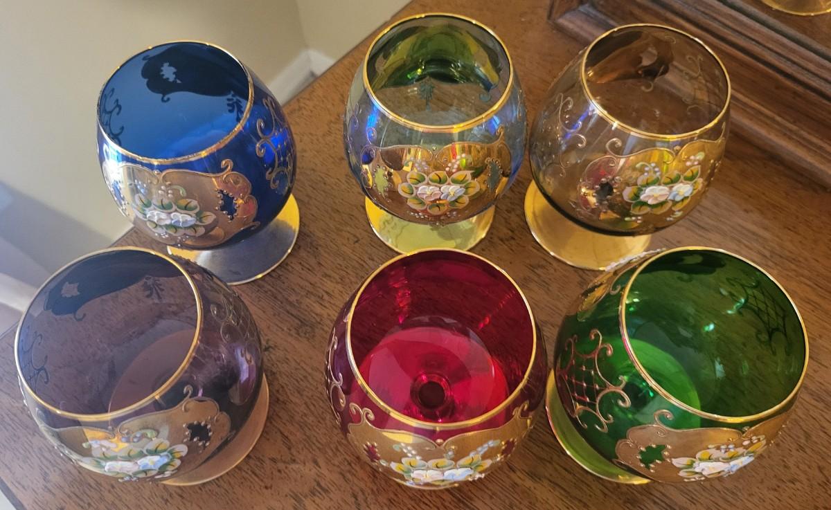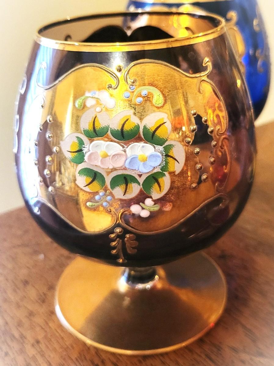 6 Circa 1960s Vintage Bohemian Glass Brandy Snifters, Hand Painted