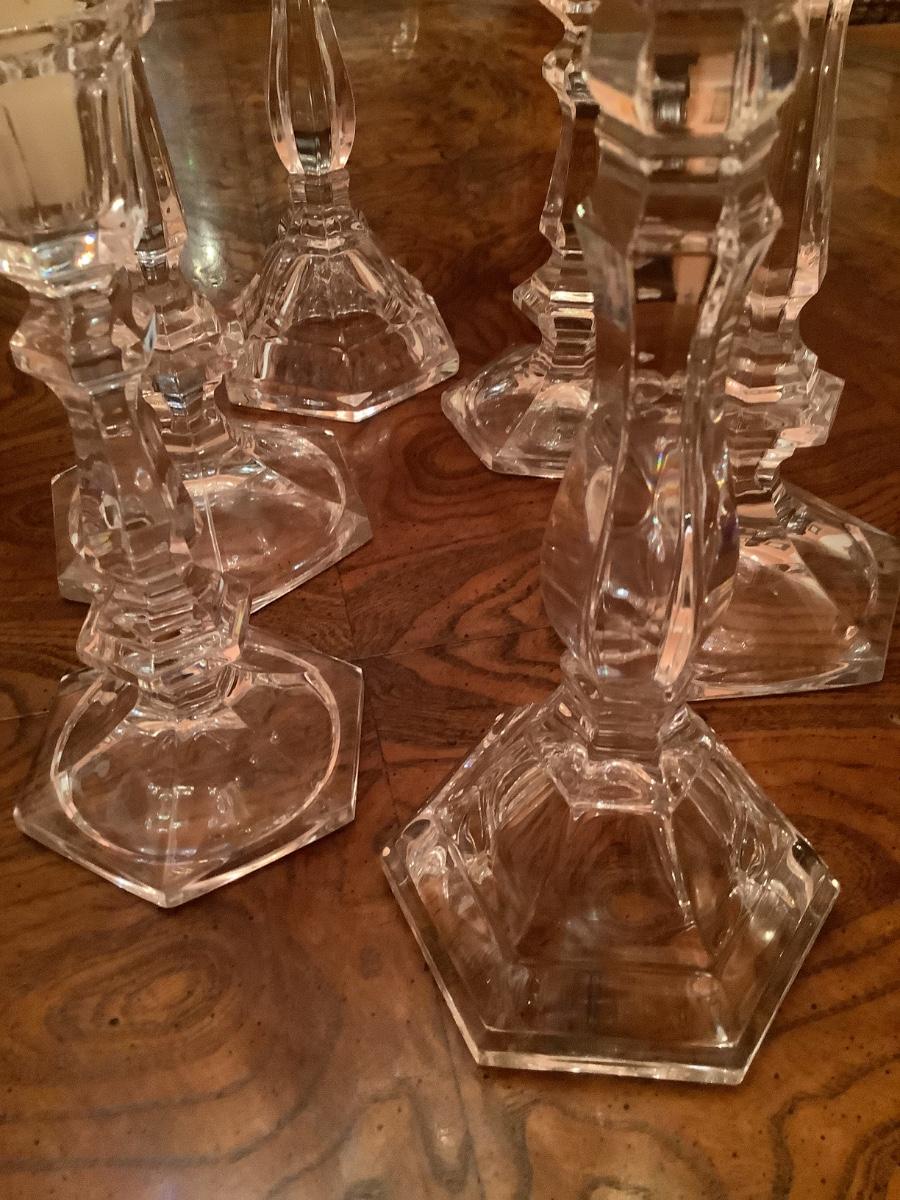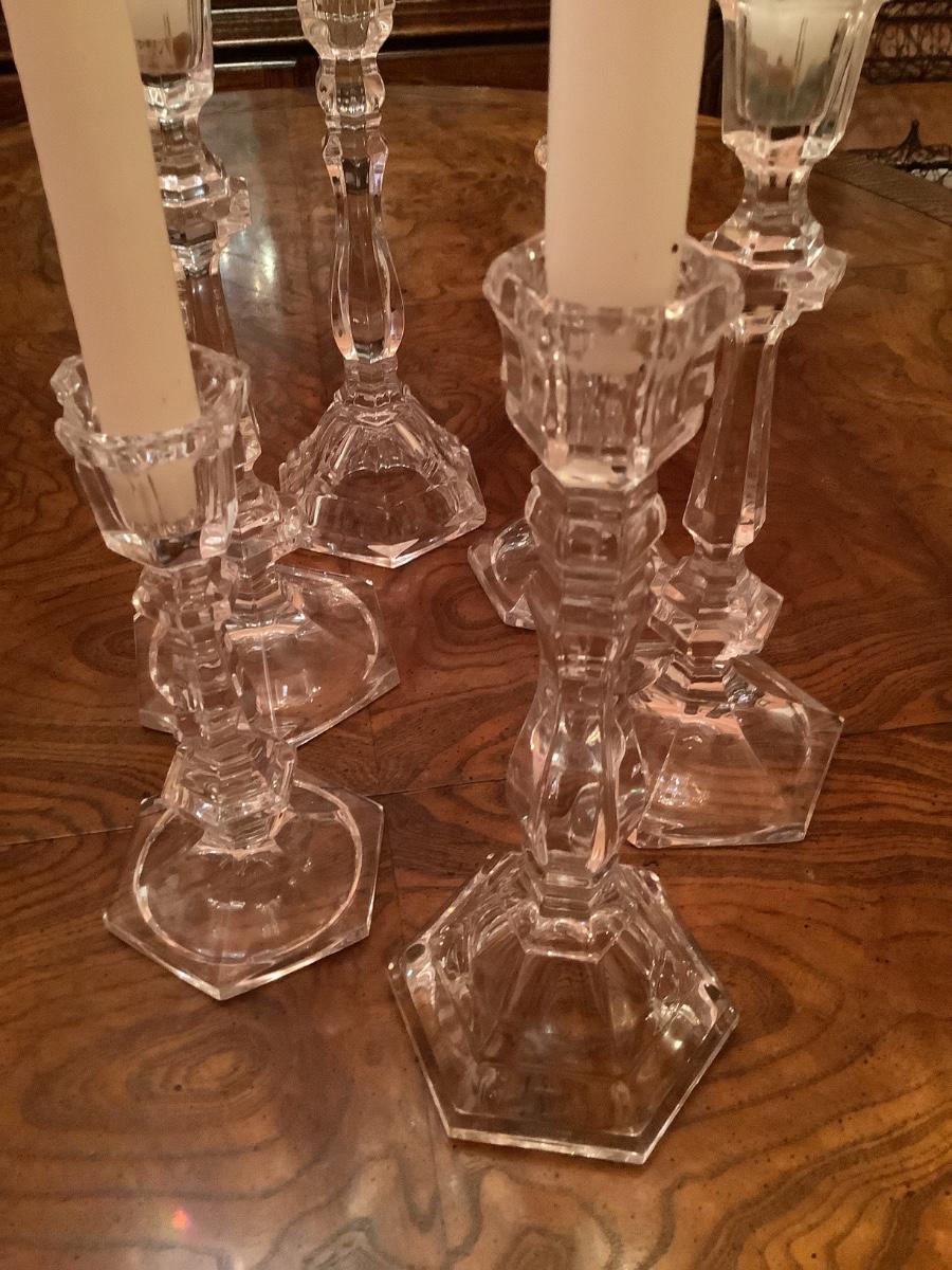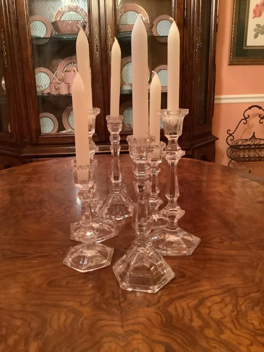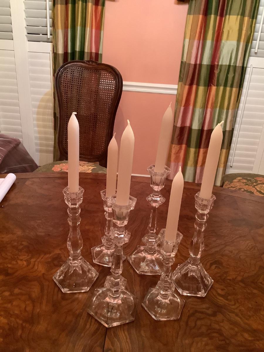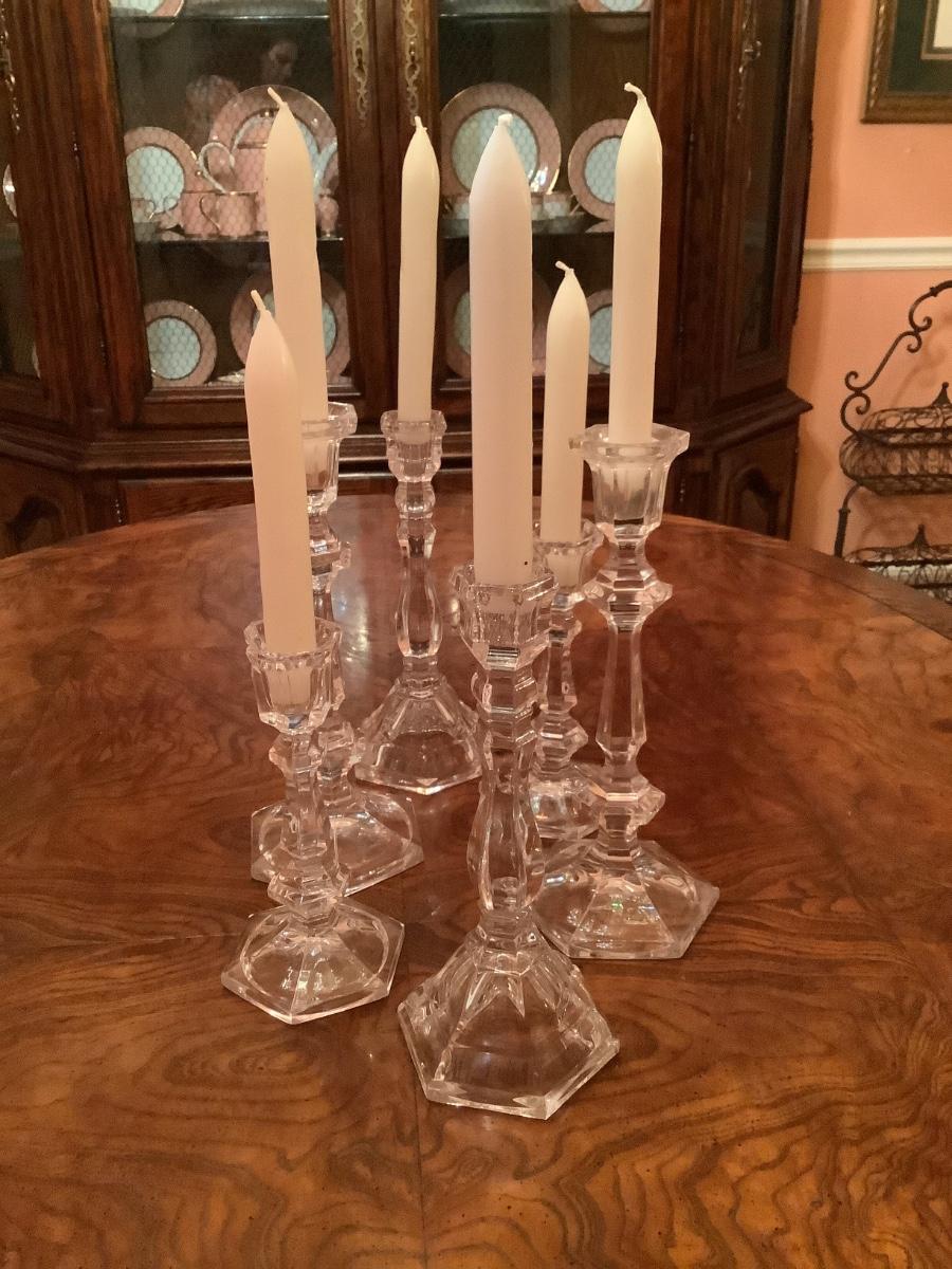 6 complimenting candlesticks of varying designs and heights