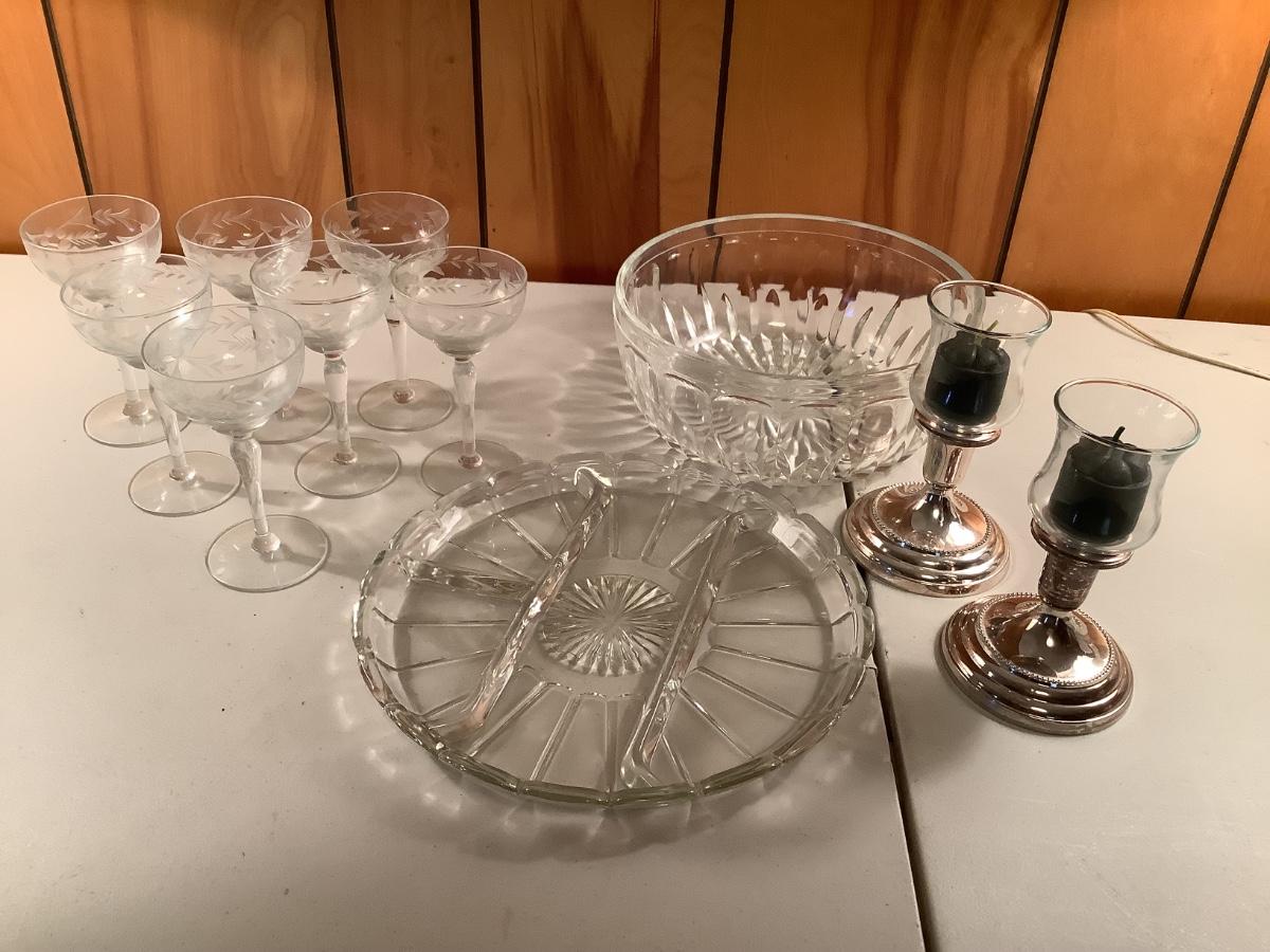 6 crystal stemware, tray, Gorham candlestick, bowl lot