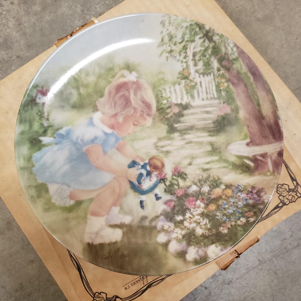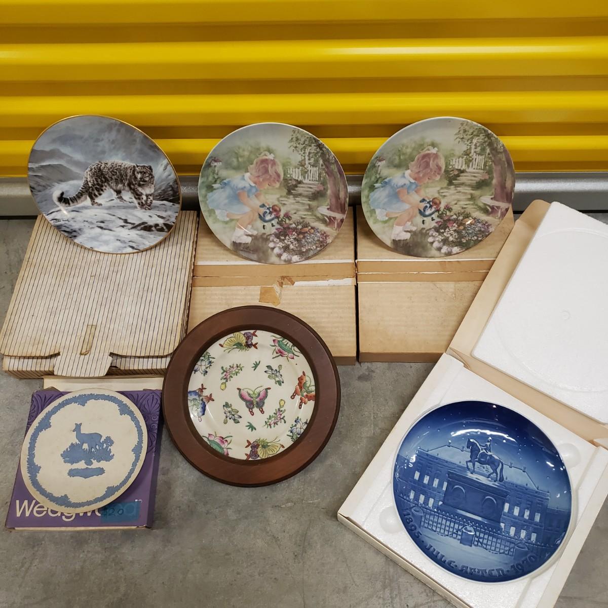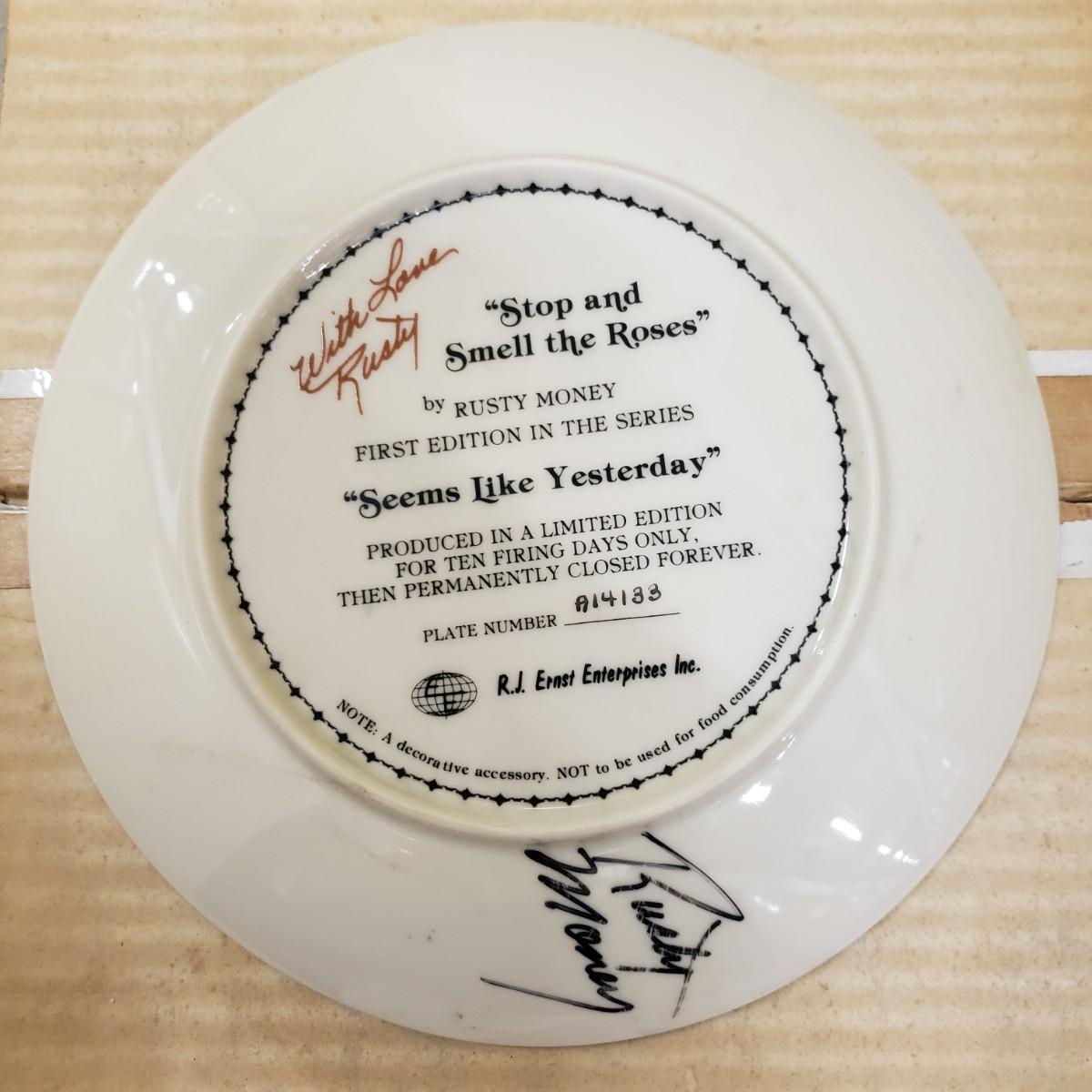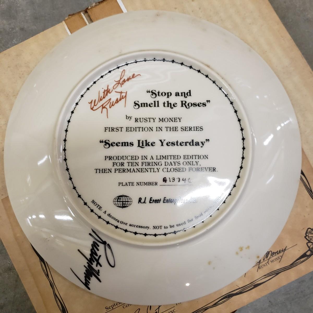 Bing and Grondahl Porcelin "Amalienborg" is 9". "Butterfly" is incased in a wooden frame that measures 10". Wedgewood's "Mother" from 1979 is 6.5". WS George's "Fleeting Encounter" from 1991 measures 8.5". The last are identical plates signed by Rusty Money called, "Stop and Smell the Roses" and measures 8.5". All plates appear to be in good condition.