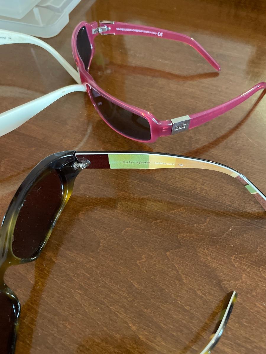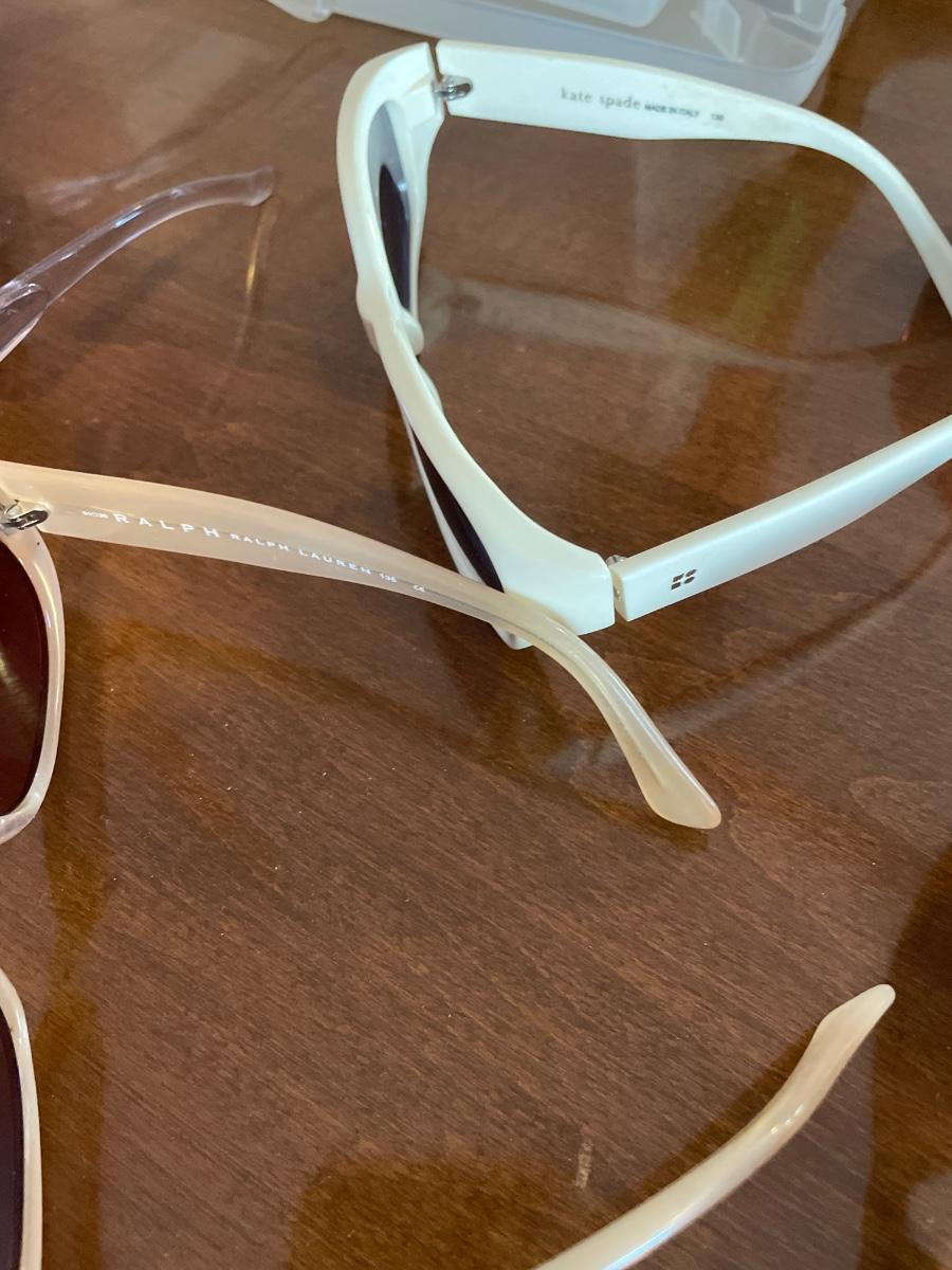 Different brand sunglasses in small tote