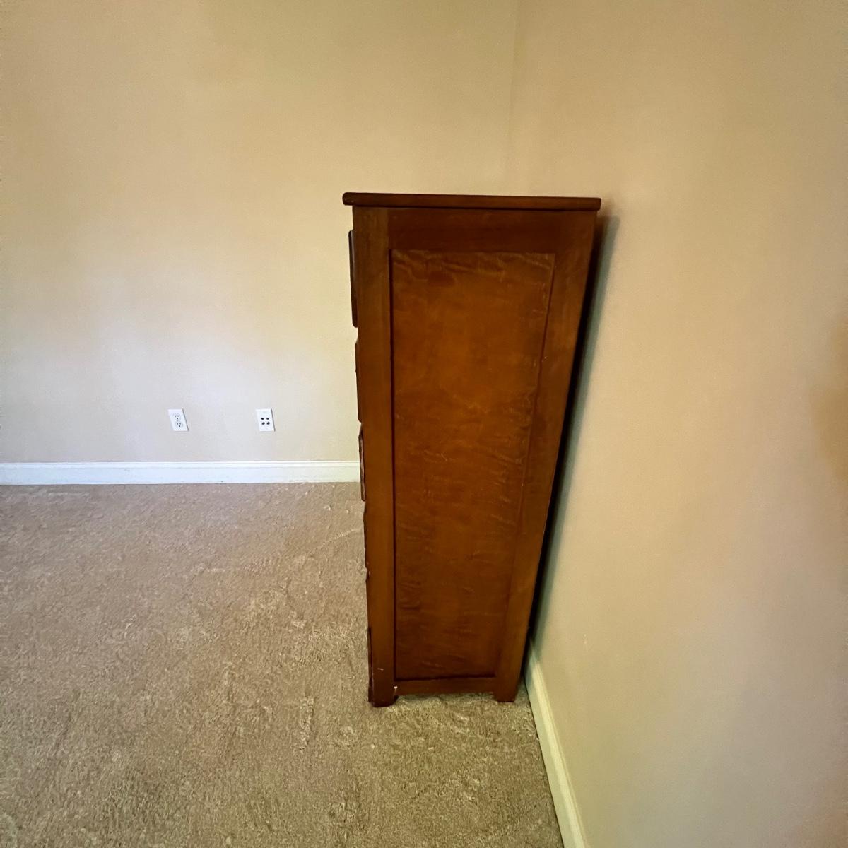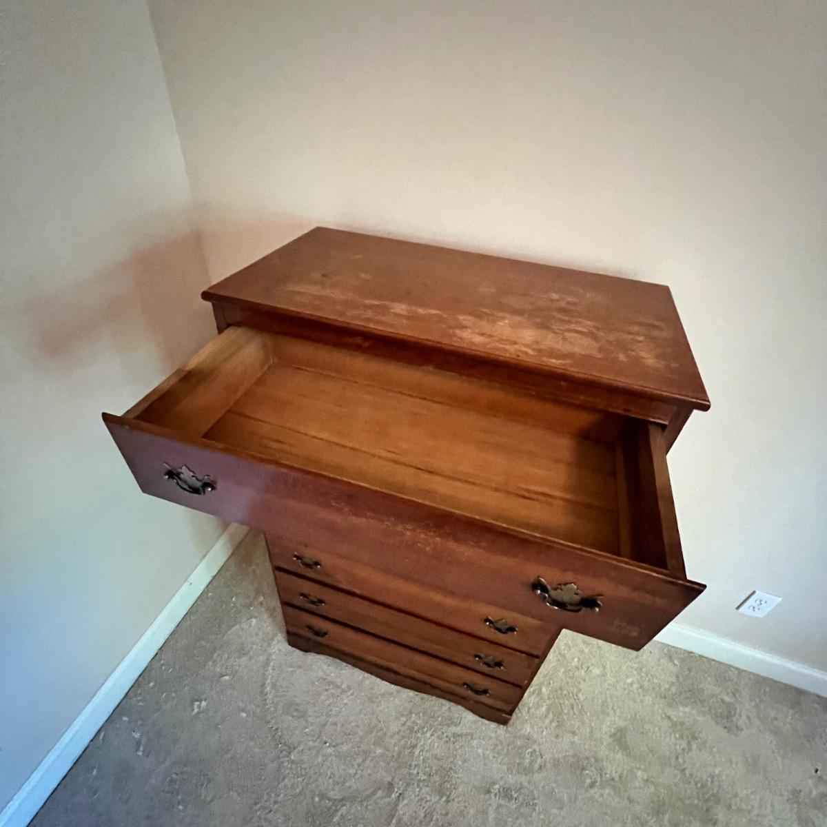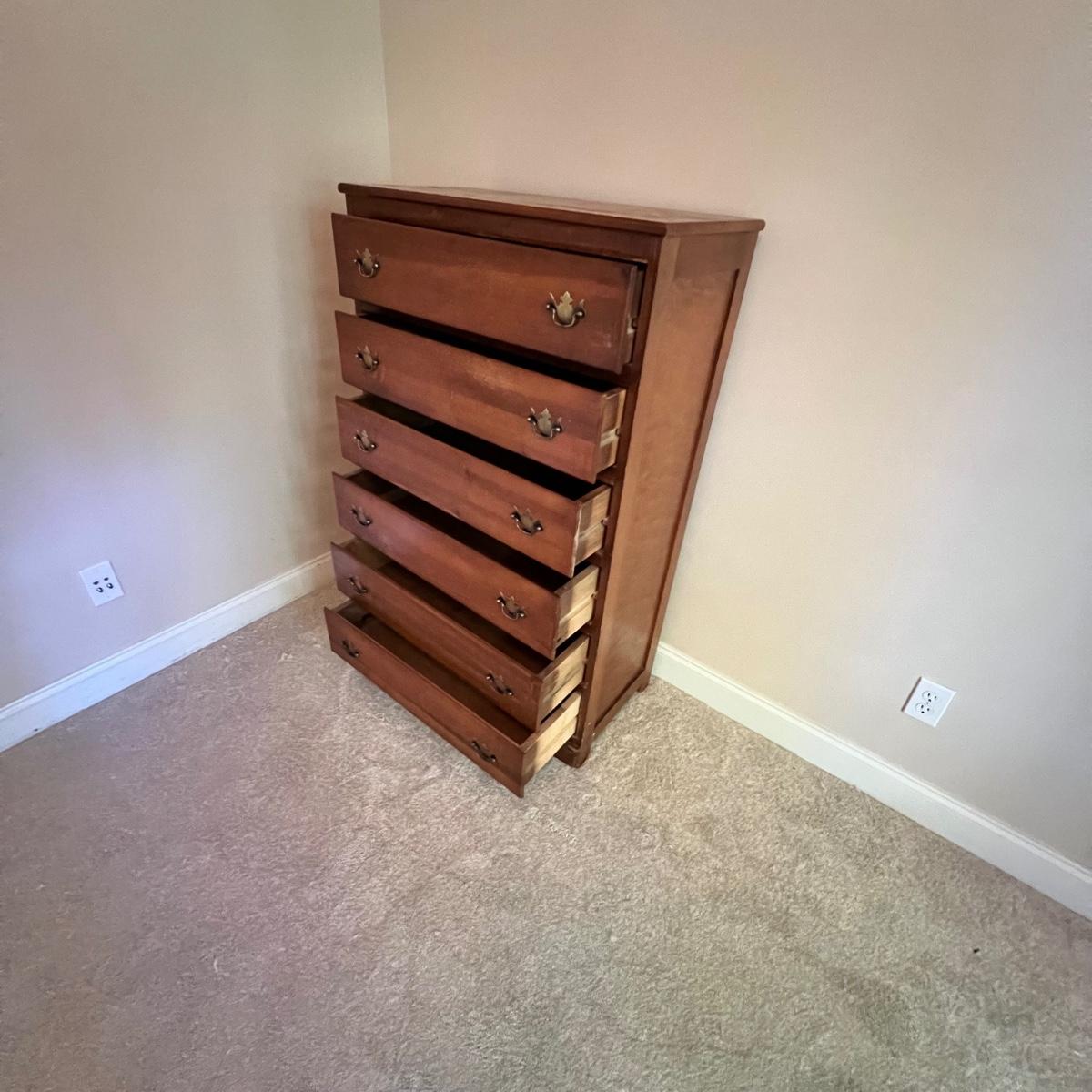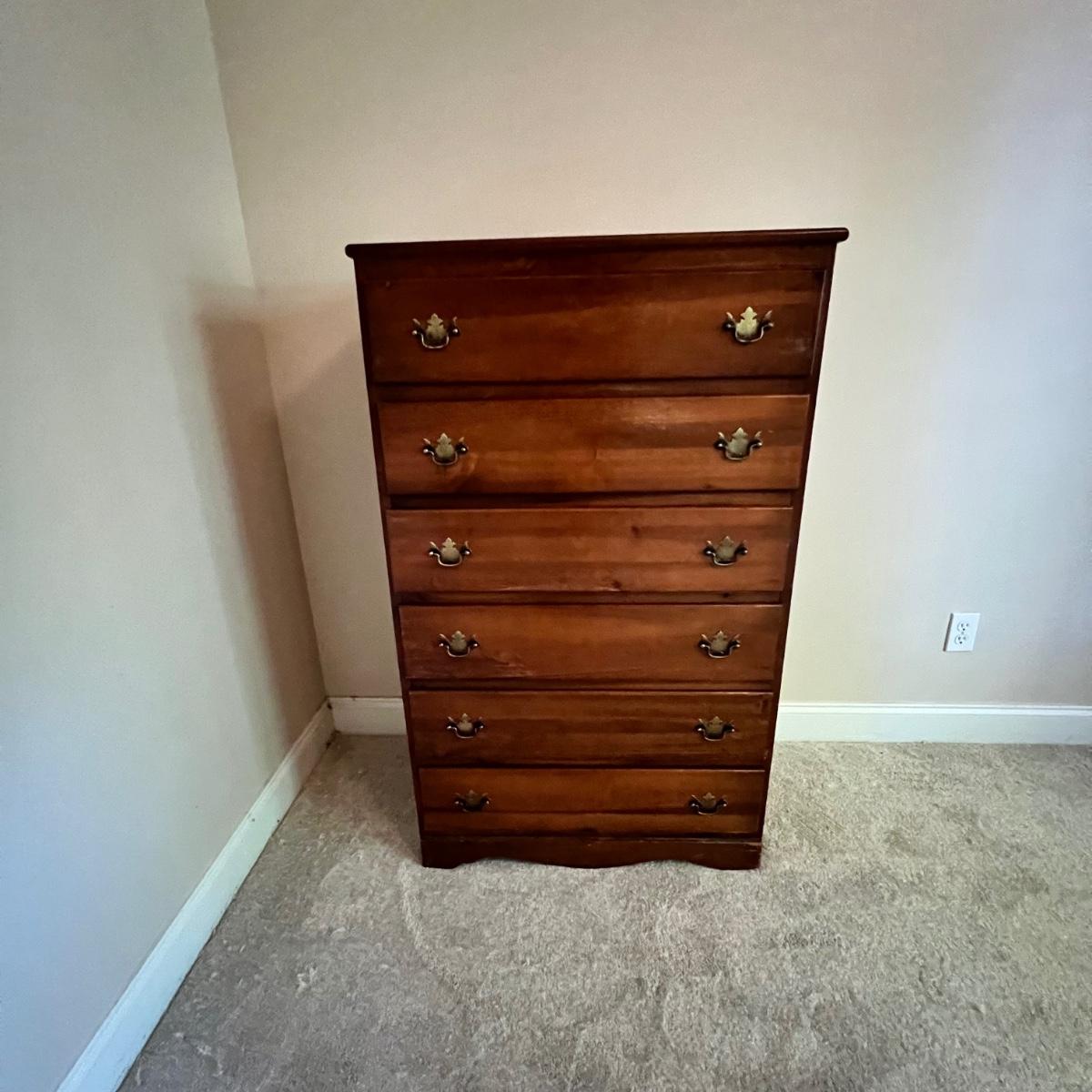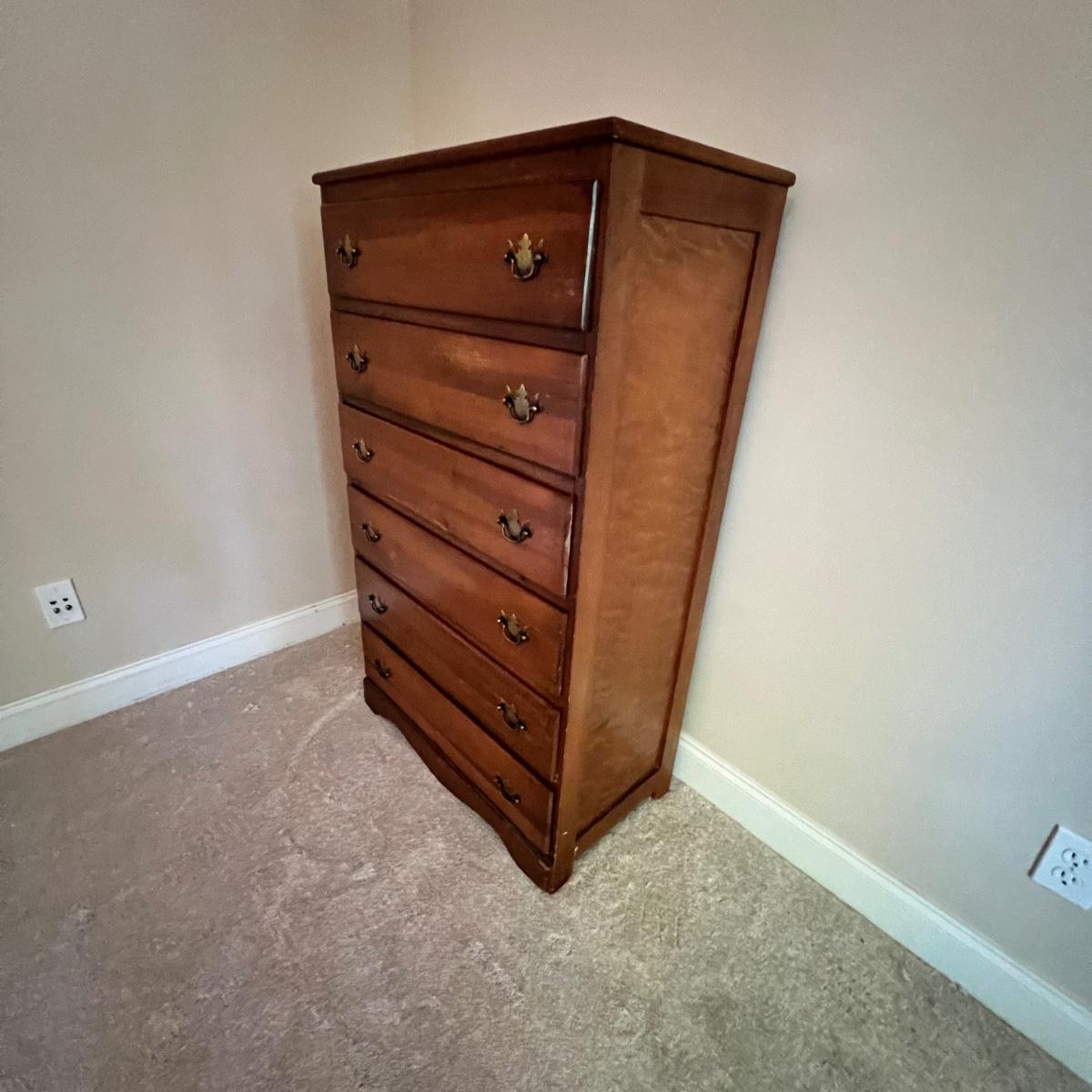 Solid wood dresser with six drawers with brass handles. The finish on the top has worn away a bit, see photo. Fairly lightweight, it measures 30” x 16” x 49.5”H. Dresser is located on the main floor.