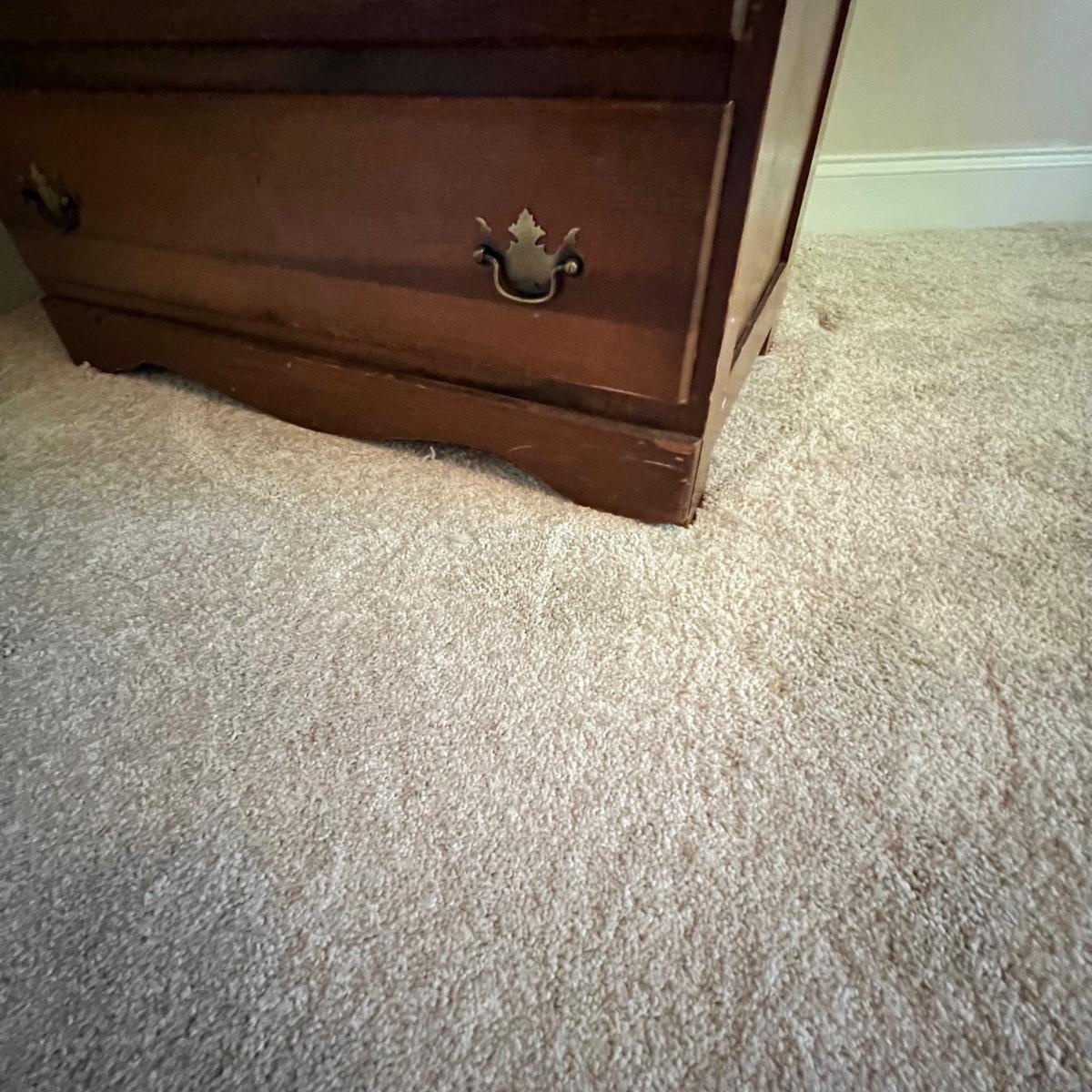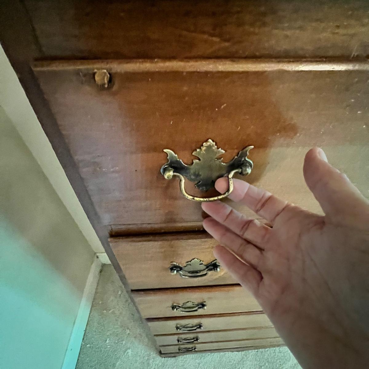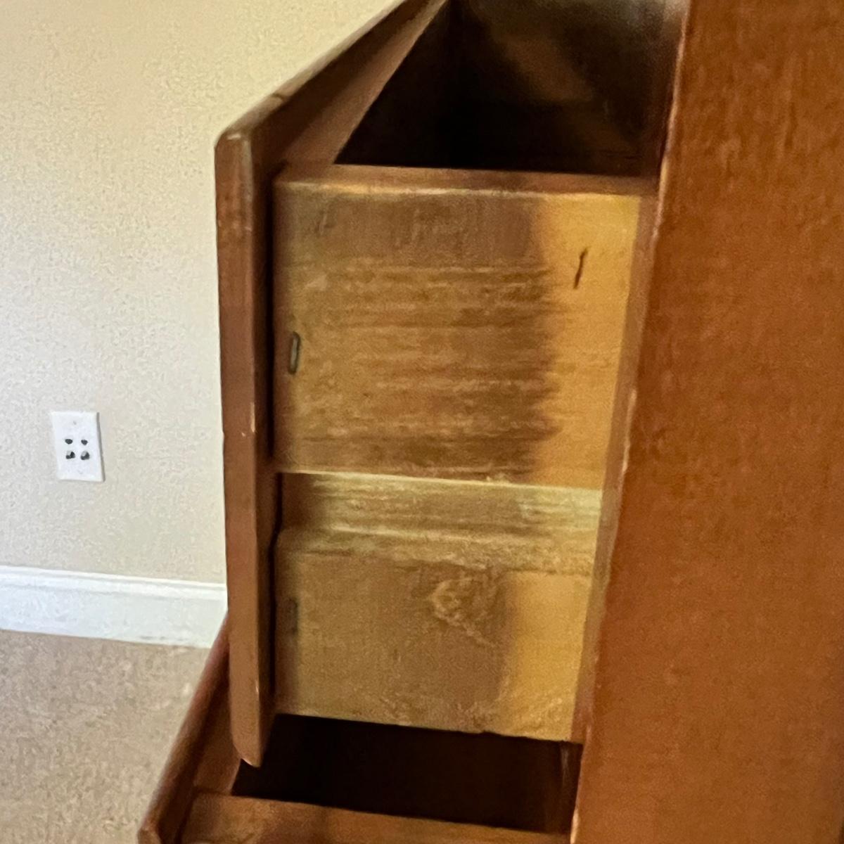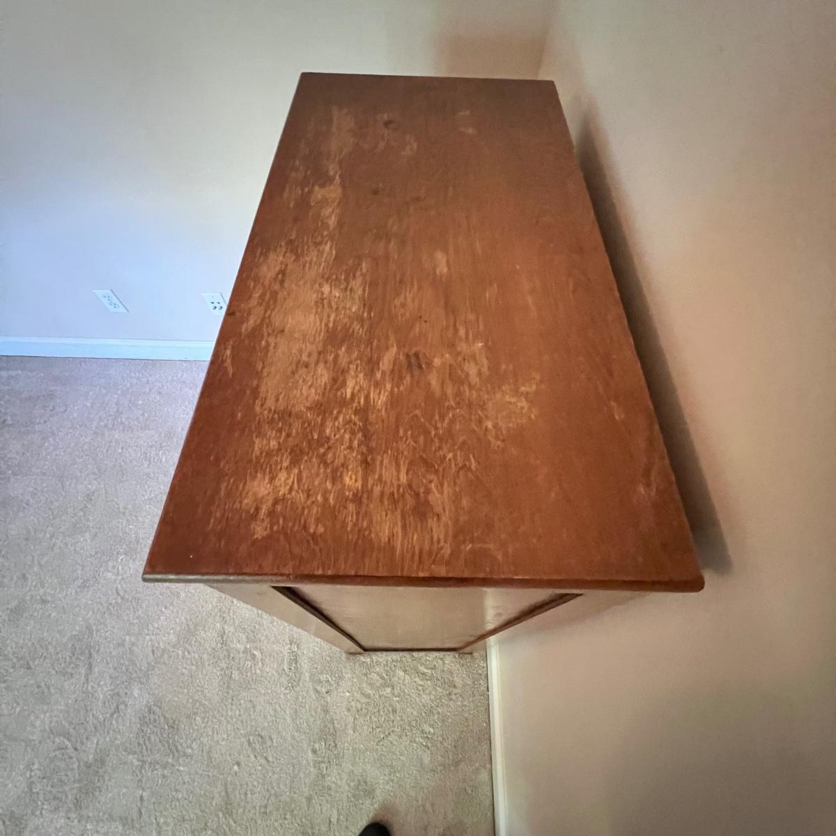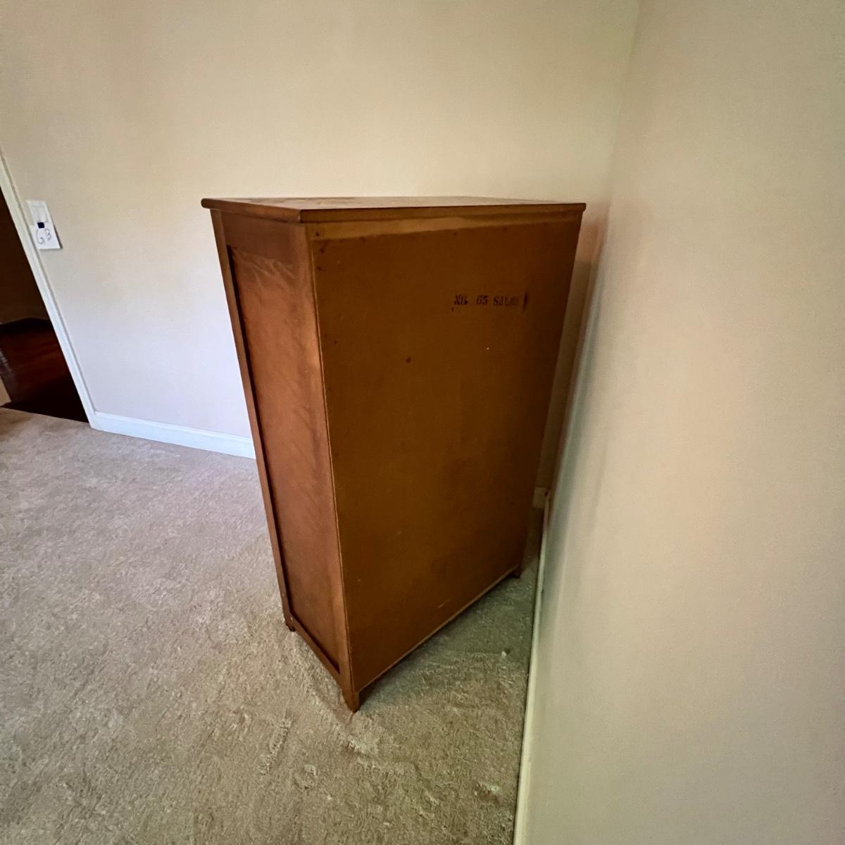 Solid wood dresser with six drawers with brass handles. The finish on the top has worn away a bit, see photo. Fairly lightweight, it measures 30” x 16” x 49.5”H. Dresser is located on the main floor.
