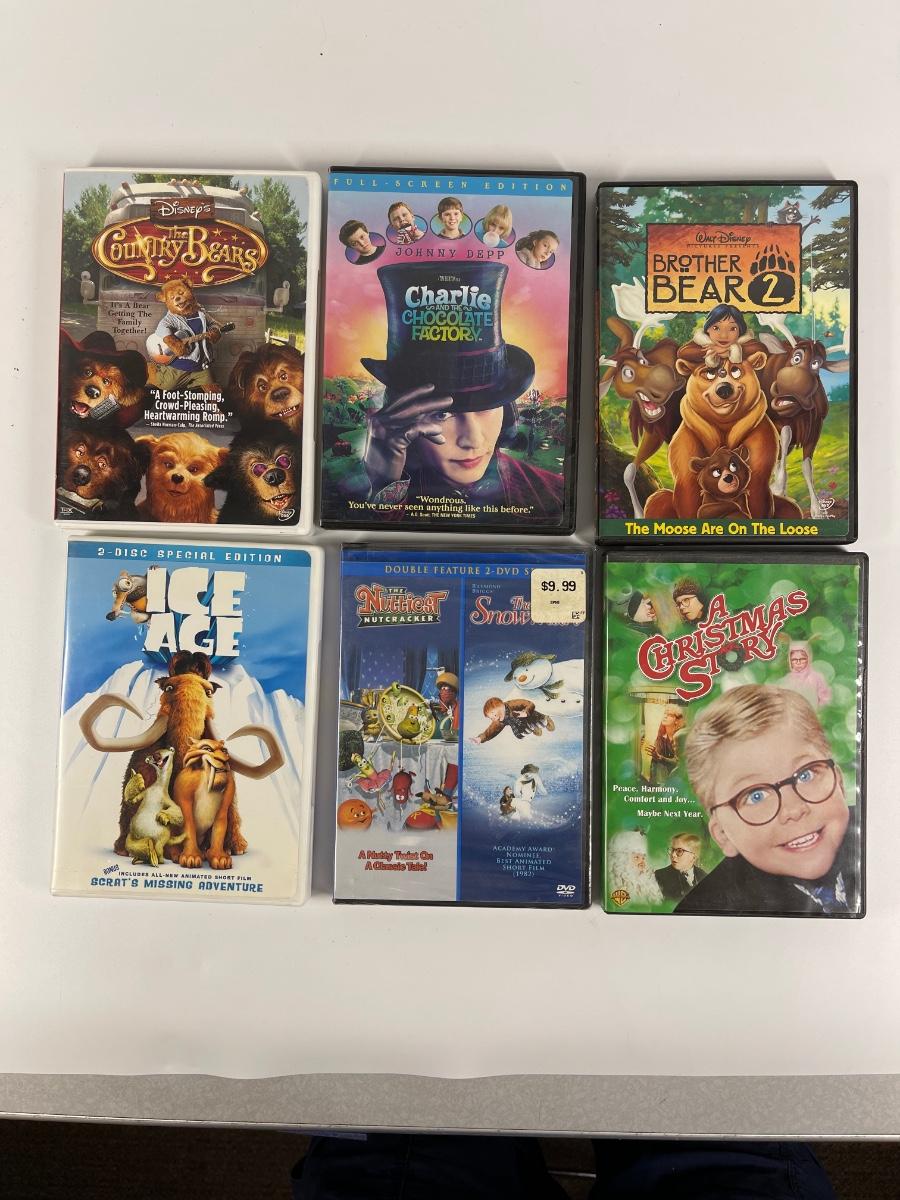 Titles are: The country Bears, Charlie and the chocolate factory, brother Bear too, Ice Age, Christmas story, and the Nuttier nutcracker with the snowman.