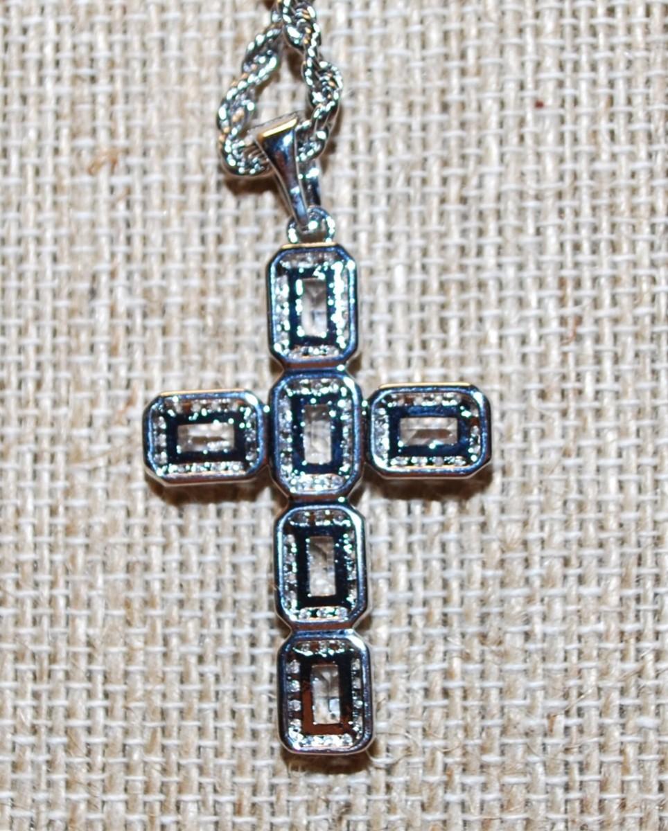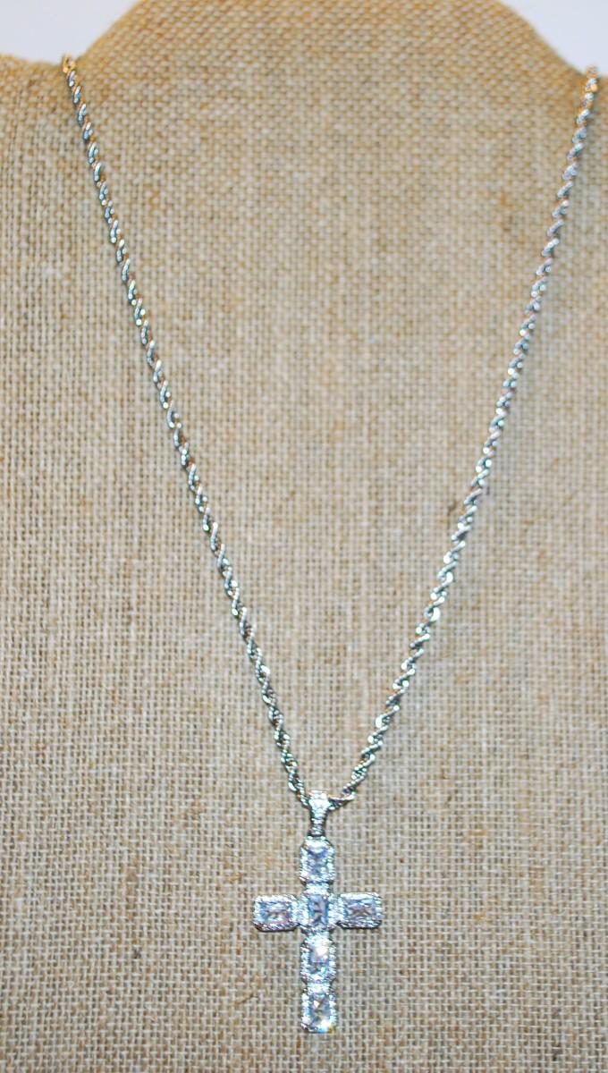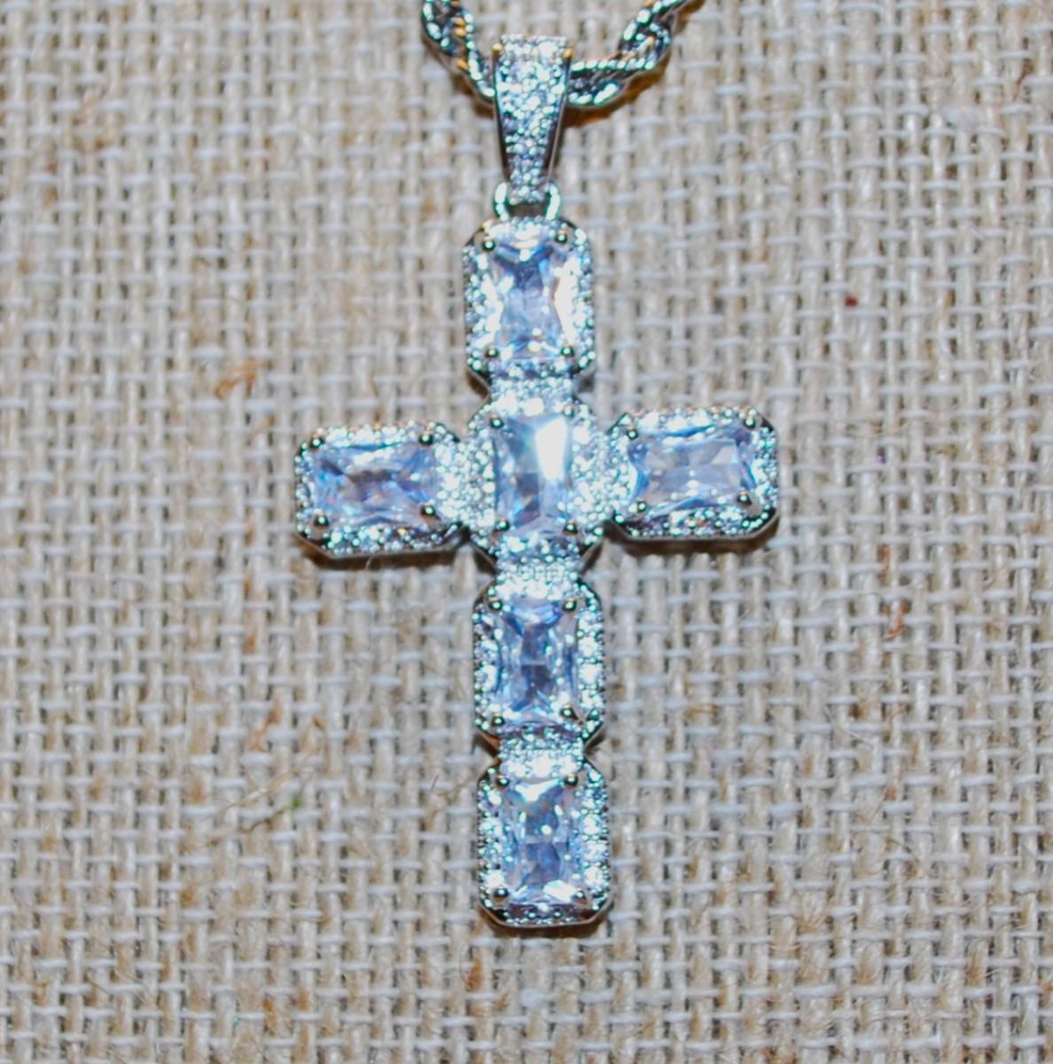 6 Emerald Cut Clear Stone Cross PENDANT (1¾" x 1") on a Silver Tone Rope Style Necklace Chain 22" L