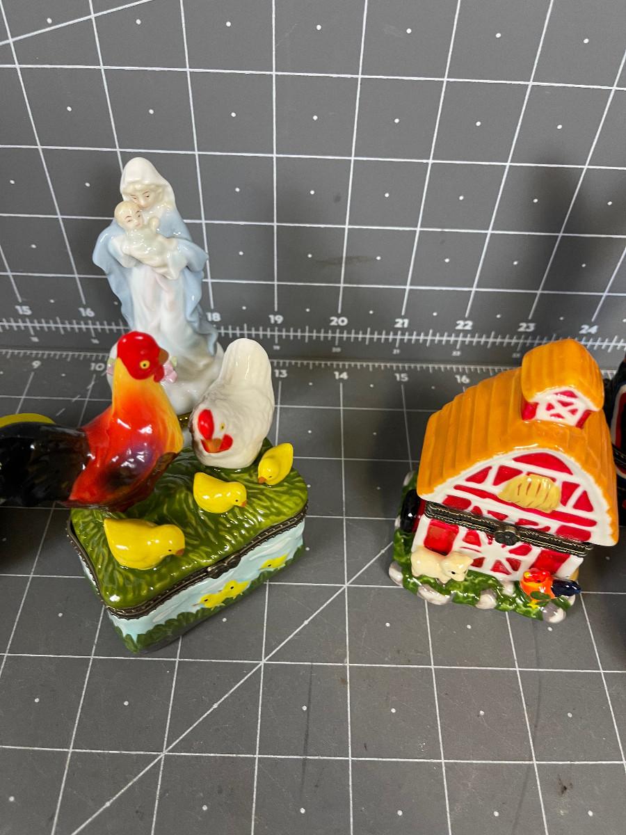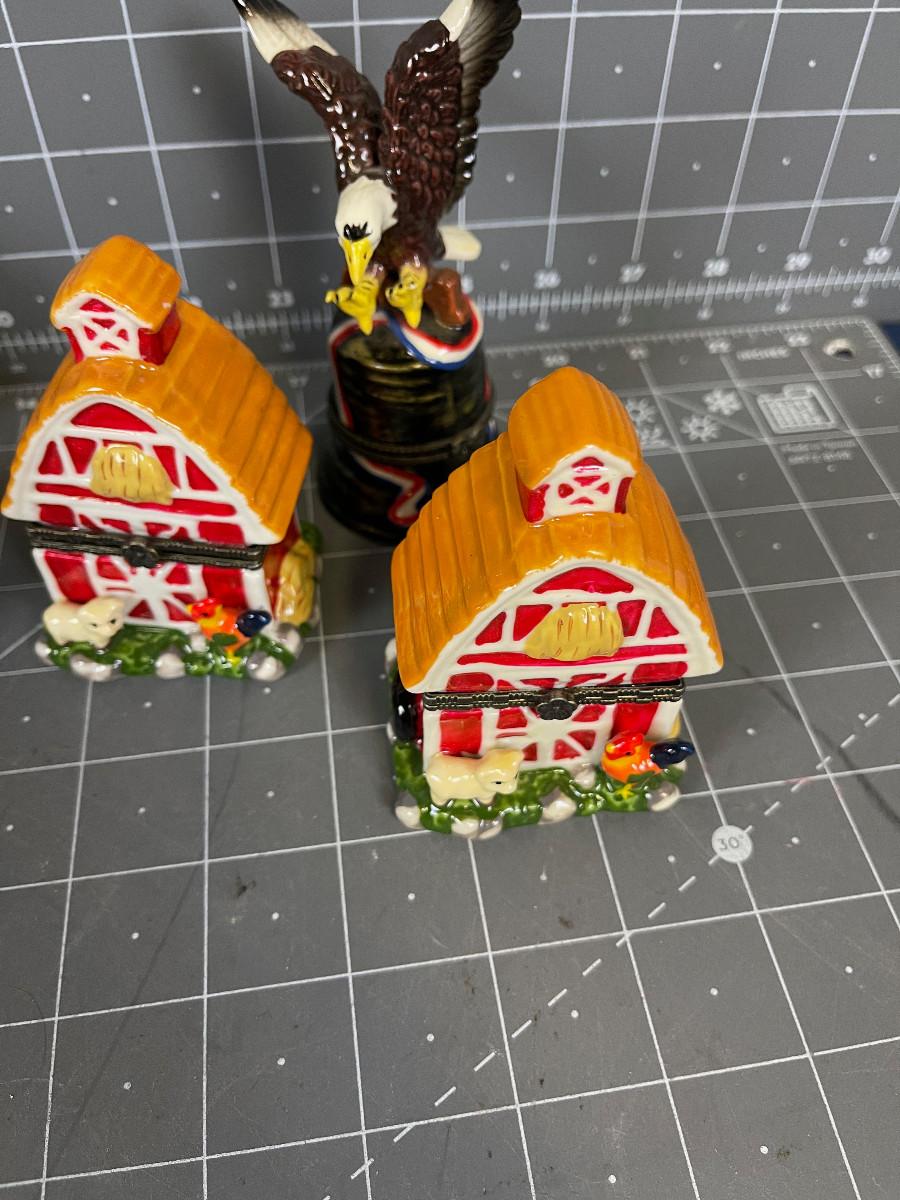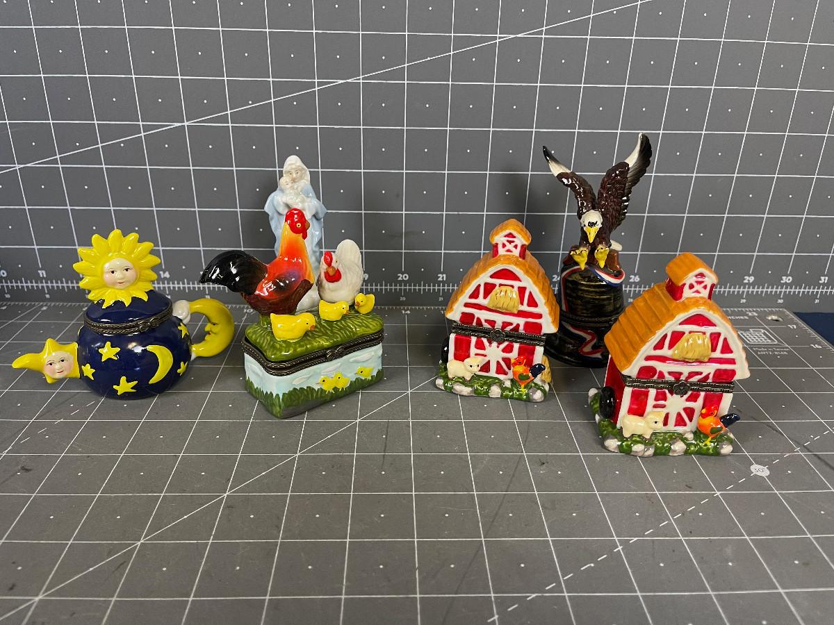 (6) Figural Hinged Boxes: Hens, Barn, Eagle,