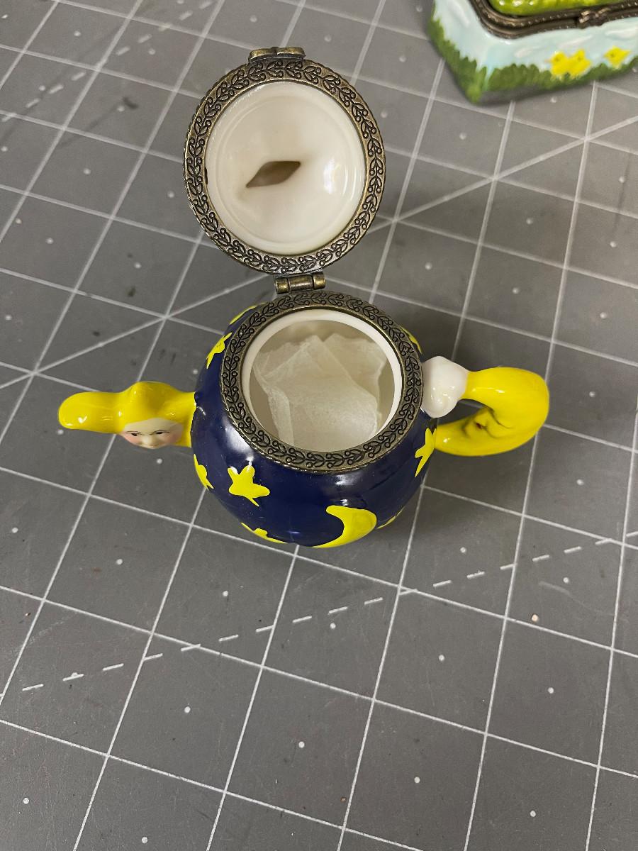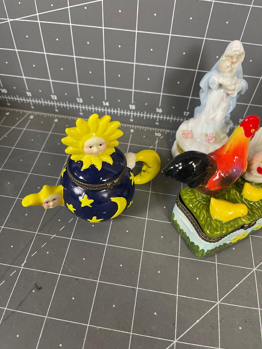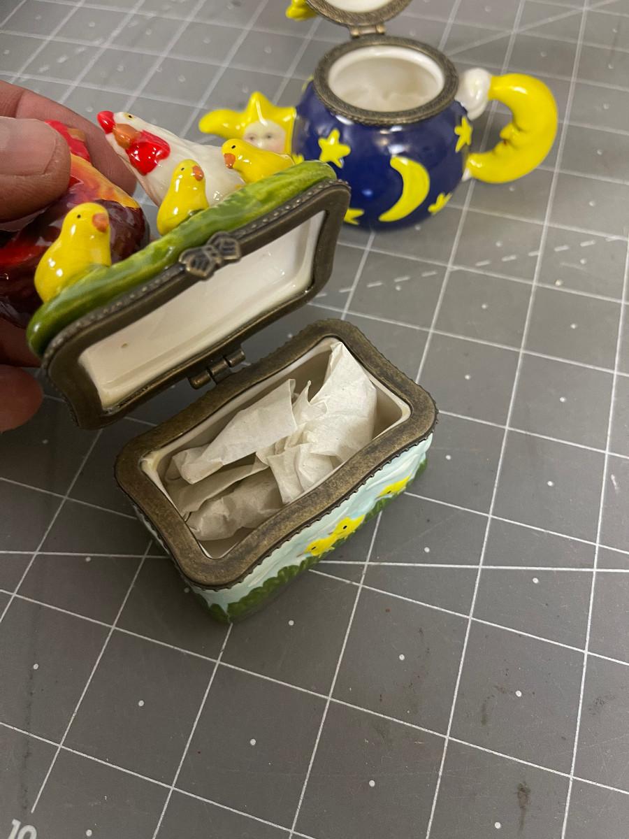 (6) Figural Hinged Boxes: Hens, Barn, Eagle,