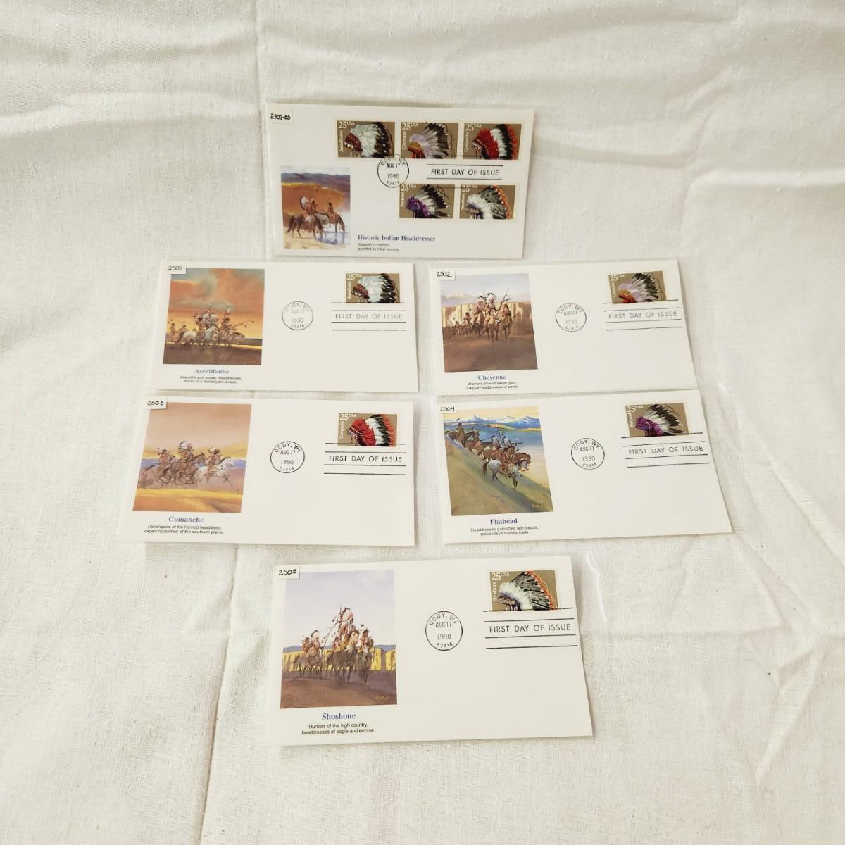 6 - FIRST DAY STAMPS - 1990 HISTORIC INDIAN HEAD DRESS