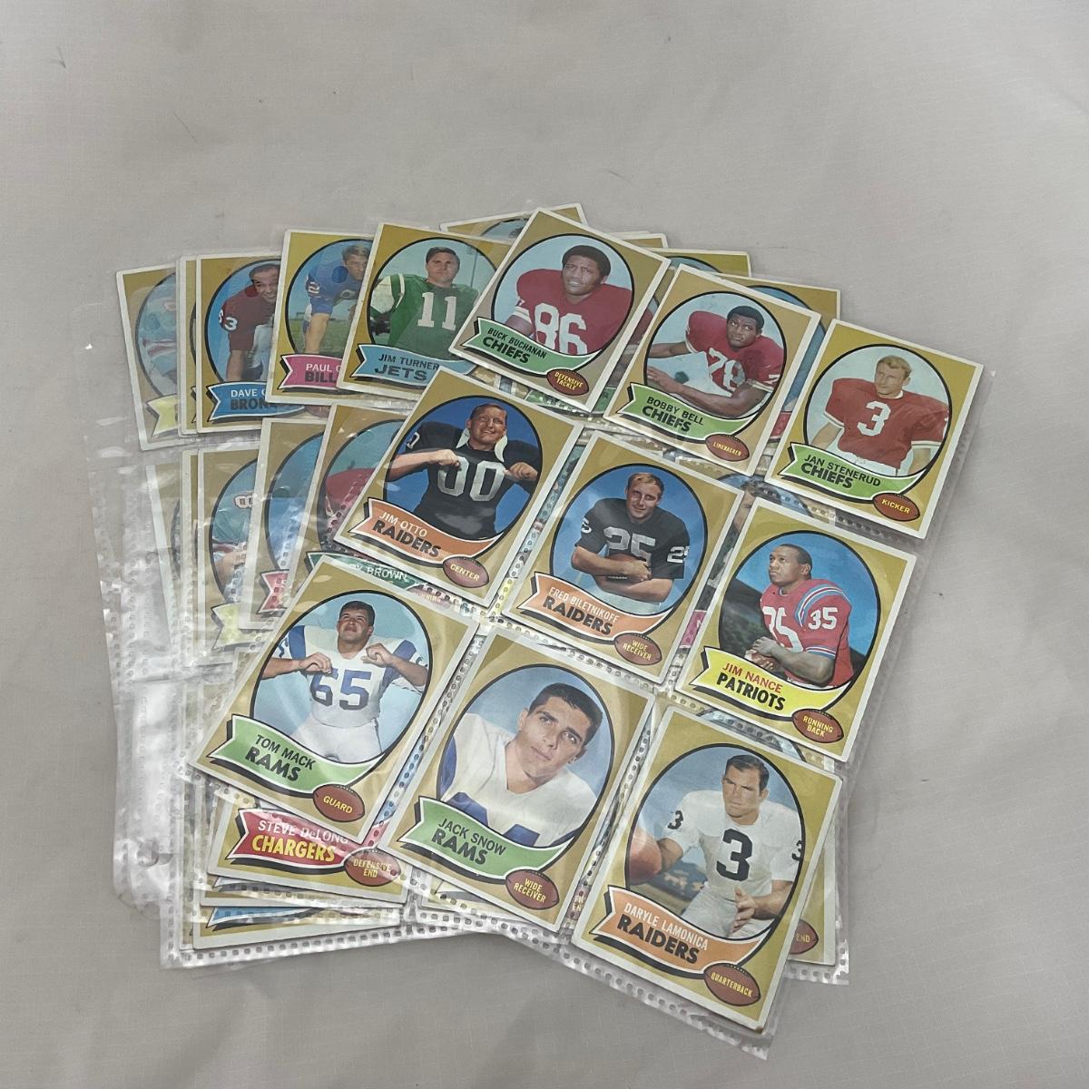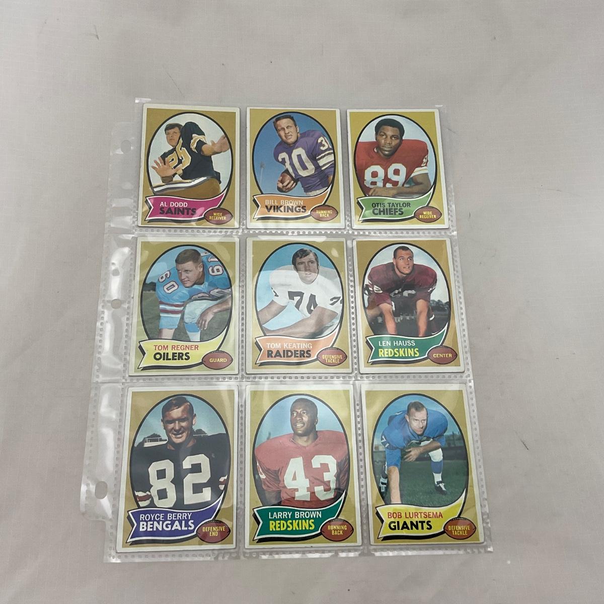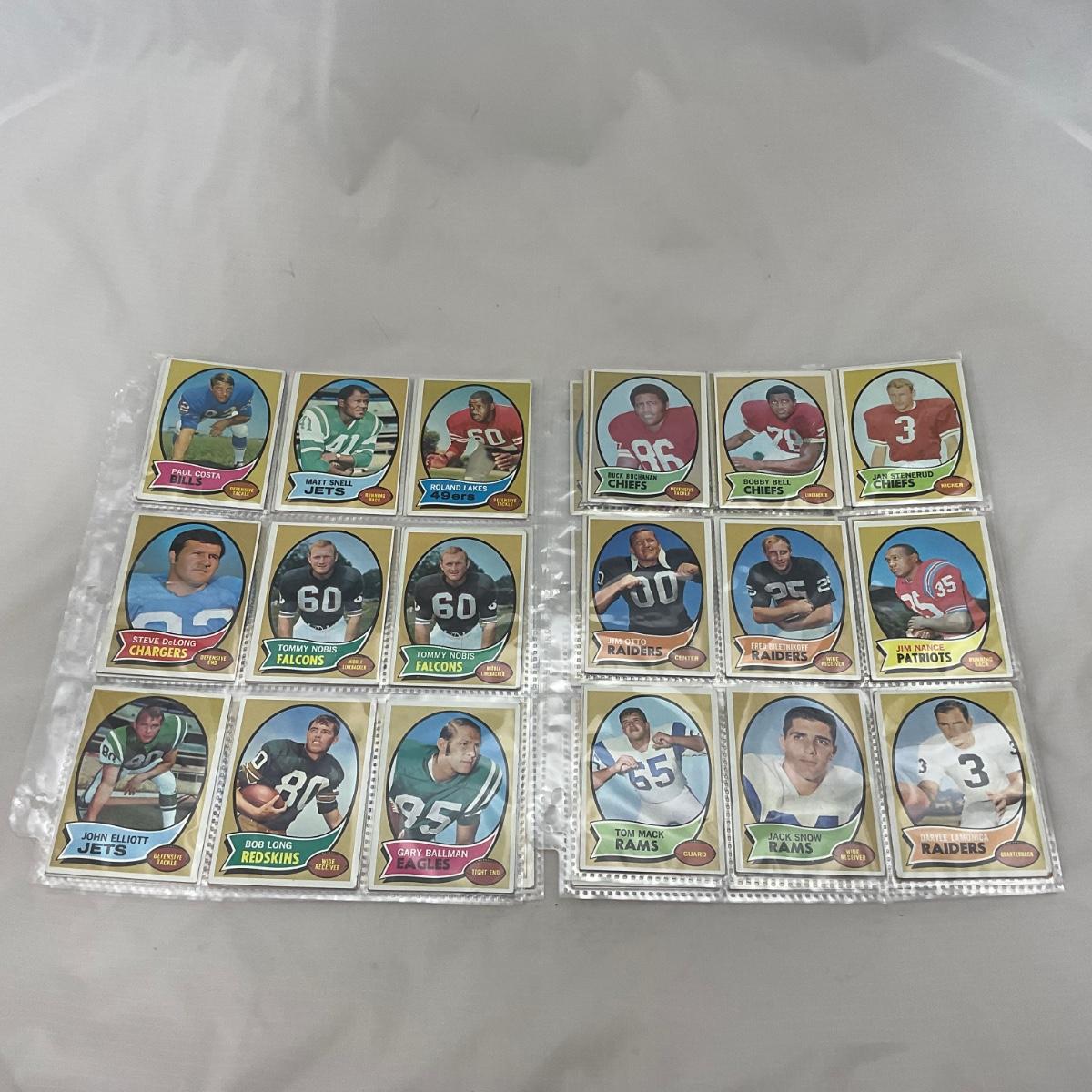 Collection of 1970 vintage football cards. Seven pages of cards. There does seem to be some imperfections on some of the cards, as pictured. The seven pages of cards will come with a binder to transport. Please see photos for details and condition. ::: Shipping is available on this lot. If you require shipping you must let us know at the close of the auction. We will coordinate with you after the item has been won. Shipping fees will include insurance up to or exceeding the value of all items being mailed. If you have any questions regarding this lot please contact the auctioneer either via this website, by direct email or by phone. PICK UP TIMES and other important information can be found in the TERMS and DESCRIPTION of the auction. Please take a look for pertinent information. Thanks!