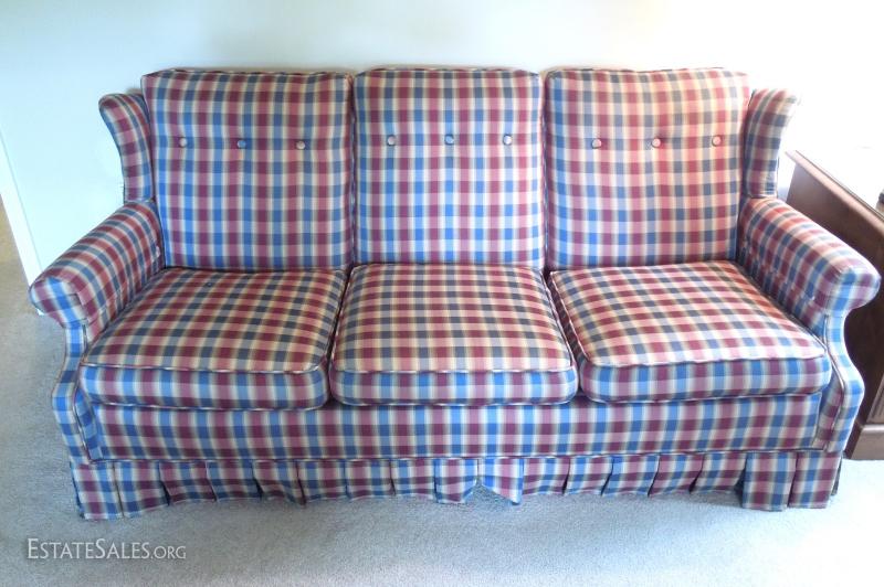 Tufted poly blend fabric. Skirted. appears to be reupholstered. 6 foot long x 32 H x 35 D. Clean. No snags, rips or tears. No manufacturer. Early american style. Matching chair and ottoman being sold separately.