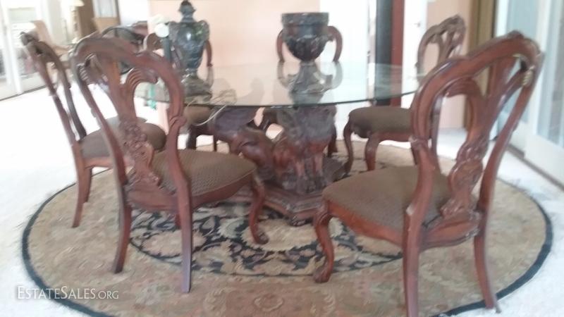 Glass-topped Round Dining Table, carved wood pedistal with 6 Fabric Chairs