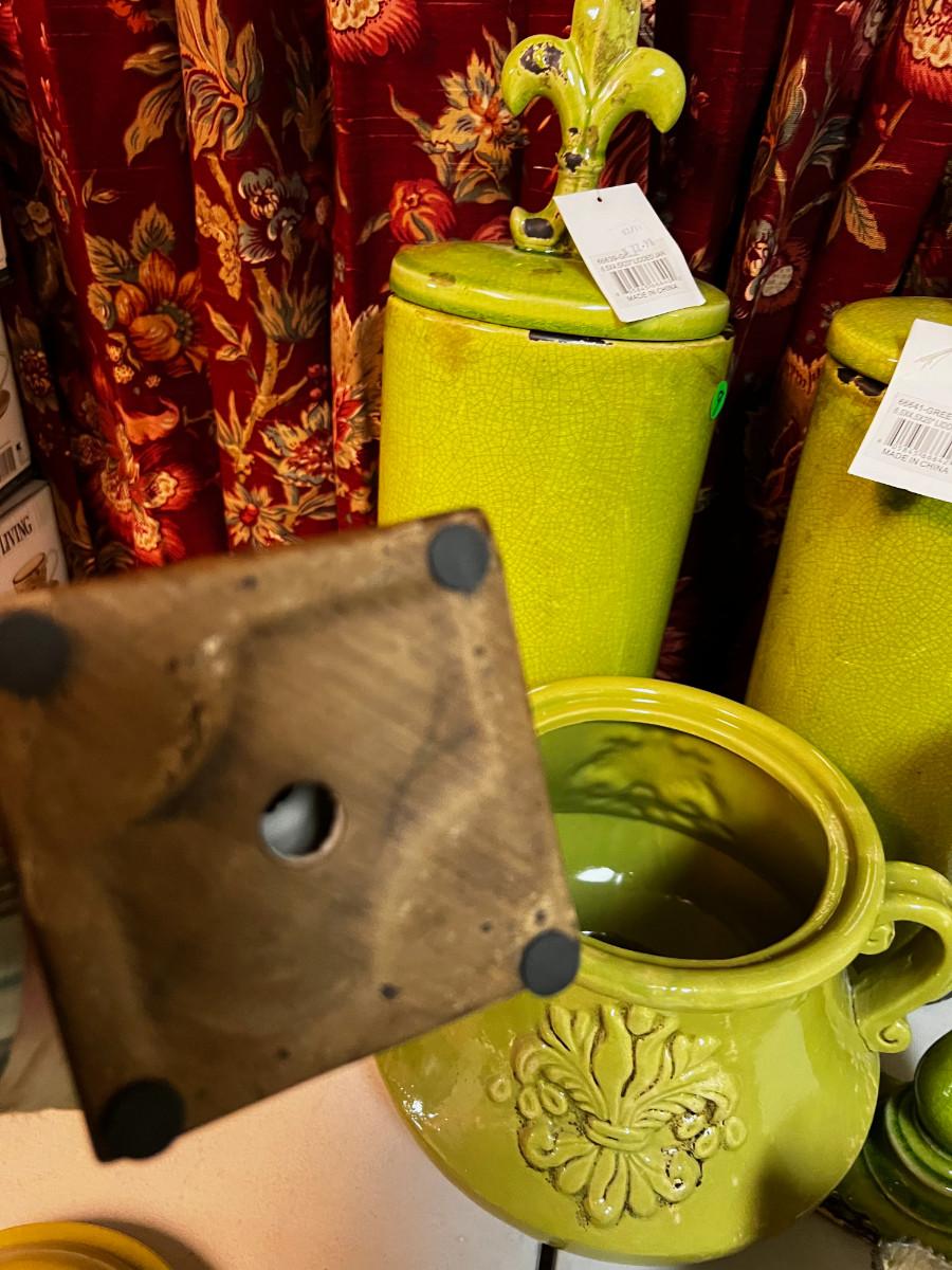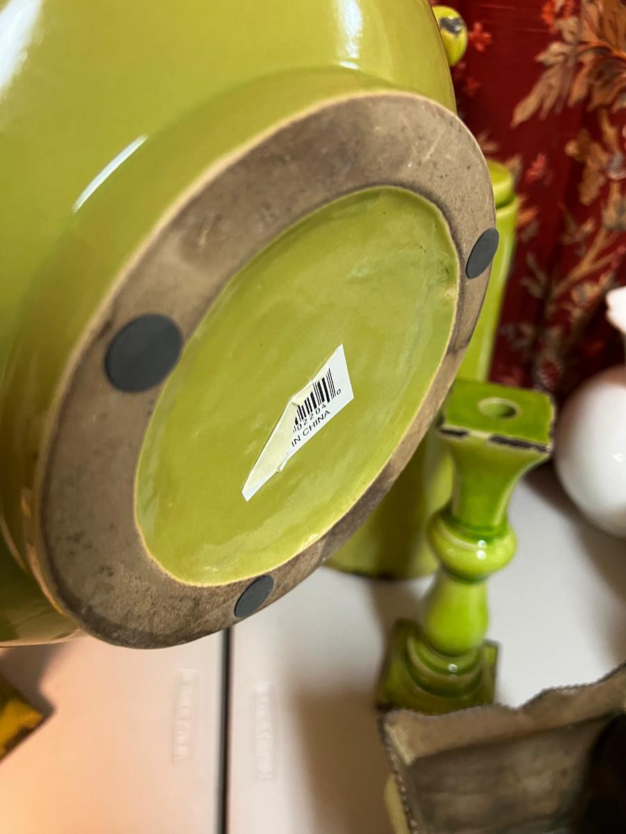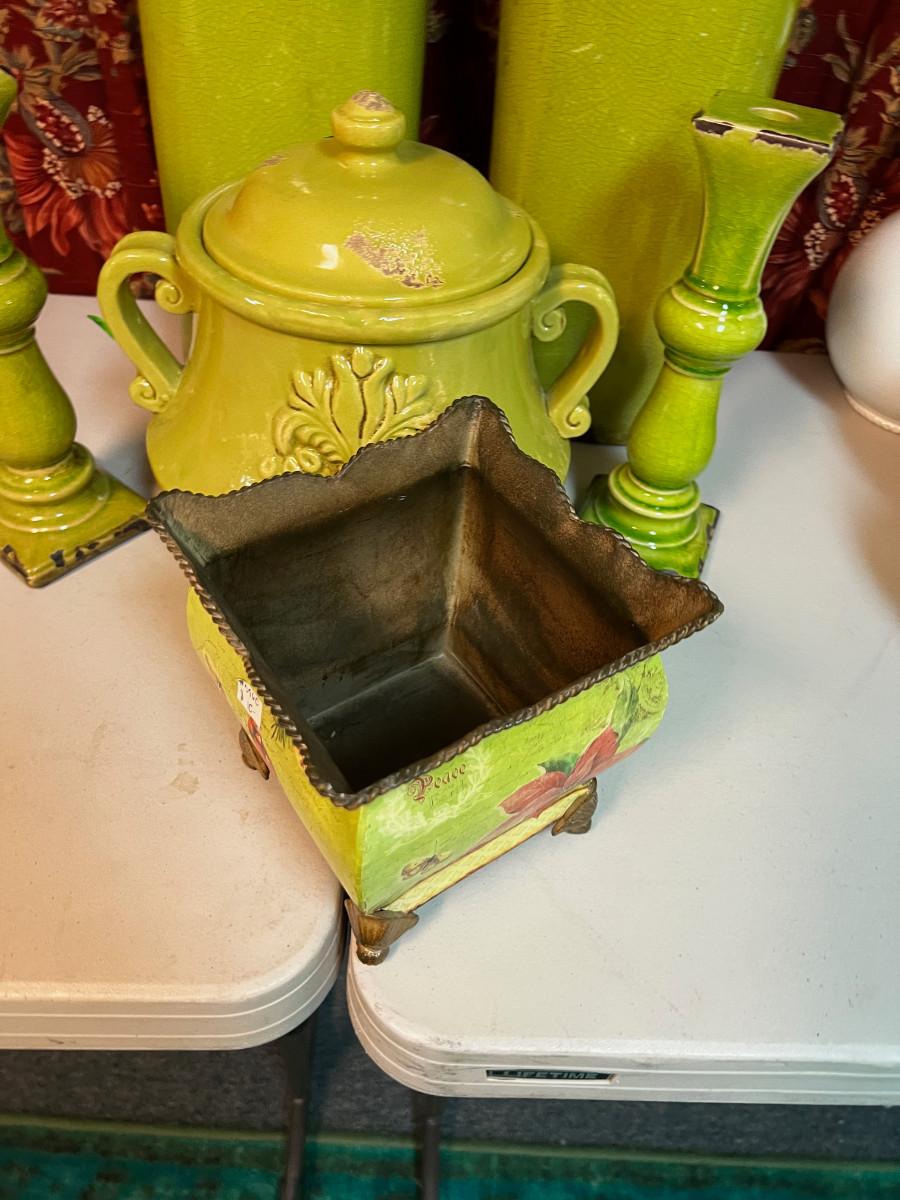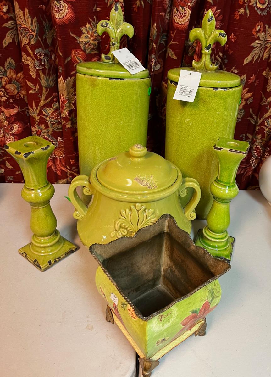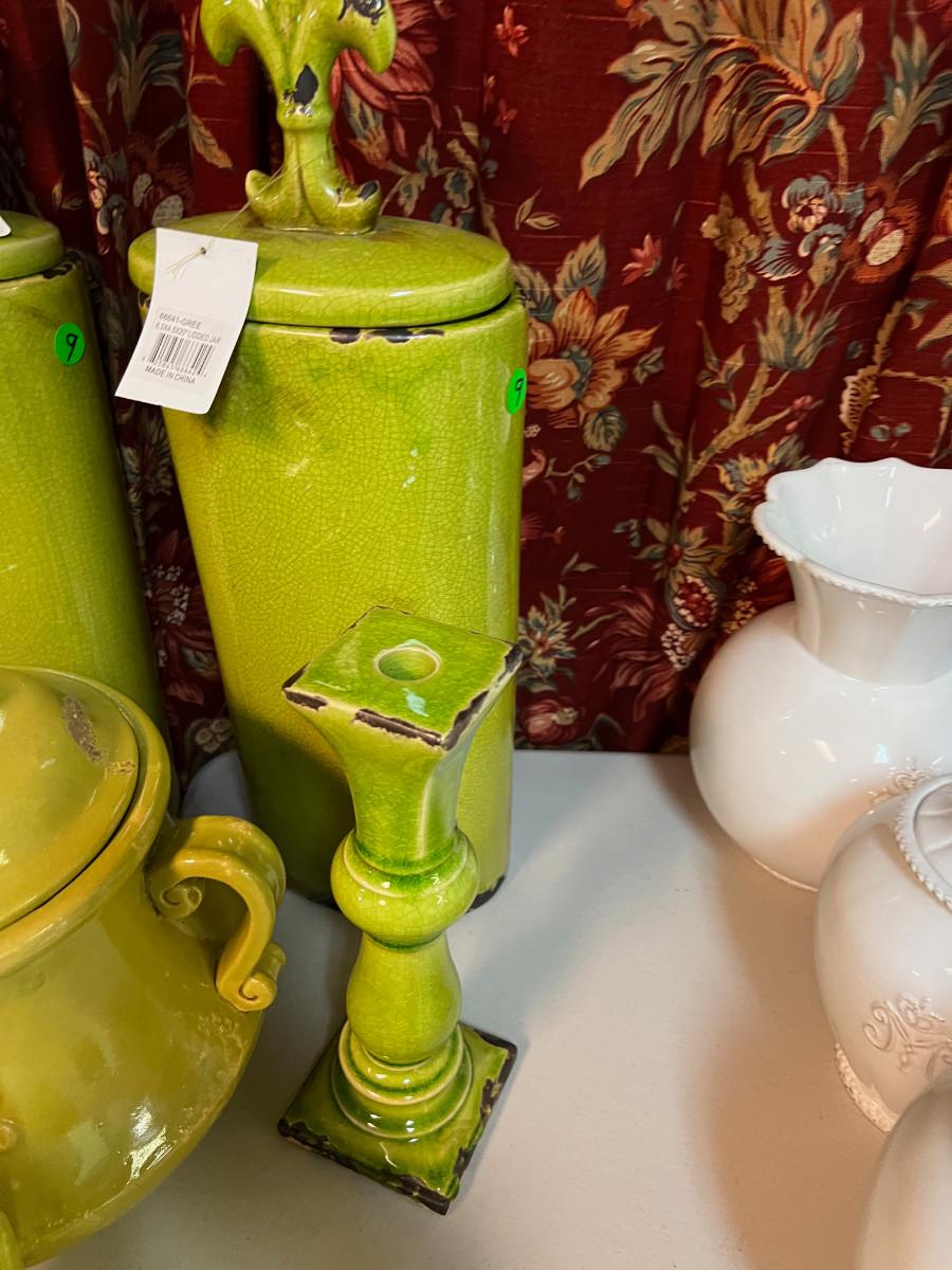6 GREEN Pottery Pieces; Candle Sticks, Jars, Planter