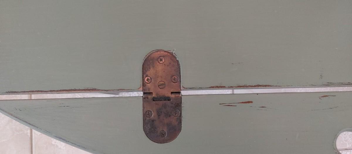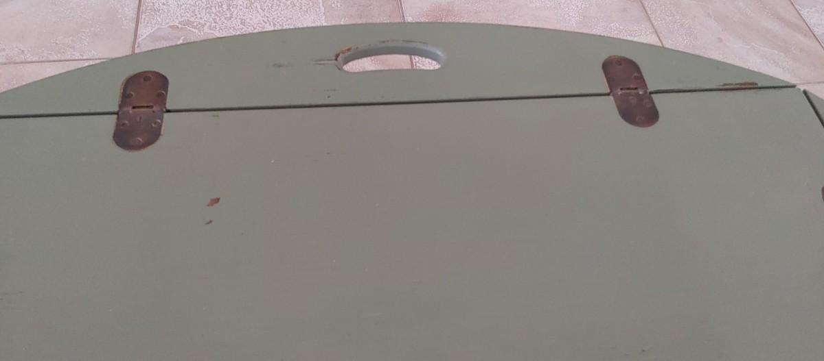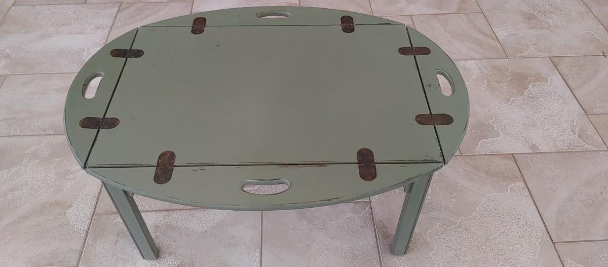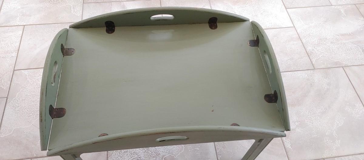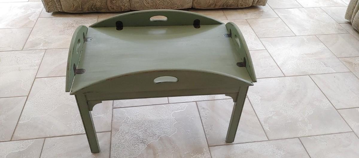 Wonderful hand-painted Butler's tray table old copper Hardware perfectly distressed green. Sides fold up for carrying if needed.