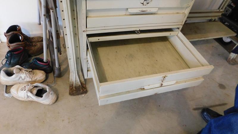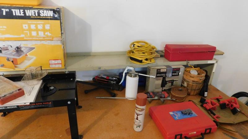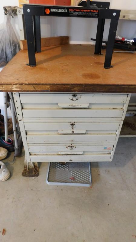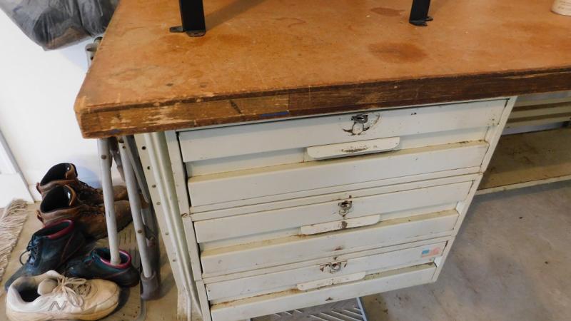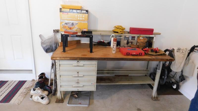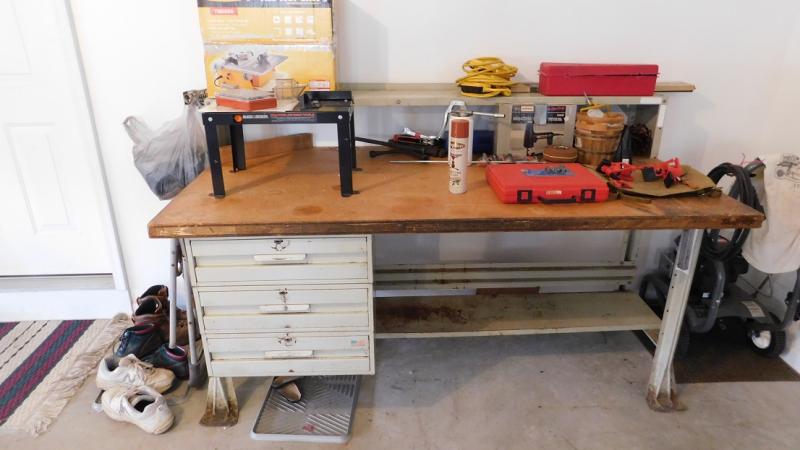 6' Heavy Steel Shop Work Bench with Solid Wood Top. Good condition. Needs cleaning. Contents not included.