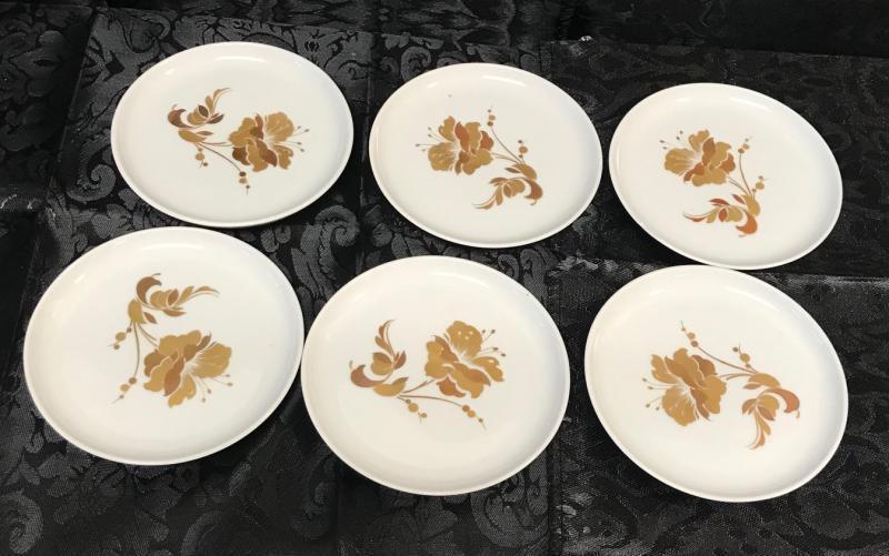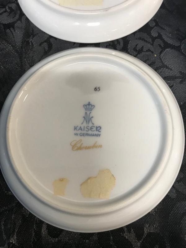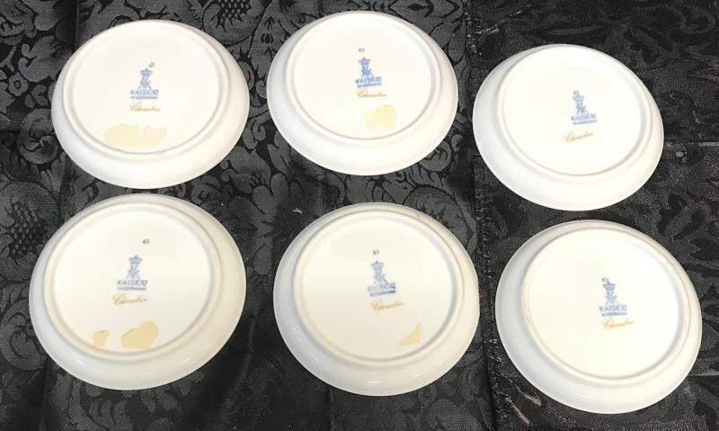 Description: Kaiser stamped "Cherubin"6 gilt saucers. Measurement approximate: 4 W X 3.25 D. Material: Porcelain. Shipping cost $17 Excluding California, Alaska & Hawaii.